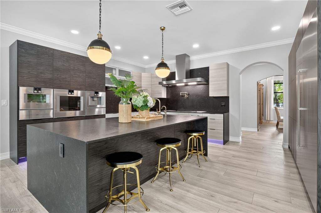This 4,200-square-foot estate home, completed in 2018, is positioned on 2.73 acres in sought-after Weber Woods. Built with an unwavering focus on structural integrity, featuring poured concrete throughout—including the staircases and walls between both stories—this residence was designed for durability, energy efficiency and refined living. Foam insulation, impact-resistant doors and windows and rooftop solar panels significantly minimize electric costs, only property taxes apply, and a $28 monthly electric bill. A portable whole-house generator ensures uninterrupted power, while an advanced ozone-enhanced water filtration system delivers exceptional water quality. Purposefully designed for grand-scale entertaining, the home seamlessly accommodates gatherings exceeding 100 guests. A 1,900-square-foot lanai offers expansive outdoor living space, and the grounds allow for generous guest parking. The driveway was professionally resealed in April 2025, underscoring the homeowners’ commitment to attentive maintenance. The chef-inspired kitchen showcases custom KitchenAid cabinetry with pullouts, drawers and a pot filler, combining form with functionality. The first-floor bedroom with en suite features a zero-threshold shower for ease and comfort. Everyday conveniences include a second-floor laundry chute and an on-demand hot water system. Additional features include a meticulously installed septic system. Merging architectural precision with eco-forward enhancements, this residence offers an elevated lifestyle in one of Naples’ premier residential communities.