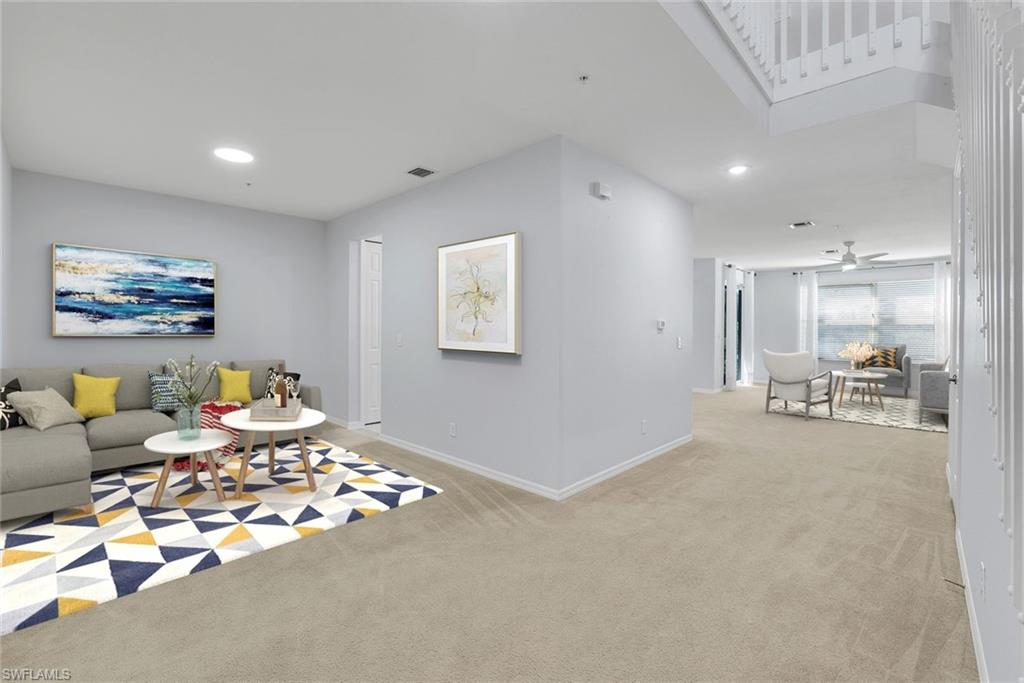 Experience refined living in this elegantly upgraded 3-bedroom, 2.5-bathroom townhome, perfectly situated in the sought-after gated community of Mariposa at Whippoorwill. Sophisticated style meets effortless comfort in this spacious residence, featuring a 2-car attached garage with custom built-in cabinetry and a tranquil screened-in lanai that overlooks a picturesque lake—your own private retreat for morning coffee or evening relaxation. Inside, every detail has been thoughtfully curated. Rich luxury vinyl plank flooring flows throughout the home, complemented by crown molding and designer shiplap accents that elevate the ambiance. The living room exudes warmth and charm with a custom electric fireplace framed by built-in shelving, creating an inviting space ideal for both everyday living and intimate gatherings. The open-concept kitchen offers a perfect blend of form and function with a breakfast bar, eat-in dining area, and an additional formal dining room, all designed with entertaining in mind. A well-appointed powder room completes the first floor. Upstairs, the serene primary suite serves as a private sanctuary, featuring an ensuite bath with an indulgent soaking tub and ample closet space. Two additional guest bedrooms, a full bath, and a convenient laundry room ensure comfort and practicality for family and visitors alike. The versatile loft provides endless possibilities—home office, media lounge, or game room—tailored to your lifestyle. Mariposa residents enjoy resort-style amenities including a beautifully appointed clubhouse, fitness center, and a sparkling lakeside pool. Centrally located in Naples, this exceptional home offers effortless access to world-class shopping, dining, and the pristine beaches of Southwest Florida. Indulge in luxurious living in this meticulously updated townhome—an exceptional opportunity in a premier Naples location.