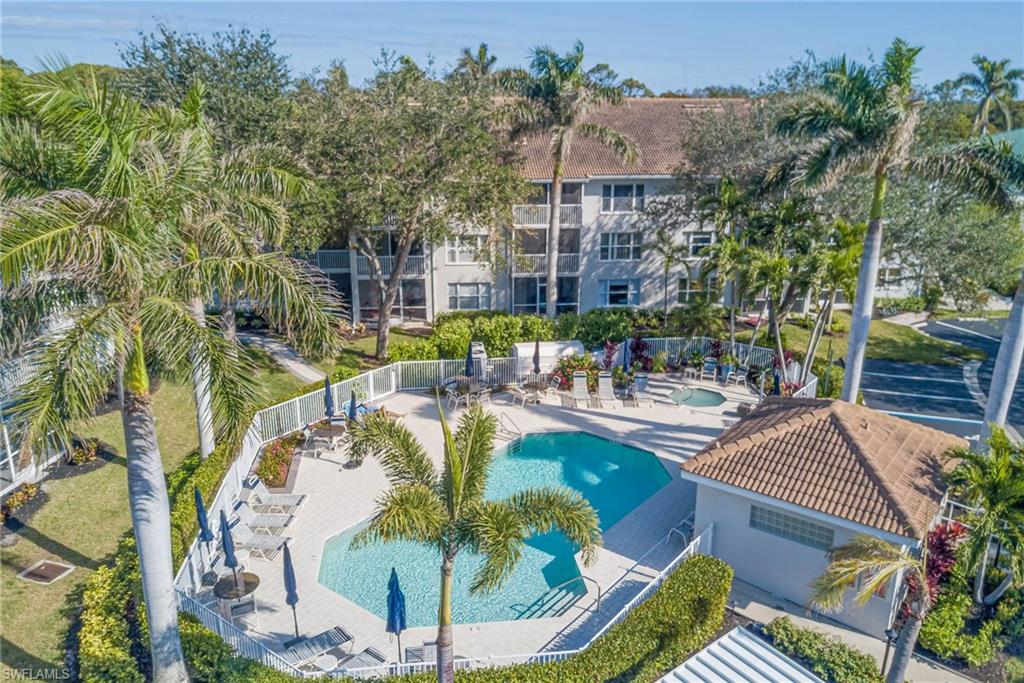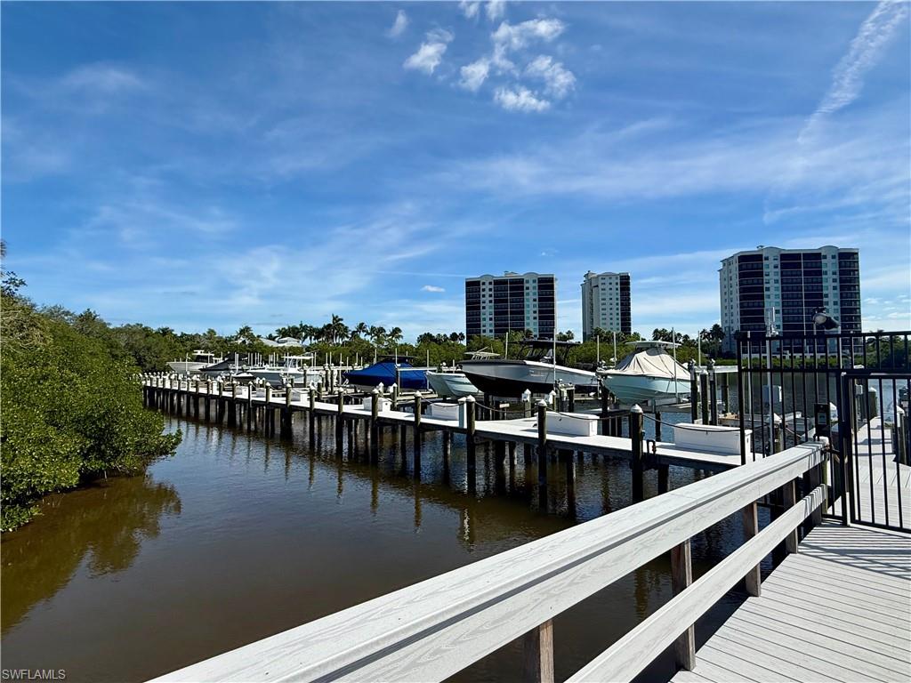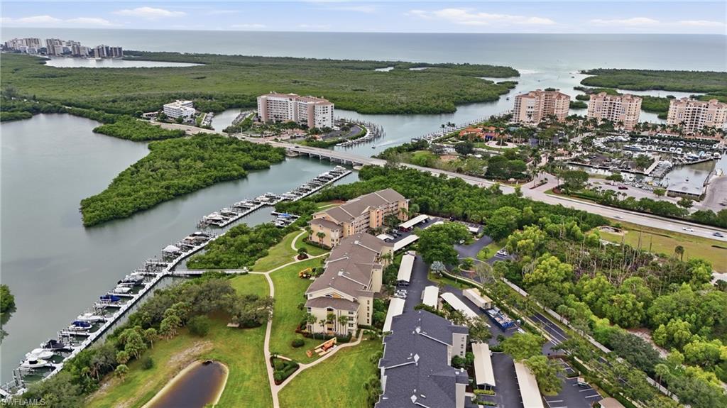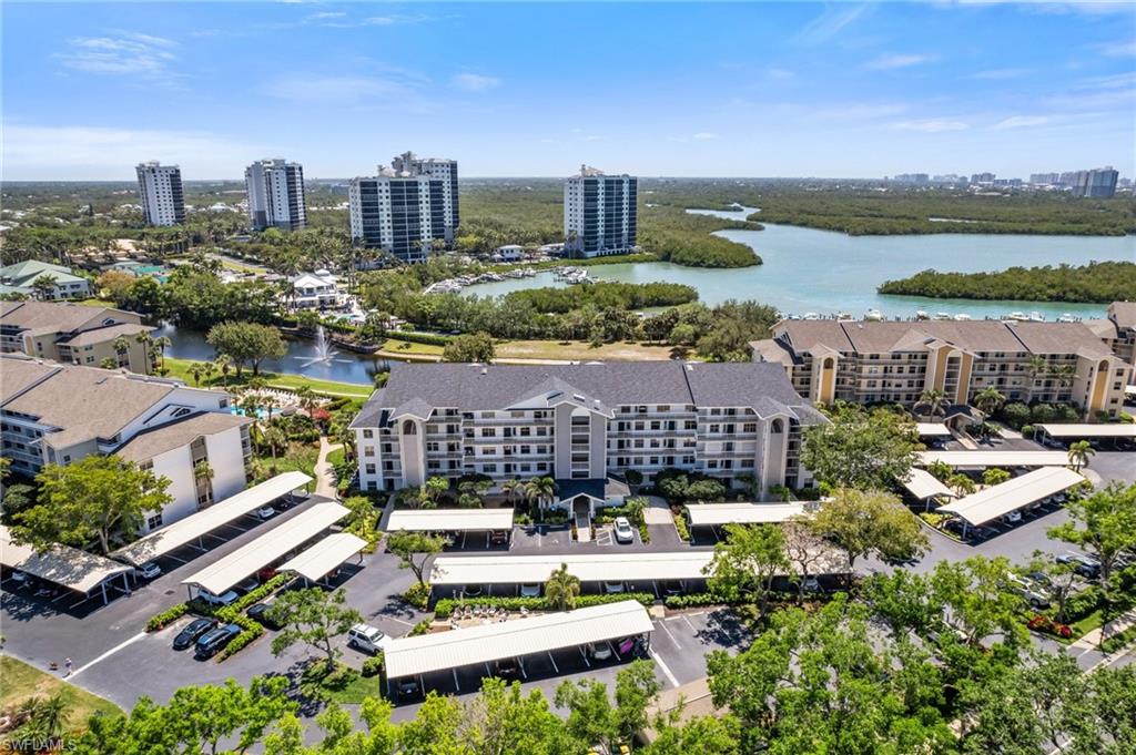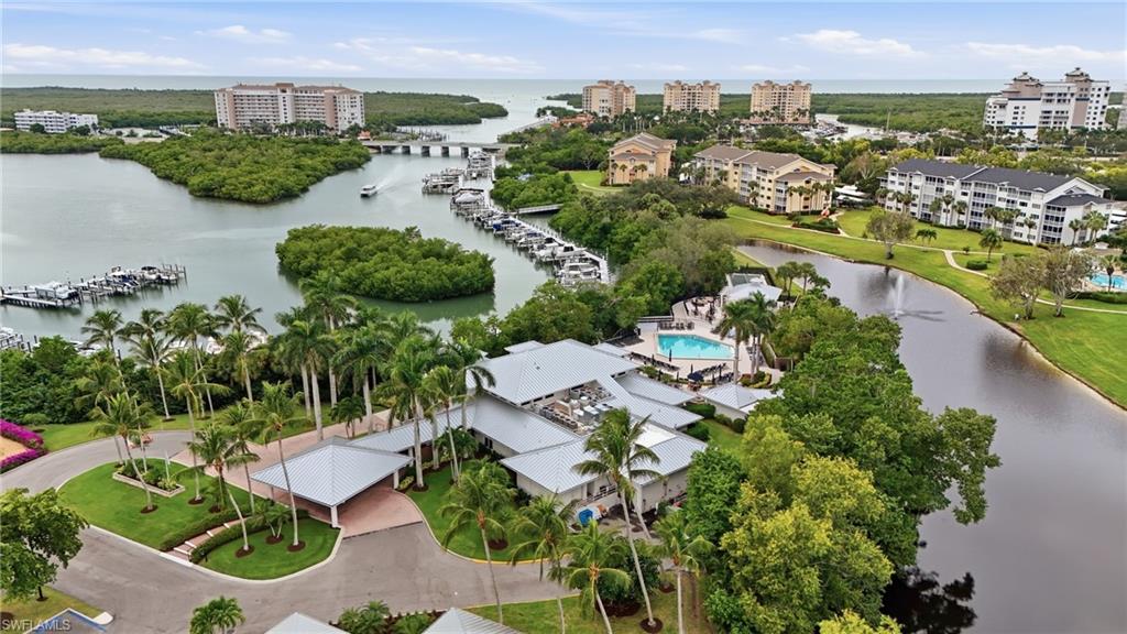 Come live in this Resort Community! This gorgeous condo which includes 2 BR, a Den, 2 BA, and a carport, with a fabulous lake and fountain view, offers amazing value. Watching expansive sunsets from your private, second-floor lanai is a delight. This unit looks brand new with a beautifully renovated kitchen, baths, and exceptional furnishings. An assumable membership to Tarpon Cove Yacht and Racket Club is also available which offers dining, tennis, bocci ball, many social clubs, a resort-style pool with Tiki Bar, and a beach boat available to shuttle you to Delnor-Wiggins State Park. Easily accessible, newly built boat slips are also available to buy or rent. Imagine walking to your slip and heading up Wiggins Pass in minutes! Also, the newly-opened Kinsale Golf Club across the street offers amazing investment property opportunities. You are centrally located with shopping, restaurants, golf, and beaches nearby. RSW is an easy 30-minute drive. Make this celebrated North Naples community your own at an incredible price. Florida living at its best!