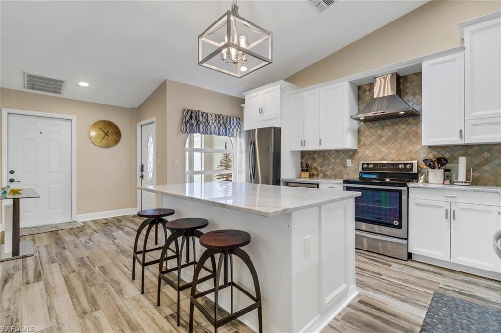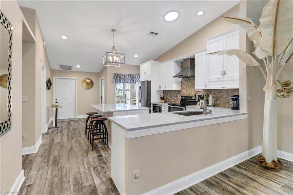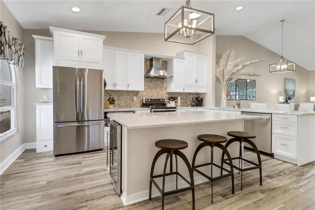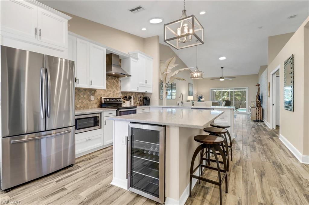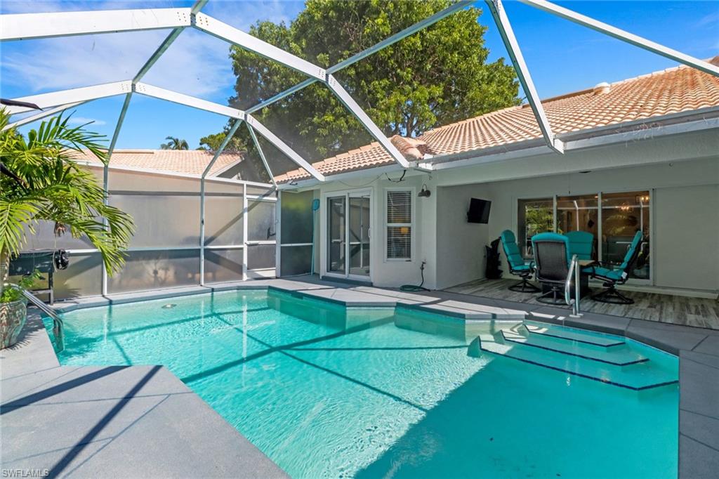 Discover coastal charm and modern comfort in this beautifully refreshed villa nestled within the highly desirable Wiggins Bay neighborhood of North Naples—just minutes from pristine beaches, top-tier shopping, and fine dining. Peace of mind comes standard with a newer roof, impact windows in the master suite, and upgraded HVAC and water heater systems. Inside, you’ll be greeted by a sleek, remodeled kitchen featuring stainless appliances, custom cabinetry, and LED lighting, alongside a spa-inspired master suite rich with custom closets and a fully renewed bath. Throughout, fresh Cortec Plus laminate flooring, baseboards, and interior paint lend a light and modern feel, while a stylishly updated guest bathroom and added storage in the guest bedroom and laundry provide practical elegance. Outdoors, your personal retreat awaits with a resurfaced and retiled pool, LED lighting, refreshed pool cage and deck, upgraded “No-See-Um” enclosure, and modern pool equipment—perfect for Florida living. Thoughtful finishing touches like French doors, new ceiling fans, and an enhanced garage complete the picture. Wiggins Bay truly enhances the lifestyle by offering optional membership at the Tarpon Cove Yacht & Racquet Club, featuring private beach shuttles, tennis courts, dining, fitness facilities, and engaging social events for residents who enjoy a more active and connected community. More than just a home—it’s an invitation to soothe into the vibrant Naples way of life.