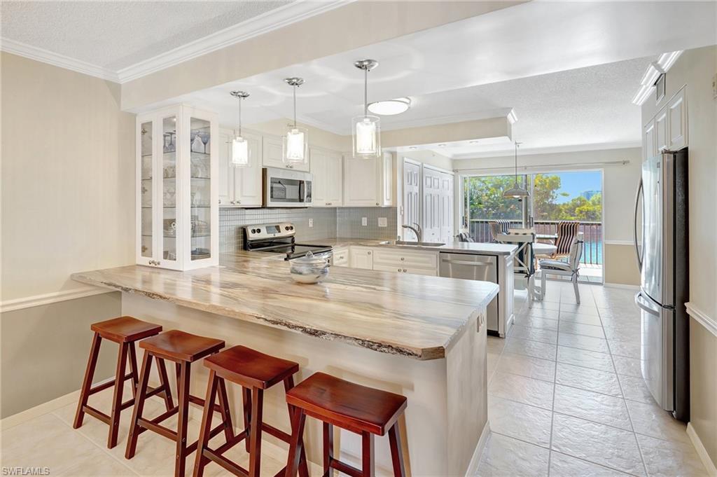 LOCATION, LOCATION! Waterviews off the living room, lanai & master bedroom. This Condo has been recently renovated. Quality! Cabinet packed white Shaker cabinetry, extended into eating area for loads of extra storage. Quartz countertops, with added breakfast bar space, modern subway backsplash tiling, white appliances, & new lighting. Both bathrooms are walk-in glass showers, with new vanities. Main living area and kitchen feature crown molding. Flooring throughout is wood-grain color tile. Washer/dryer replaced recently. Windows replaced 2018, hurricane shutters and new impact front door add great value. Sold with furniture, so available to make this your place now. This building is very unique, the only one with a rooftop deck. Enjoy coffee, happy hour or just relax reading & sunning yourself on Penthouse level with great views. Princeton Place community has a pool & bathhouse, each building has its own grilling area. Parking spot for this condo is 204 its a End. If your looking to lease/purchase a boat slip or have more social activities, look into joining The Tarpon Cove Beach & Racquet Club just steps away. Ask about details & costs of memberships. Fitness; dining; tennis; bocce; pool ; tiki bar and a boat taxi to Delnor Wiggins Beach.