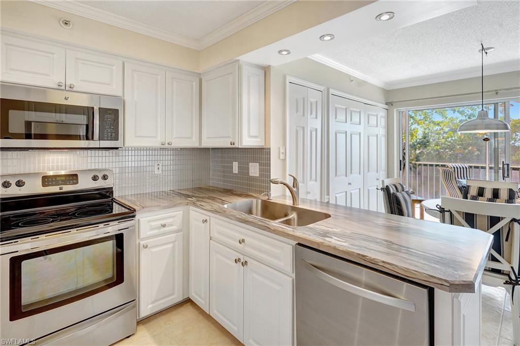 RENOVATED 4TH-FLOOR CONDO WITH SOUTHERN EXPOSURE & TRANQUIL LAKE VIEWS – MINUTES TO THE BEACH! PRICED TO SELL! Filled with natural light and coastal charm, this 2-bedroom, 2-bath residence offers modern style, effortless comfort, and an unbeatable value. Move right into this beautifully updated condo in the highly desirable Princeton Place at Wiggins Bay. The renovated kitchen showcases stainless steel appliances, granite countertops, soft-hued cabinetry, and a sleek glass tile backsplash. Tile flooring extends throughout the main living areas, while luxury vinyl plank flooring in the bedrooms adds warmth and elegance. Both bathrooms have been tastefully redesigned with contemporary finishes, including new vanities, updated tilework, and stylish fixtures. The primary suite features a walk-in shower, while the guest bathroom offers a tub/shower combo with a glass enclosure. Additional upgrades include a NEWER ROOF, HVAC, WATER HEATER, UPDATED PLUMBING, and ELECTRIC HURRICANE SHUTTERS—providing comfort and peace of mind. Furniture is available for purchase, making this home truly move-in ready. HOA fees also include cable and WiFi. Perfectly situated west of Route 41, Wiggins Bay places you just minutes from Vanderbilt Beach, Delnor-Wiggins Pass State Park, and Barefoot Beach. Enjoy effortless access to dining, shopping, entertainment, and medical facilities. The community also offers optional membership at the Tarpon Cove Club, featuring a resort-style pool, restaurant, tiki bar, fitness center, beach shuttle, tennis, and bocce. BOAT DOCKS ARE AVAILABLE for sale or lease, offering exceptional waterfront convenience. Don’t miss this opportunity to enjoy the best of North Naples living—beautiful upgrades, an ideal location, and incredible value all in one! **THIS PROPERTY QUALIFIES FOR A 1% LENDER INCENTIVE IF USING PREFERRED LENDER. INQUIRE FOR MORE DETAILS.*