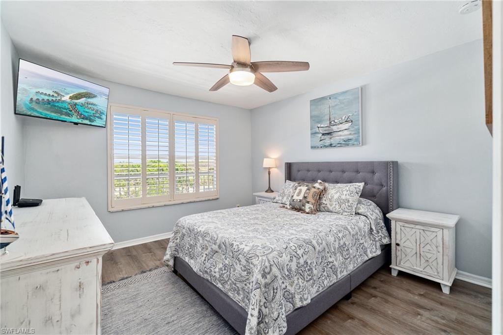 FACING WEST!! VIEWS & SUNSET SKIES from your lanai, living area and master bedroom. Boat Lovers Dream. This Quality renovated 2 bedroom, 2 bath Condo was done a year ago, kitchen wall removed, over-sized quartz counters, extended to backsplash, additional bar/cabinets added with wine refrig., plus stainless appliances. The (Luxury vinyl) wide wood grain floors flow throughout. Lighting, fans & all door handles offer a stylish modern Decor. Master bath has separate dual sinks, a custom soaking tub, glass enclosed custom shower & even added a linen closet. Guest bath has glass enclosed walk-in shower. A/C replaced, tankless water heater, electric hurricane shutter. THIS BLDG HAS LOWEST HOA IN WIGGINS BAY & ready for a new paint color. Come enjoy and have Income too. Seasonal renter for Jan 3 - April 3 at $19K. This condo is within steps of the Tarpon Cove Beach & Racquet Club with amenities to enjoy. Restaurant, Tiki bar, tennis, fitness, boat taxi to beach, resort pool, bocce and loads of social events, private membership , ask about details/costs.