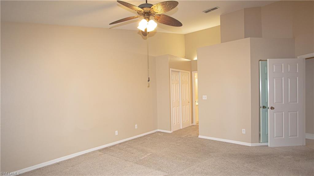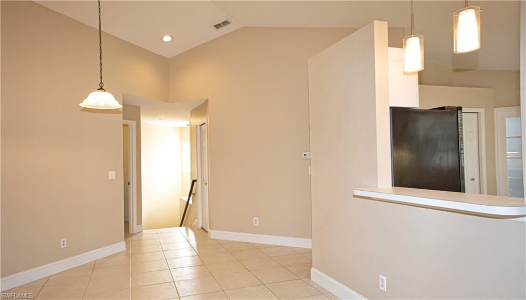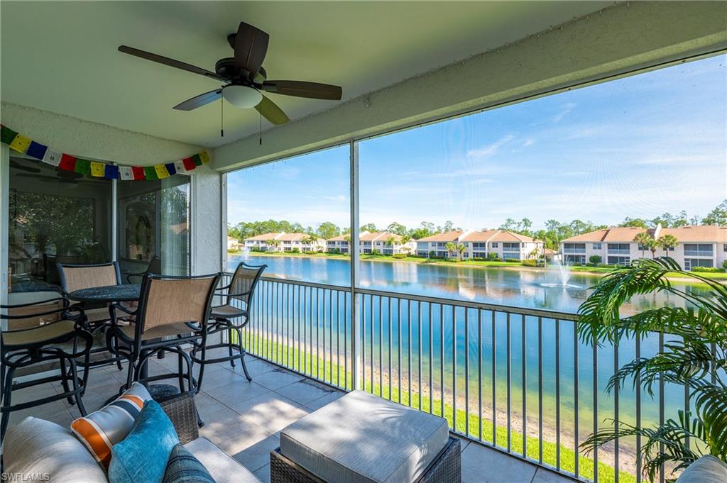 Well-maintained, upper-floor end-unit residence featuring the largest floor plan available in Wilshire Pines. Filled with natural light, this three-bedroom, two-full-bath condominium has a bright and open breakfast bay window/nook as well as sunny southeastern lake and fountain views. Only one owner since built, neutral colors throughout, vaulted ceilings, split bedroom floor plan and tile in the main living areas. The main bedroom has three closets with custom built-ins, a lake view, lanai access and a huge bath with dual sinks and a separate tub and shower. The spacious laundry room features extra cabinet storage. Easy access to the private one-car garage with freshly painted floor. Pet-friendly with two dogs allowed up to 25 pounds each. This gated community has two community pools, two tennis courts and two clubhouses. Popular Vineyards elementary school district and conveniently in the north end of Wilshire Lakes adjacent to North Collier Regional Park with all its activities.