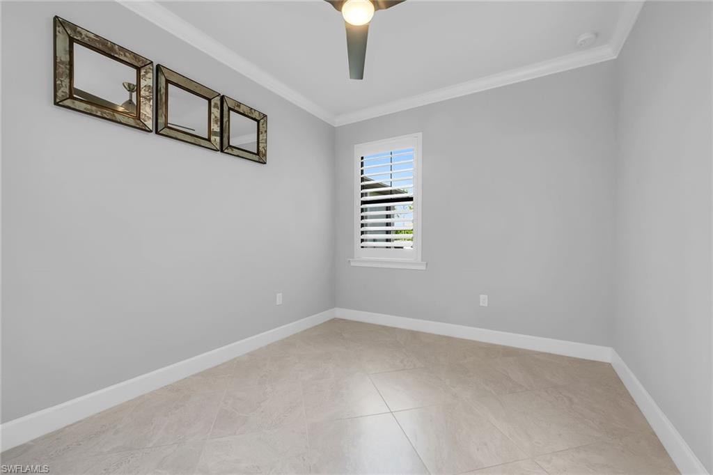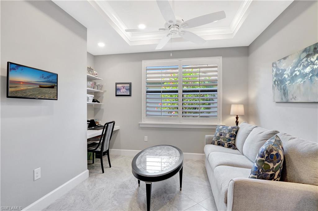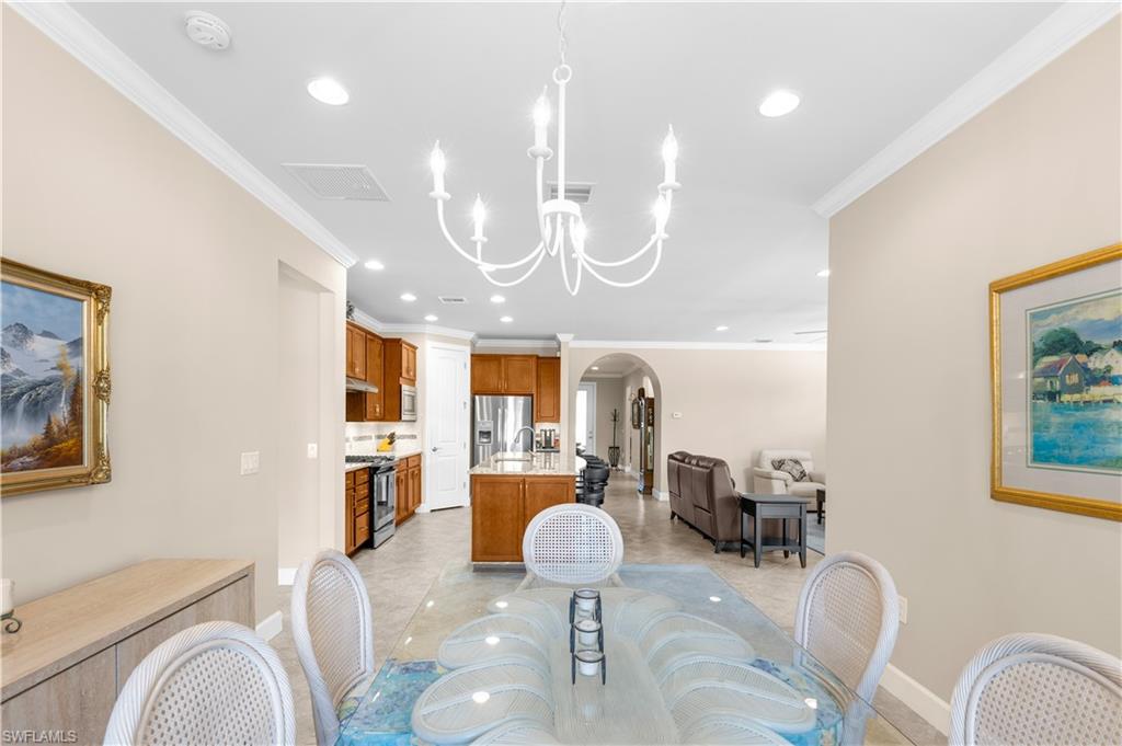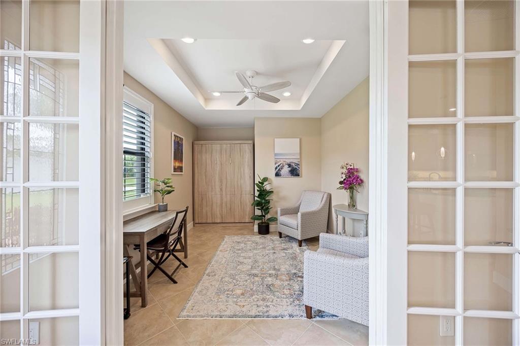 Set against private garden views with tranquil eastern exposure, this beautifully appointed villa in Winding Cypress offers a peaceful retreat and effortless indoor-outdoor living. Featuring two bedrooms plus a den, two baths, and a two-car garage, this thoughtfully designed residence combines quiet luxury with meticulous updates in one of Naples’ most dynamic lifestyle communities. The screened lanai is ideal for entertaining or unwinding, complete with brick paver flooring, a saltwater pool with waterfall feature, pool heater, and recent upgrades including a new salt generator and pool pump. A custom outdoor kitchen with a stainless steel gas grill with matching hood and sink further enhances the outdoor living experience. Electric hurricane shutters protect the lanai, while manual shutters cover the remainder of the home. Inside, tile flooring extends throughout, accented by crown molding, recessed lighting, and white plantation shutters. The living room opens to the lanai through expansive glass sliders, anchored by a modern ceiling fan. The kitchen features white Shaker-style cabinetry, quartz countertops, a tile backsplash, pantry, and stainless steel appliances including a gas range, refrigerator with icemaker, microwave, and dishwasher. A modern chandelier defines the dining area, which flows easily into the main living space. The primary suite is a private haven with a tray ceiling, garden views, custom closet, and a spa-inspired bath featuring dual quartz vanities, full-width mirrors, and a frameless glass walk-in shower. The second bedroom includes a walk-in closet and an adjacent bath with a shower-tub combination. A den with French doors offers flexible space for a home office or reading room. Additional highlights include a mini-split air conditioning system in the garage, a brand-new water heater, and recent property updates including a full exterior repaint (approximately two years ago) and interior paint touch-ups. Residents of Winding Cypress enjoy access to resort-style amenities including a pool, an attended fitness center, an on-site restaurant, five tennis courts, four bocce ball courts, four pickleball courts, a community garden, and a dog park. With a vibrant social calendar, low HOA fees, rental-friendly policies, and a prime location near Marco Island, downtown Naples, 5th Avenue, and I-75, this villa offers elevated living in a premier Naples community.