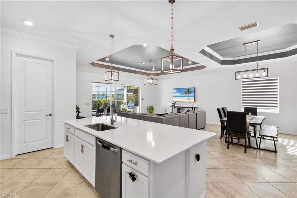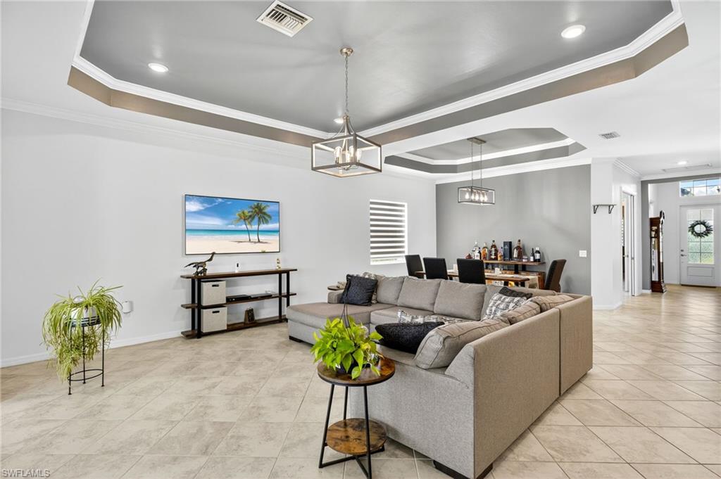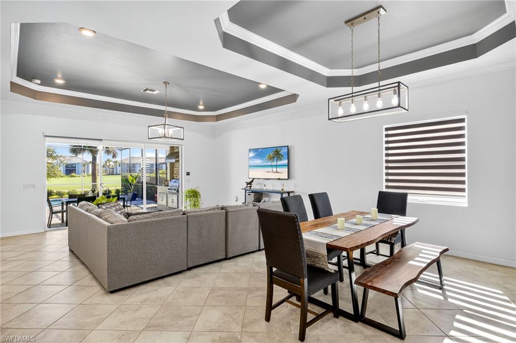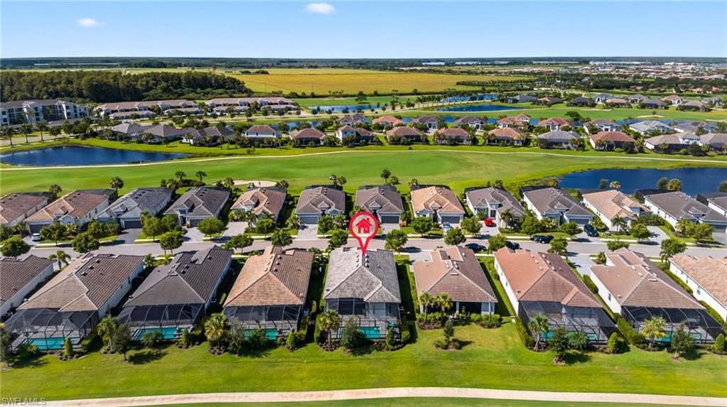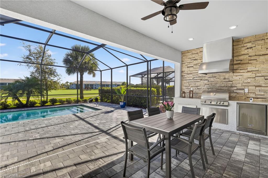 Take a look at what could be your new home in The National - A gated community located in Ave Maria! This home is known as the Maria model and contains MANY interior and exterior upgrades. With this layout, you get 4 spacious bedrooms, 3 full bathrooms, almost 2,300 square feet of living space and a 2-car garage. In that same garage, sellers have added garage door insulation and overhead shelving in addition the owner relocated the air handler from the ceiling to ground level for optimal performance and easier maintenance. Walking into this home you will find a inviting foyer and open living area, beautiful tray ceilings with integrated lighting, and tasteful ceiling fixtures. Your dining room is integrated into the great room space. The gourmet kitchen overlooks your living room and features rich white cabinetry, glass backsplash, quartz countertops, microwave and wall oven in cabinet, a walk-in pantry, under-cabinet lighting, and stainless steel appliances. - perfect for cooking enthusiasts. Just around the corner you have your spacious primary bedroom and bathroom with tile flooring, dual sinks and a glass enclosed shower. Giving ample privacy to everyone residing, your guest bedrooms and bathrooms are on the opposite side of the home. The upgraded bathrooms showcase sleek glass shower doors, with one even offering a private en-suite! On that same side of the home is where you will find your laundry room which includes the appliance package, cabinetry and a sink. Adding to the safety of this home, you have hurricane accordion shutters on windows, coupled with hurricane screens on the lanai and entry. Last, but certainly not least, step outside onto your private lanai, and enjoy panoramic views of the golf course and lake with northeast exposure. That means endless skies by your pool! Exterior updates include an upgraded summer kitchen with a BBQ grill, hood, and mini fridge. Not a detail in this home has been overlooked! Outside of your home and within the gates of The National Golf & CC, boasts an 18-hole championship golf course, a large resort-style pool, a Chickee Bar, 6 Har-Tru tennis courts, 8 pickleball courts, and 2 bocce ball courts. Outside of the gates, you can enjoy North & South Parks, water park, Ave Maria University events, local dining, shopping and so much more! Come experience everything you need in the fastest growing area in Naples!
