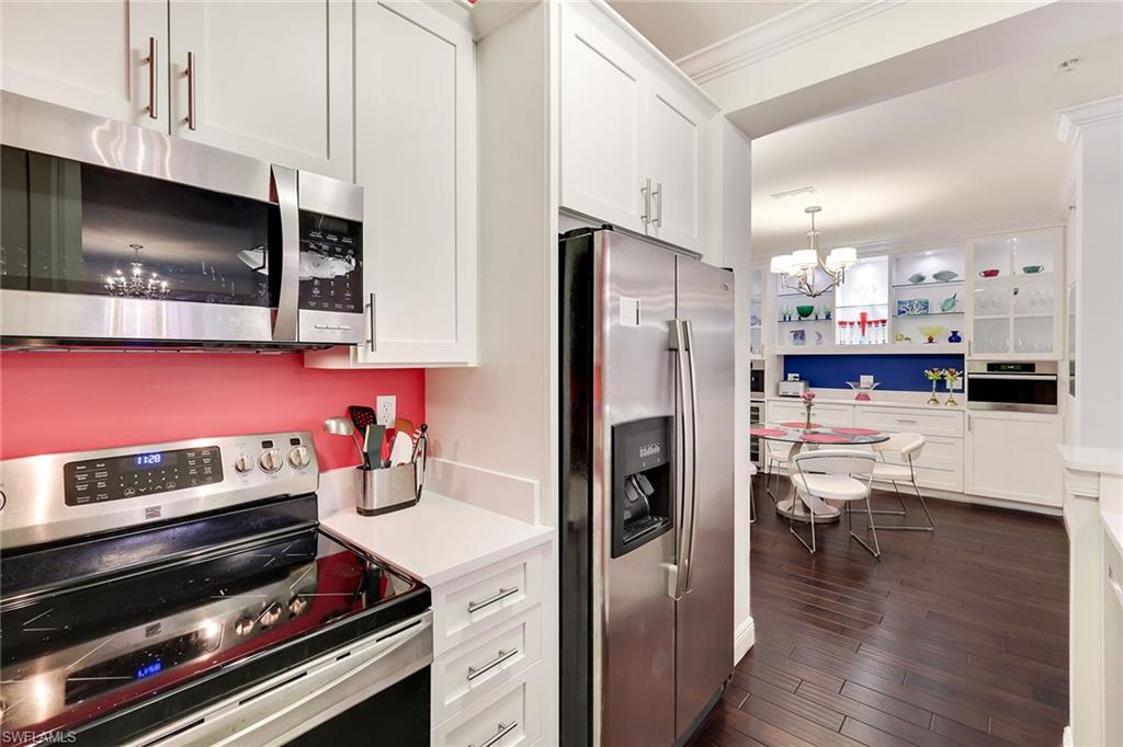 Walk to shops and restaurants! Upon entering this private retreat, you will be delighted by the light bright interior and upgraded finishes. The den area is a cheery dining place adjacent to the chef’s kitchen, with high-end stainless steel appliances including an induction cooktop and convection oven, Bosch dishwasher, Miele steam oven and a built-in coffee machine. Custom cabinetry and quartz countertops offer an additional area to prep as well as display your cherished collections. Hardwood floors are warm and inviting. The primary suite is separated from the guest bedroom for optimal privacy and opens to the spacious lanai overlooking a private courtyard. The primary en suite offers a respite from a long day of shopping! Upgraded lighting highlights the elegant space and volume ceilings giving an air of openness and spaciousness. Impact glass windows and doors provide security and peace of mind. This gorgeous residence is offered furnished with luxurious furnishings, lights and artwork. Enjoy the convenience of a reserved parking spot in the gated garage. The Residences offer a resort-style swimming pool and spa, fitness facility, grilling area and a clubhouse ideal for getting to know your neighbors and living your best active lifestyle, all within walking distance to high-end shopping and restaurants at Coconut Point, where discounts are offered to residents!.