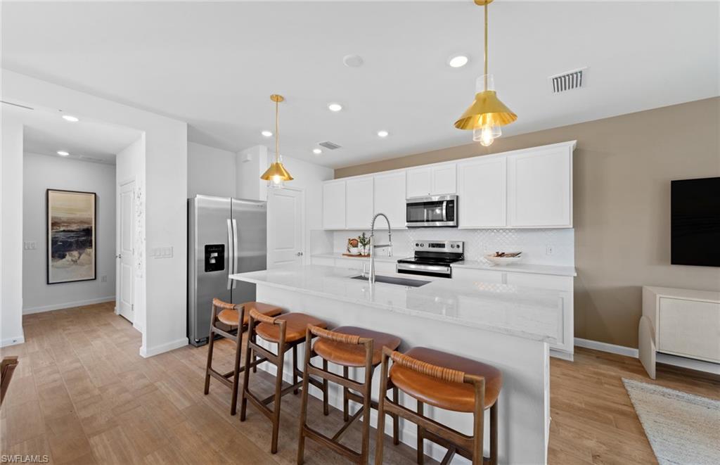 Move to Solis Grande! This new construction Rowan plan will be complete May-July 2025! Discover the space you need in the Rowan. The Rowan is a beautiful brand new 3 bed, 2.5 bath, 2-car garage townhome by Pulte Homes in a highly desired, new construction community at the corner of Bonita Beach and Bonita Grande. Solis Grande will be the future homesite of 118 beautifully designed, luxury townhomes in a convenient location! This home will feature Quartz countertops, beautiful cabinetry, and tile floors. This split bedroom floor plan offers spacious bedrooms with walk-in closets, tiled showers, a dual sink vanity in the owner's suite, and plenty of storage spaces throughout. Stainless Steel Whirlpool kitchen appliances plus washer & dryer. This home comes equipped with a covered lanai, Smart Home package, smart garage door opener, move-in ready package (blinds on windows, refrigerator, washer, and dryer), luxe package (soft close drawers/cabinets, upgrades to tile walls, kitchen backsplash, kitchen sink, bathroom sinks, faucets throughout, door hardware upgrades, comfort height commodes, TV prep in gathering room, LED lights, pendant pre-wire), & beautiful Florida skies! This Rowan is an end unit with southern facing lanai. Low HOA, no CDD, and amazing location!