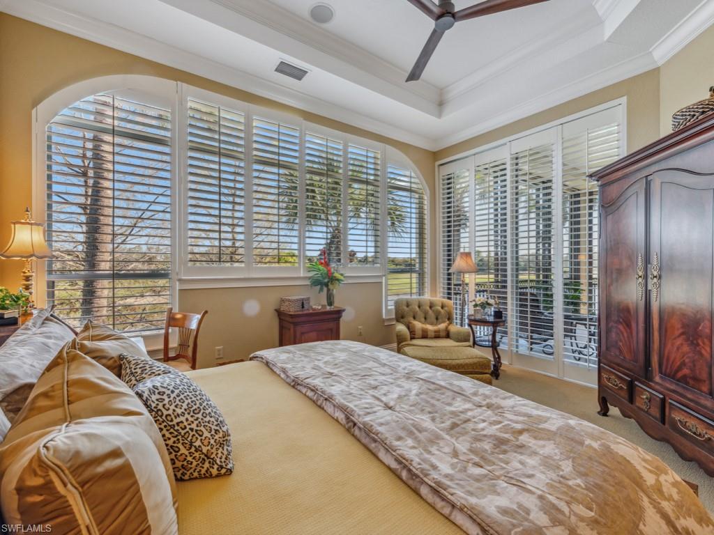 Located in the beautiful Mediterra Golf & Country Club of Naples with a newly renovated private beach club - Welcome to this exquisite second-floor coach home, where sophistication meets comfort in every detail. As you approach, the grand paver driveway and lush tropical landscaping immediately set the tone for the elegance that awaits. Upon entry via either the private wood-paneled elevator or the dramatic staircase with customs wrought-iron banisters that draw you up to an inviting formal dining area bathed in natural light, with wall-to-wall built-in cabinetry equipped with pull-out wine storage, soaring ceilings, and beautiful architectural features, including tray ceilings and refined lighting fixtures. The heart of the home is the spacious living room, seamlessly connected to a large screened lanai that offers breathtaking lake and 7th fairway golf course views. This space is perfect for both tranquil mornings and lively gatherings, with its blend of indoor comfort and outdoor charm. Adjacent is the chef’s kitchen with warm wood cabinetry, granite countertops, top-tier stainless steel appliances, and even a bar with a wine cooler. An additional breakfast nook provides a cozy spot to enjoy casual meals while taking in the serene views. The primary suite is a true retreat, featuring direct access to the lanai, a walk-in closet, and a spacious bedroom adorned with plantation shutters, tray ceilings, and a sitting area to unwind while overlooking the lush surroundings. The en-suite bathroom exudes spa-like luxury with its dual vanities, soaking tub, and separate walk-in shower. The home is completed by thoughtfully designed guest bedrooms, a private den, and ample storage spaces. Step outside to the screened lanai, where you will find the perfect setting to sip a refreshing drink as you soak in the panoramic views. There is also a neighborhood pool & spa just a few steps away for added enjoyment! Additional highlights include two new a/c units in 2023, a new garage door opener, a keypad & motor in 2023, a new dishwasher in 2024, all ceiling fans replaced, metal hurricane shutters, wired surround sound, and encore garage flooring. Mediterra is a prestigious luxury golf & country club community featuring Two championship Tom-Fazio golf courses for avid golfers, a private beach club with restaurant & bar, multiple tennis courts, pickle-ball & bocce, fitness center, pristine bike & jogging trails, and luxurious dining at the private country club restaurant. The Mediterra Beach Club offers an escape to a 10,000 sq. ft two-story private oceanfront paradise on the Gulf of Mexico. Featuring a restaurant & bar that serves members via indoor & outdoor dining, this private facility boasts a heated swimming pool, a sundeck, and cabana beach service for chairs, umbrellas & refreshments.