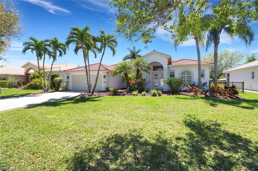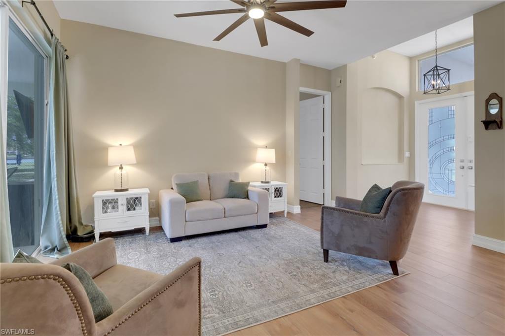 Step into this beautifully designed 3-bedroom, 2-bathroom home offering 1,870 square feet of inviting living space in sought-after Waterways at Naples. A grand French door entry welcomes you into the foyer, where a formal sitting room and formal dining area set the stage for elegant entertaining. The home boasts modern plank tile flooring throughout, with plush carpeting in the bedrooms for added comfort. The cozy living room flows seamlessly into a well-appointed kitchen featuring granite countertops, stainless steel appliances, and a breakfast bar. The spacious primary suite is a private retreat, complete with a tray ceiling, ensuite bath with dual vanities, a soaking tub, and a glass-enclosed shower. A large laundry room offers additional storage and a utility sink for convenience. Step outside to the screened lanai, where a sparkling pool overlooks stunning lake views. The Southern rear exposure provides beautiful sunshine throughout the day, while the fenced yard ensures privacy. Located in the gated Waterways at Naples, residents enjoy low HOA fees and access to exceptional amenities, including a clubhouse, pool, basketball and tennis courts, volleyball, BBQ area, park, and boat storage. With 150 acres of freshwater lakes, this community is perfect for those who love waterfront living. Don’t miss the opportunity to call this lakefront retreat home!