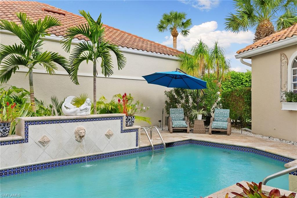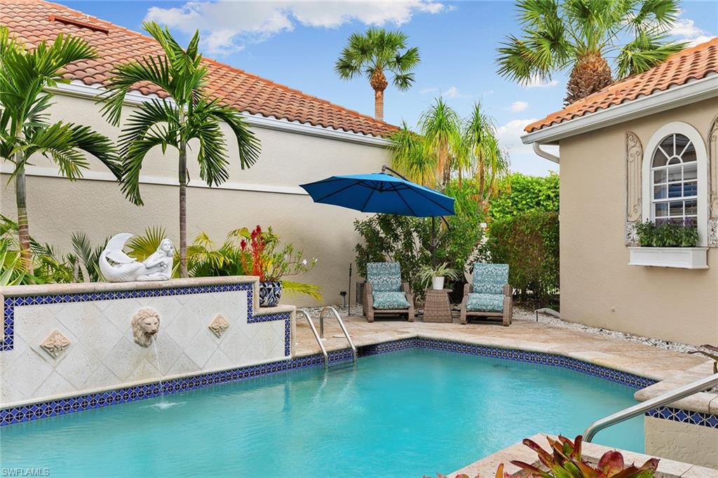 Tucked at the end of a quiet cul-de-sac in the Villa Floresta enclave of Wyndemere, this updated villa is a private retreat with, all the comforts of a single-family home and the lifestyle of a resort, located on the 3rd tee of Wyndemere's White course. Featuring an expansive courtyard with lush new tropical landscaping, a freshly painted interior, and timeless finishes including custom millwork and travertine floors, this home is equal parts relaxed elegance and effortless living. The heart of the home is the oversized courtyard saltwater pool which is heated, completely private and surrounded by lush tropical landscaping, not neighbors or golfers. Relax after a day on the links in a separate saltwater hot springs hot tub. This is a lifestyle property, designed for those who value peace, design, and connection. Wyndemere Country Club offers everything you need behind the gates: 27 holes of Arthur Hills-designed golf, 10 Har-Tru tennis courts, stadium pickleball, bocce, a staffed fitness center, two restaurants, and a full calendar of social events that make it easy to meet new friends and feel at home from day one. Positioned inland from the coast, Wyndemere offers a reassuring level of storm resilience while remaining just minutes from downtown Naples and the beaches. Whether you’re searching for a seasonal escape or a full-time lifestyle upgrade, this spacious, low-maintenance villa offers the perfect balance of luxury, privacy, and belonging.