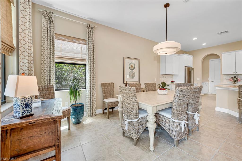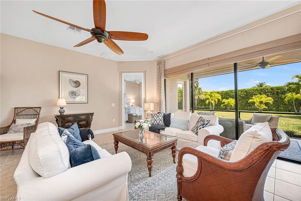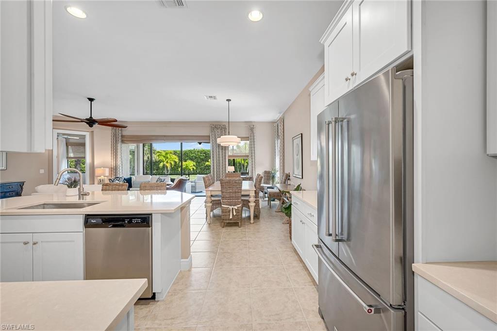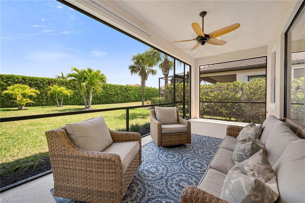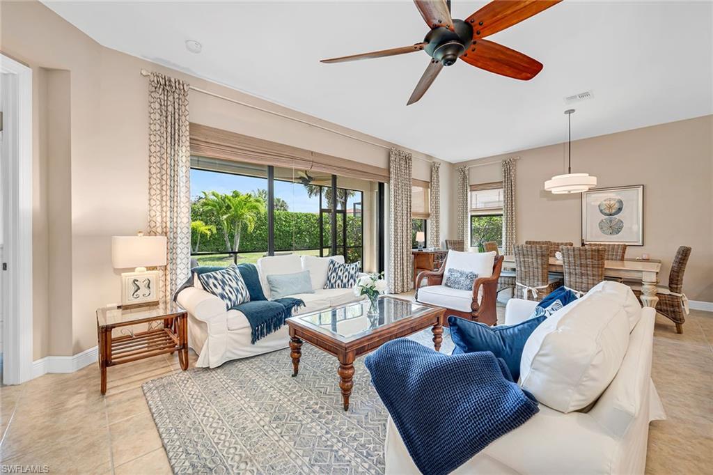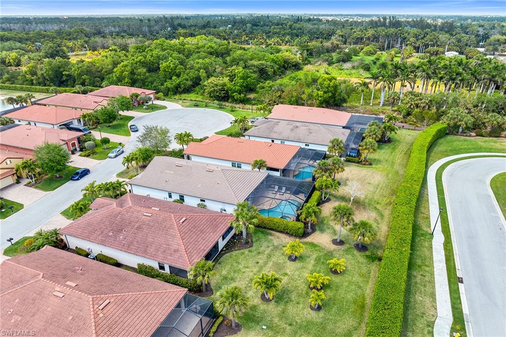 Are you searching for a serene Naples retreat with ultimate privacy and resort-style amenities? Framed by towering palm trees and tranquil garden views, this two-bedroom plus den, two-bath Grand Villa Bimini model by WCI Builders is tucked away on a quiet cul-de-sac in Artesia, offering the ideal blend of elegance, comfort, and convenience. A 10-foot privacy hedge surrounds the backyard, while the screened lanai enjoys morning sun and natural light, creating an inviting space for peaceful relaxation or effortless entertaining, with ample room to add a pool or extend the lanai to further elevate the outdoor lifestyle. Thoughtfully designed for comfortable living, this residence welcomes you with arched walkways, 10-foot ceilings, and 8-foot interior doors, creating an airy, light-filled atmosphere throughout. Tile flooring spans the entire home with no carpet, and classic window treatments, including blinds and drapes, add a timeless touch. The kitchen serves as the heart of the home, featuring Cambria quartz countertops, a large island with bar seating, white shaker-style cabinetry, tile backsplash, recessed lighting and stainless steel appliances. A walk-in pantry with shelving ensures ample storage, while the kitchen seamlessly connects to the dining area and living room, where glass sliders open to the screened lanai and peaceful garden views. The owner’s suite offers a private escape with direct lanai access, tranquil backyard views, and a spa-inspired bath featuring a dual-sink vanity, full-width mirror and a frameless glass walk-in shower with floor-to-ceiling tile. Beyond the bath, a spacious walk-in closet with custom shelving provides excellent storage and organization. The guest bedroom is conveniently near a full bath with a shower-tub combination, while the den provides flexible space for a home office or cozy study. Additional highlights include a laundry room with overhead cabinetry, a utility sink, and a washer and dryer for added convenience and functionality. Set within the natural beauty of Rookery Preserve, Artesia offers a gated, pet-friendly lifestyle with resort-style amenities, including a pool, fitness center, theater, library, pickleball and bocce courts, billiards and two dog parks. A full calendar of social events fosters an active, welcoming community. Between Marco Island and downtown Naples, residents enjoy convenient access to beaches, dining, golf and more. With no CDD and low HOA fees covering cable, Wi-Fi and lawn care, this home offers a rare combination of privacy, value and elevated living. Schedule your private showing today.