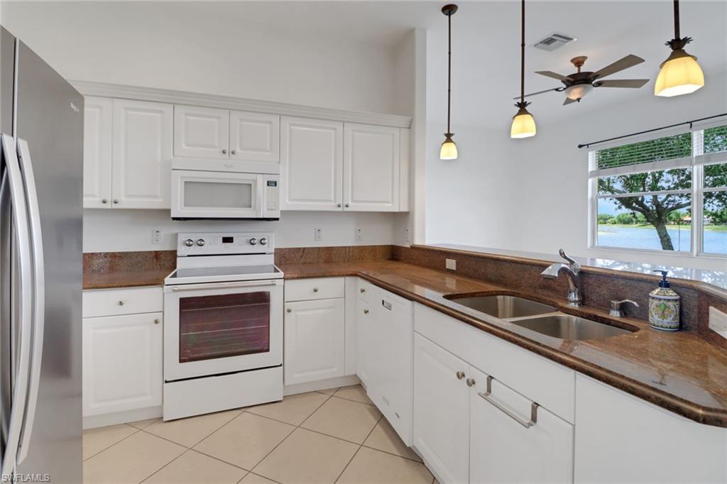 Seller is motivated!! This beautiful lakefront home offers a serene and picturesque setting. Featuring tile flooring throughout the main living areas and laminate floors in the bedrooms, it blends style with low-maintenance living. The upgraded kitchen and master bath showcase premium finishes, while custom cabinets in the laundry room provide added functionality. Thoughtful touches like rounded corners, an intercom system, and pull-down attic stairs enhance comfort and convenience. The roof was redone in 2019, and the A/C unit was replaced in 2022, ensuring peace of mind and energy efficiency. Located on a quiet street, the home also features a spacious screened lanai—perfect for relaxing or entertaining. Immaculately maintained, with a lush green lawn that adds to its charm.
