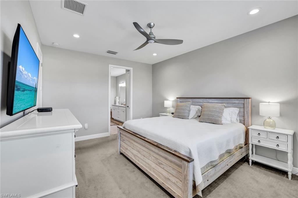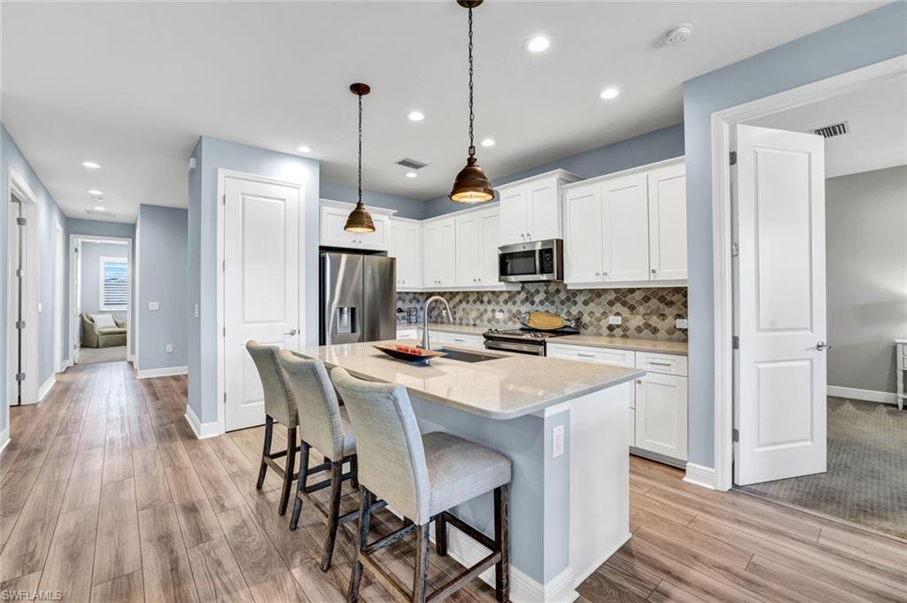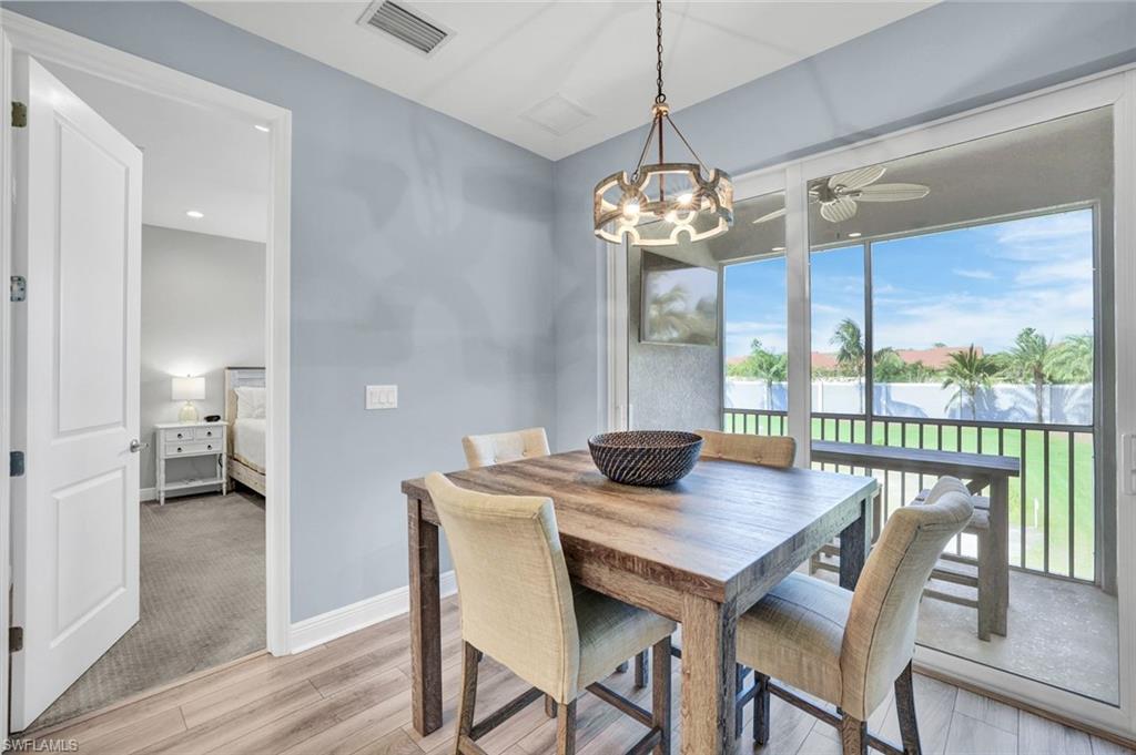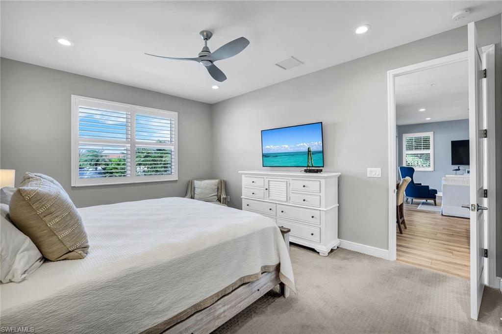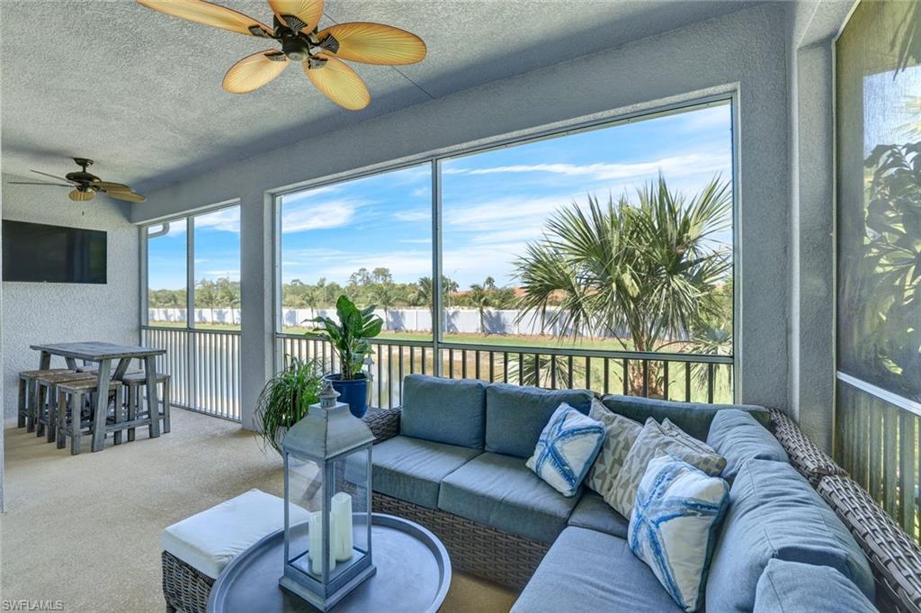 Lakeview and Western Exposure for Naples Sunsets! Seychelles built by Neal Communities with luxury British West Indies architecture. PARTIALLY FURNISHED! 2nd story carriage home located 5 minutes to downtown Naples/5th Avenue and the white sandy beaches of the Gulf. This light and airy open-concept Windemere floor plan unit is located in private cul-de-sac featuring 2 large bedrooms + Den (furnished) 2 full bathrooms and 1 car garage with long driveway for guests. Loaded with luxury upgrades, plantation shutters, including porcelain stone look flooring, chef's eat-in kitchen, dining room, white cabinets with soft close cabinetry, under mount lighting, designer backsplash, contemporary white quartz countertops, LG stainless refrigerator, appliances, and a center island. The spacious master bedroom and spa-like walk-in shower bath is elegantly appointed with double vanity, and has an oversized walk-in-closet, washer/dryer/laundry room. One of the most desirable features of this home is the lanai with TV overlooking the beautiful lakeview. Seychelles features amenities that included an oversized resort style heated pool and spa, fitness center featuring impact floors, Matrix equipment and free weights, fire pit, outdoor gas grill and clubhouse for social gatherings! Convenient location to downtown Naples, I-75 and airports.