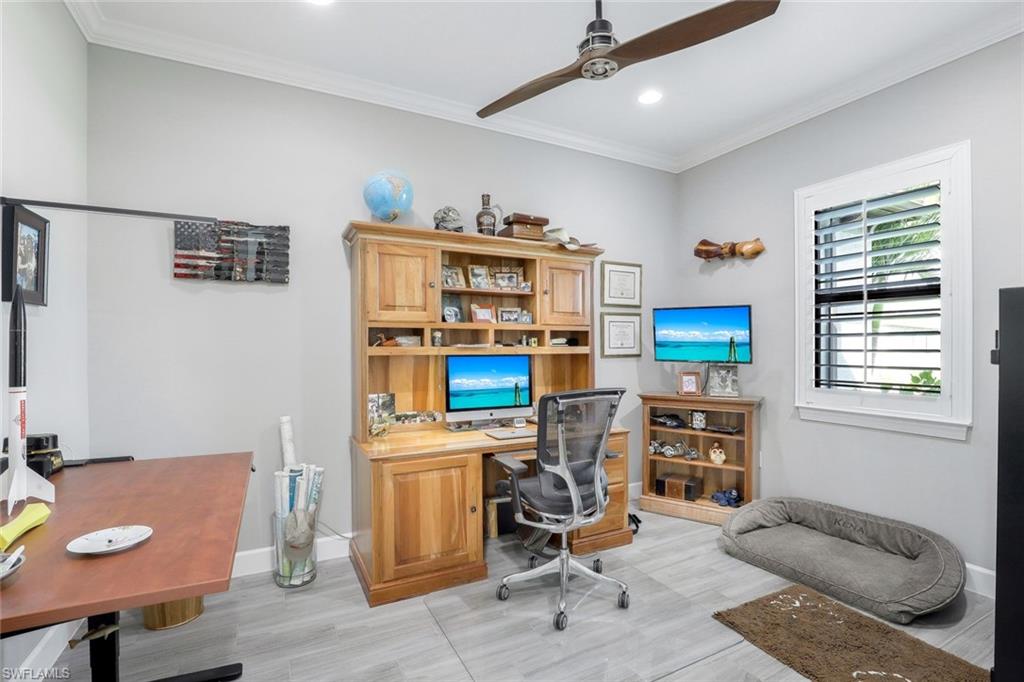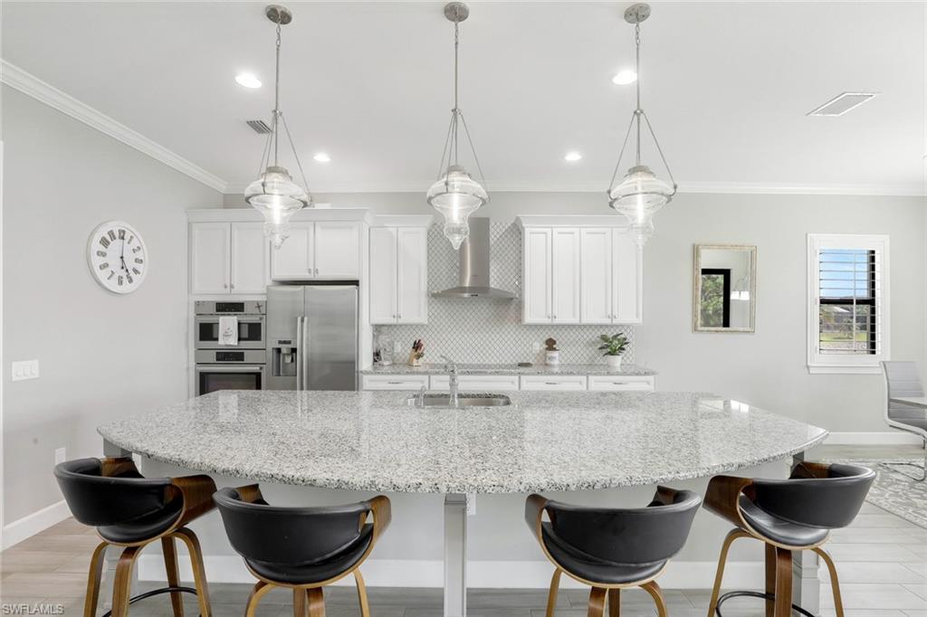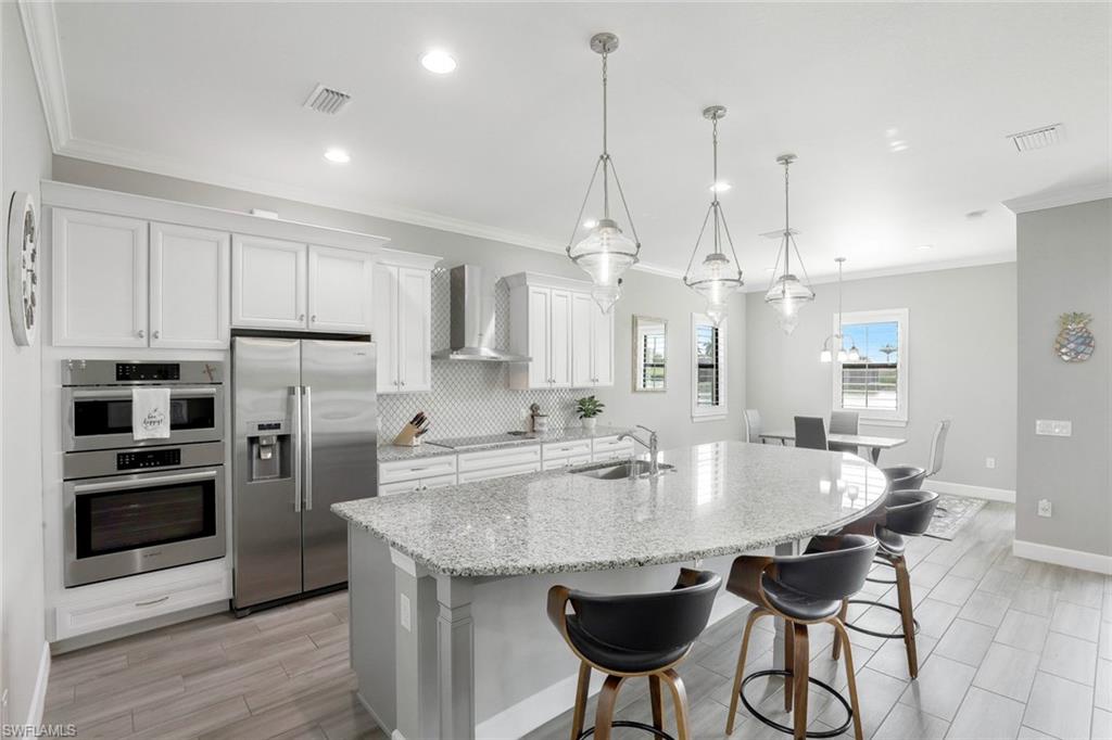 If you are looking for an upgraded home, close to both the Marco Island and Naples beaches, then this is the place for you. Six years young, this property features a large open-concept kitchen with stylish backsplash tiles, Bosch appliances with touch control cooktop and an over-sized granite bar. The living area comes with coffered ceilings and crown molding. From doors that are 8' tall, custom moldings, plantation shutters, and an oversized master bedroom with a huge walk-in closet. Master bath is nicely appointed with dual counters, sinks, shower heads, and a soaking tub! There is an oversized three car garage and you will love the upgrades in this one; professionally installed epoxy coated flooring, over-head rack storage, custom cabinets, a slat wall, and there is already wiring for two electric vehicle chargers. The lot immediately to the southwest of this one will never be built on, and your irrigation comes from the lake, saving you hundreds of dollars a month. You will be surrounded by the beautiful Eagle Lakes Golf Course, which was renovated in 2024. No membership required. HOA fees are less than $150/month. Start living the Florida lifestyle in your beautiful custom home!