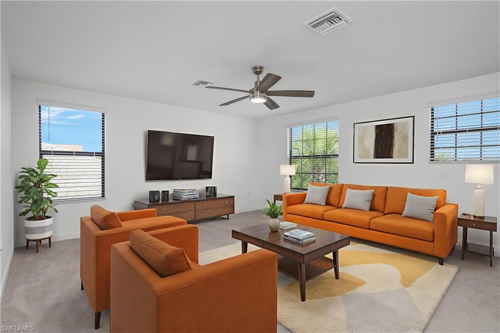 Introducing a beautifully appointed Amalfi model in Estero’s sought-after Verdana Village. Built in 2023 and offering 2,606 square feet of thoughtfully designed living space, this two-story home sits on a 0.19-acre lakefront lot with desirable southern exposure. The main floor welcomes you with an open concept layout highlighted by upgraded ceramic tile flooring, high ceilings, and abundant natural light. A spacious kitchen serves as the focal point of the main level, featuring a large quartz island with an oversized single-basin sink, stainless steel appliances, pantry, and ample cabinet storage. Just off the kitchen, the formal dining area provides flexibility to serve as a home office or additional seating area. Window treatments and upgraded lighting and ceiling fans have already been installed, making the home move-in ready. Sliding glass doors open to a 216-square-foot screened lanai with serene lake views — the perfect backdrop for a quiet morning or an evening outdoors. The main level also includes a guest bedroom and full bathroom, offering ideal separation for guests or multigenerational living. Upstairs, a large central family room provides additional gathering space. The primary suite overlooks the lake and features a spacious walk-in closet and an en-suite bath with dual sinks, quartz counters, and a tiled walk-in shower. Two additional bedrooms, each with walk-in closets, and a full bathroom complete the upper level. Located just 9 miles from RSW Airport, Verdana Village combines residential comfort with a robust amenity package. Residents enjoy access to a state-of-the-art indoor sports complex with basketball, pickleball, tennis, a movement studio, and a fully equipped fitness center. Outside, the resort-style pool includes zero-depth entry, a spa, daybeds, shaded cabanas, and a poolside bar. Additional amenities include bocce courts, a playground, dog park, and a range of dining options including Drift Restaurant, The Craft Lounge, and a café. Everyday needs are easily met at The Shoppes at Verdana Village, located at the community entrance and anchored by Publix, Legno Italian Restaurant, Heartland Dental, and other convenient services. With no flood insurance required, a modern layout, lakefront views, and resort-caliber amenities, this home offers a rare opportunity to live in one of Estero’s most dynamic new communities. Some photos have been virtually staged