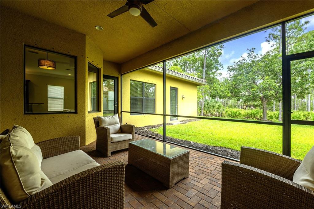 Tranquil Luxury in Riverstone, Naples, where nature meets neighborhood charm. Tucked away in the sought-after Riverstone community of North Naples, this exquisite Drake model, 4-bedroom + den, 4-bath home offers 3,376 square feet of thoughtfully designed living space. From the moment you arrive, the elegant façade and three-car garage—featuring a single bay and double bay—set the tone for a residence that balances sophistication with everyday comfort. Step inside to soaring ceilings, sunlit rooms, and a versatile den perfect for a home office, library, or creative retreat. The open-concept layout invites connection, while the private bedroom suites offer peaceful sanctuary for everyone. Beyond the living room, glass doors open to a tranquil preserve where wild birds and native wildlife create a living canvas of Florida’s natural beauty. There is ample room for a pool, should you desire. Whether sipping morning coffee or hosting sunset gatherings, this view is yours to savor—every day. Located in Flood Zone X. Storm protection with impact windows and manual shutters. Resort-Style Living, Just Steps Away. Located within walking distance to Riverstone’s vibrant clubhouse, this home offers unparalleled access to world-class amenities tennis, pickleball, and basketball courts, lap pool and resort pool, full-service spa and state-of-the-art fitness center, indoor studio for yoga, dance, and wellness classes, elegant clubhouse for social events and private celebrations. Prime North Naples location, just minutes from upscale dining, boutique shopping, and more, this home is perfectly positioned for both convenience and community.