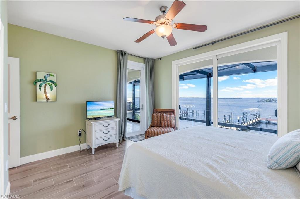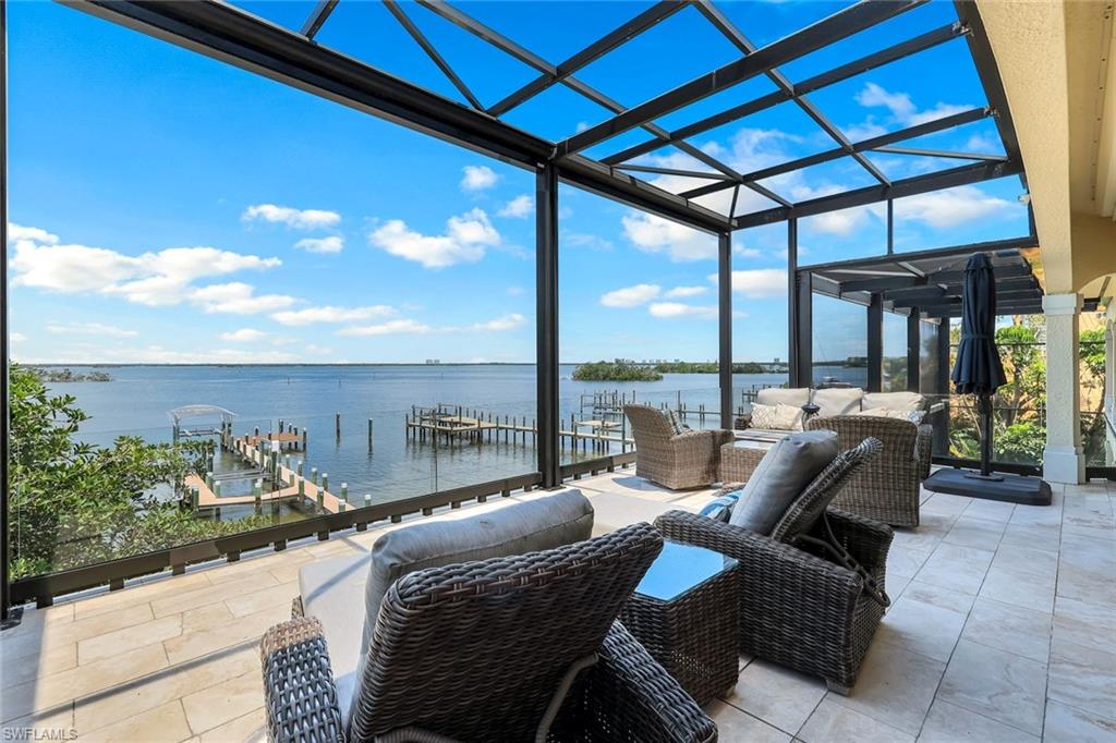 Sweeping Estero Bay views set the stage for this exceptional 4-bedroom, 3.5-bath BAYFRONT retreat offering the ultimate Florida lifestyle with every amenity imaginable. The top-level main living space is built for entertaining, with fully pocketing sliders that bring the bay into full view. An open layout flows seamlessly from the gourmet kitchen, featuring two islands, premium appliances, and a handy dumbwaiter, to the living room with wet bar, wood-burning fireplace, and retractable screened balcony perched high above the bay. The owner’s suite offers a private sanctuary with a wall of glass showcasing the waterfront view, a spa-like bath, and a massive walk-in closet with a California Closet system. Two additional bedrooms, a bath, and laundry are also located on the middle level, with a fourth bedroom and full bath tucked upstairs for added privacy. Outdoor living shines here: on the first level, a screened-in pool with a swim-up bar, hot tub, separate bath, and shower, along with expansive patio areas, creates a true resort vibe. You'll also find an oversized 2-car garage with epoxy floors and built-ins, and a recreation room. For boating enthusiasts, a composite dock with two lifts and a personal watercraft lift offers quick, direct Gulf access. Cruise to waterfront restaurants at Fort Myers Beach or escape south to Lover’s Key. Additional features include an elevator with a view window, rooftop access with 360° panoramic vistas, two A/C units, and incredible storage throughout.