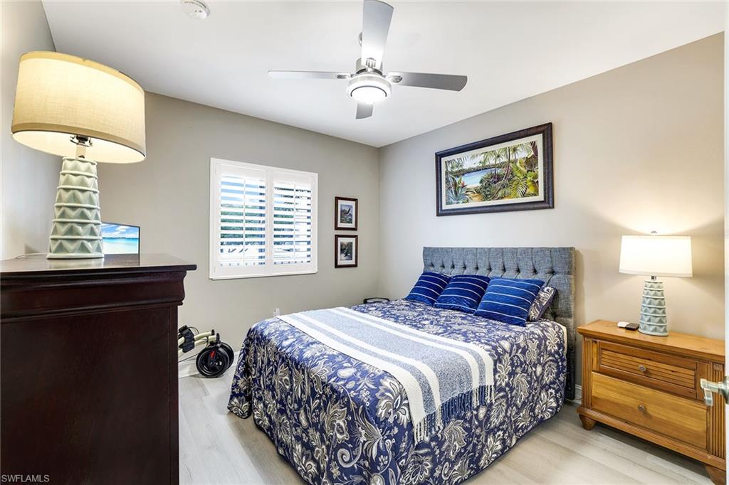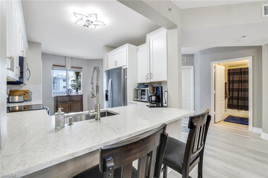 Beautiful turnkey unit with fabulous lake views! Welcome to 7822 Great Heron Way #205. Enjoy captivating views from the lanai overlooking a serene lake and fountain, all while having a home you can immediately move into. This beautiful condominium has been meticulously maintained and upgraded to reflect today's trends. The kitchen boasts new white shaker cabinetry with pullouts, new quartz counters with herringbone backsplash, stainless steel appliances and beautiful luxury vinyl flooring. New elegant designer lighting throughout the condominium. Relax in the living room overlooking the lake and views. The lanai offers a remote electric storm shutter for protection and convenience. The primary bedroom closet has California built-ins which continue to make this condominium convenient and easy to move into. In residence laundry. This bright and airy space is complete with one convenient covered carport. In 2023, the condominium association undertook extensive renovations, including painting the exteriors of all buildings and installing new roofs. In a peaceful neighborhood, Blue Heron offers residents beautifully landscaped grounds, a pristine community pool and a clubhouse ideal for social gatherings. With low condominium fees covering amenities like cable and water, Blue Heron is an exceptional investment opportunity, permitting annual and seasonal rentals. Just one mile from Berkshire Commons, residents have easy access to dining, shopping, grocery stores and more. A short drive brings you downtown Naples with its famous white sandy beaches, upscale dining, shopping and gold courses, promising a lifestyle of convenience and leisure.