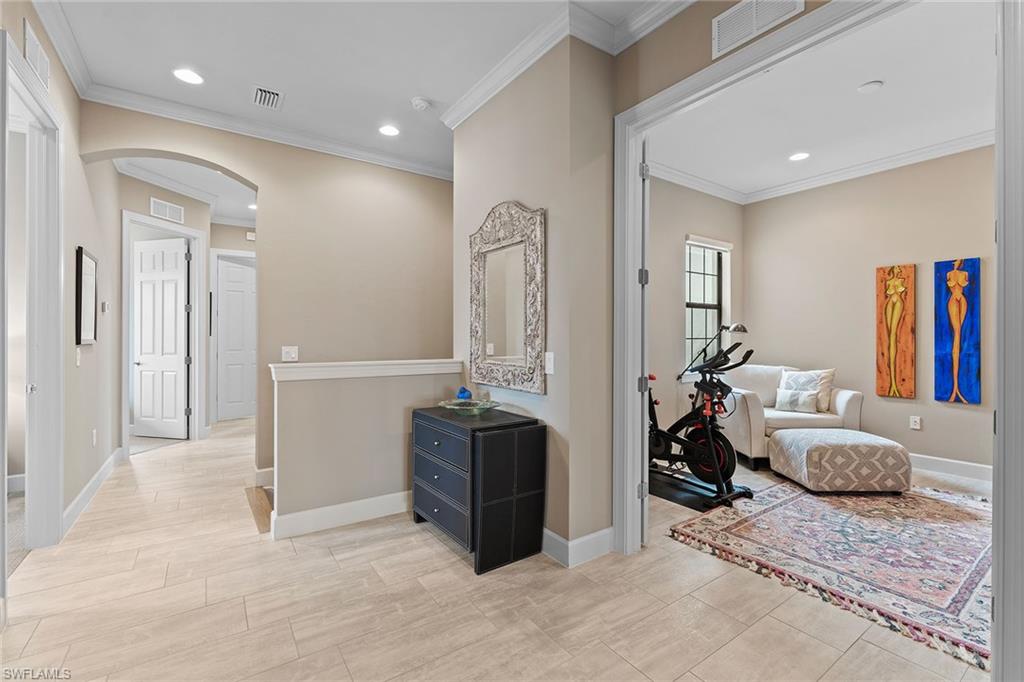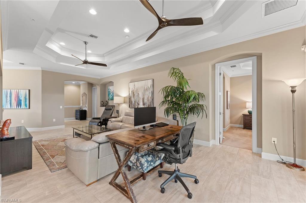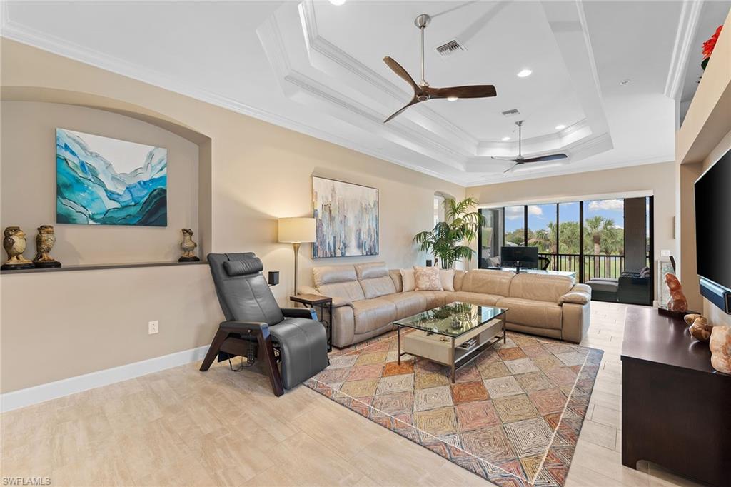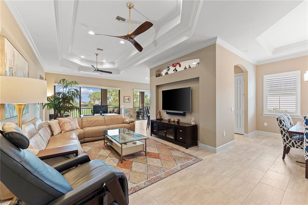 Experience elevated golf course living in this beautifully furnished second-floor coach home at TwinEagles Club, Naples’ premier gated golf community. Enjoy panoramic views of the renowned Eagle Course from the private lanai, with a Deeded Full Golf Membership included for immediate access and no waitlist. The open-concept layout features soaring volume ceilings and abundant natural light, creating a spacious and inviting atmosphere. The upgraded kitchen is equipped with extended countertops, additional storage, and a dedicated wine cooler, seamlessly blending functionality with sophisticated style. Neutral designer finishes throughout provide a versatile canvas for effortless personalization. This residence is perfectly situated near the pool pavilion for ultimate convenience and is well-suited for seasonal residents, full-time homeowners, or travelers seeking a comfortable lock-and-leave lifestyle. The home is offered furnished with minimal exclusions for optimal move-in ease. TheTwinEagles Club presents 36 holes of championship golf, a recently renovated clubhouse, tennis and pickleball courts, fitness facilities, a resort-style pool, dining venues, and engaging social amenities. All of this is set in beautiful Naples, Florida, a sought-after destination recognized for its luxury, lifestyle, and investment value.