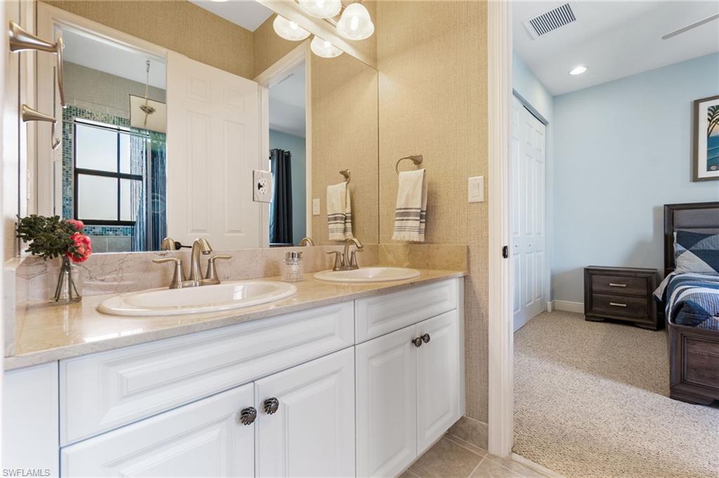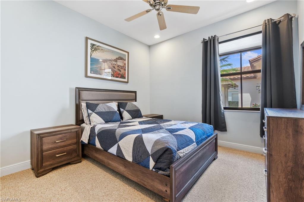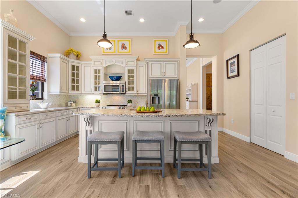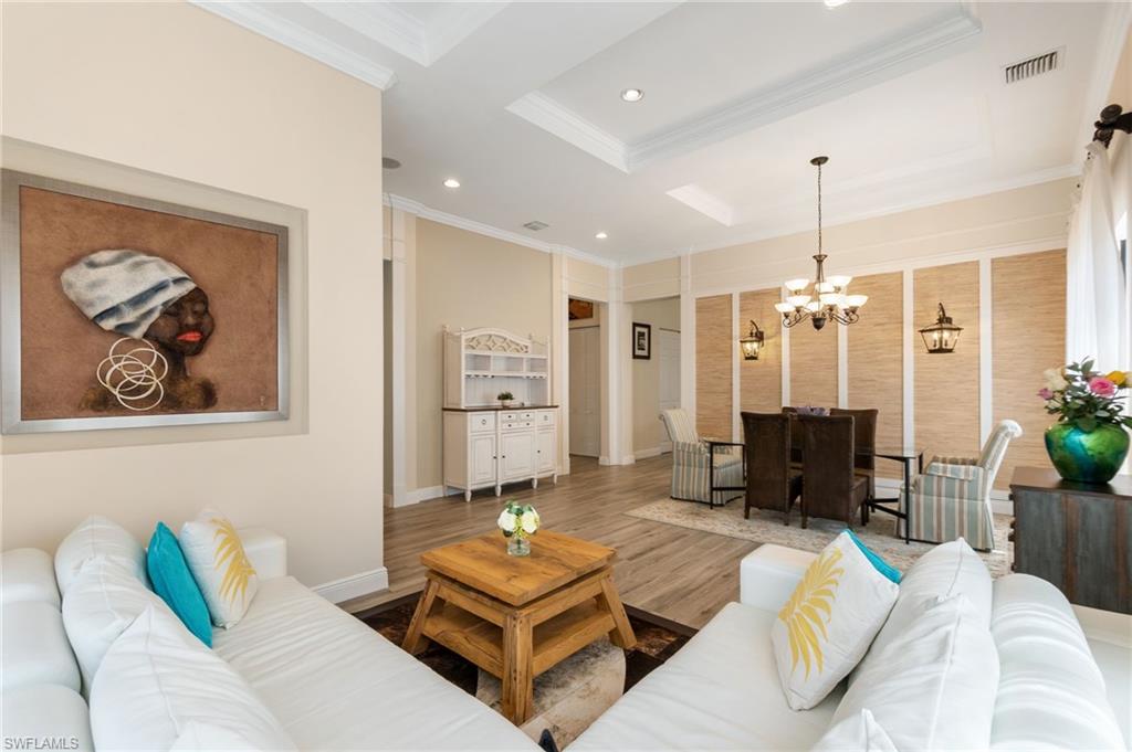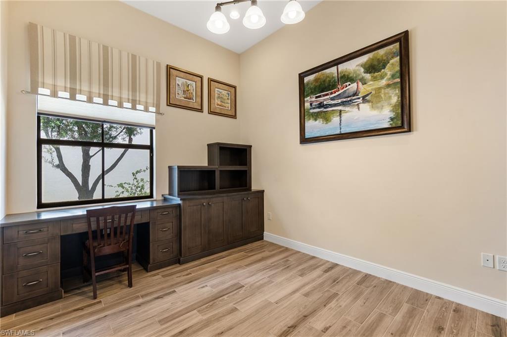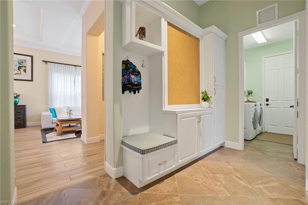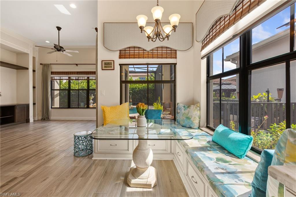 Former Model Home Steps from Ave Maria Town Center! Offering Florida Living at its finest! This thoughtfully upgraded single-story 3-bedroom + den, 3 bath pool home, is ideally located near the charming town center. Impressive 12-foot ceilings and an open concept layout create a light and bright living space in this former model home, which is complete with high-end finishes and custom-designed features. The formal living and dining room flow into a truly gourmet kitchen featuring upgraded cabinetry, a walk-in pantry, premium stainless-steel appliances: a Kitchen Aid range, a Bosch French door refrigerator, and a Hestan dishwasher. A cozy breakfast nook with built-in bench seating and storage drawers adds charm and functionality. The primary suite is truly a private retreat with a tray ceiling, a spa-like en-suite bath including a soaking tub, a separate shower, and dual custom-designed closets. The additional bedrooms are spacious and thoughtfully designed with a full adjoining Jack and Jill bathroom. Working from home is an option with the large den/home office, complete with double doors and a custom-built desk & cabinetry. The laundry room features a built-in sink, ample cabinetry, and includes the washer and dryer-plus an adjacent mudroom with bench seating and extra cabinetry for storage. The outdoor space offers Florida living at its finest with a private backyard oasis: a saltwater pool with waterfall feature, upgraded paver decking, all with a panoramic screen enclosure and privacy hedges- perfect for relaxing or entertaining. The home is located in the heart of Ave Maria, which is known for its local events, farmers markets, lending to the vibrant community appeal. Enjoy access to community gym, pickleball courts, arts & crafts room, BBQ pavilion, and dance studio!