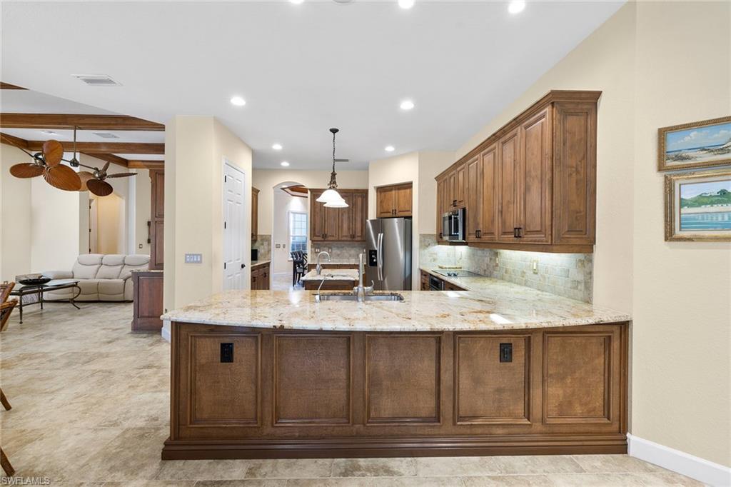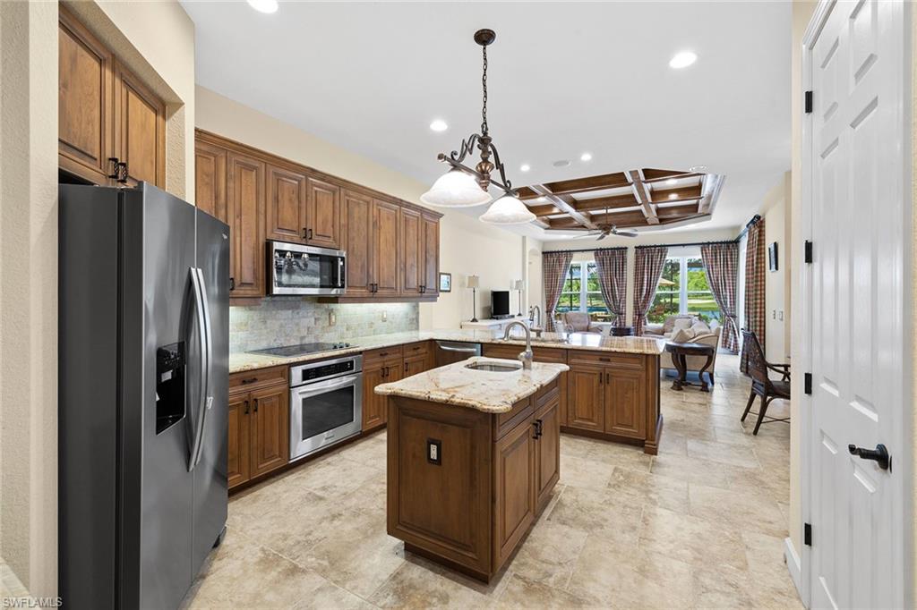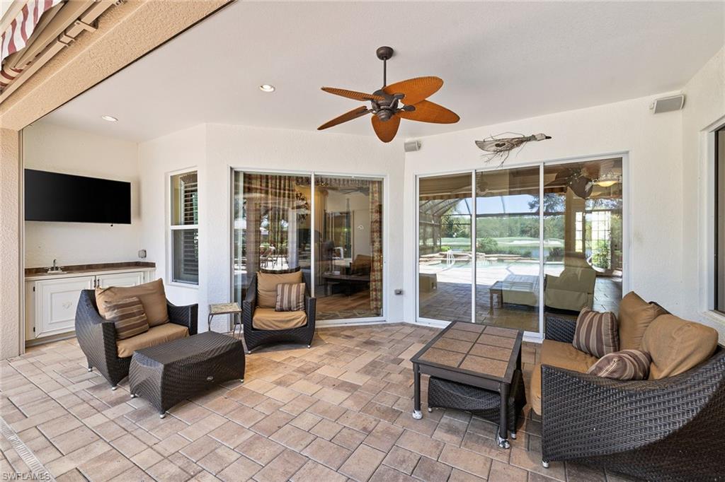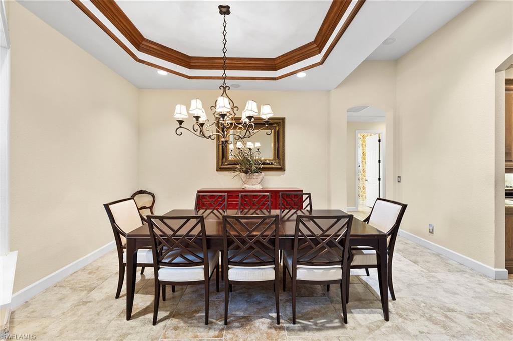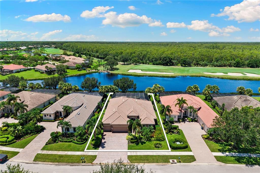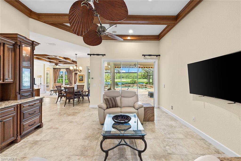 In The TwinEagles Club, a gated golf community offering 36 holes of championship golf, this residence conveys a full golf membership deeded to the property with no waitlist. The four-bedroom plus den, four-bath design spans 3,211 square feet and enjoys southwestern exposure for maximum sunshine on the pool and spa along with breathtaking sunsets. Sweeping lake, golf course and preserve views with no homes across the fairway provide exceptional privacy. The open kitchen offers an island, pantry and abundant cabinetry flowing into the family room, while formal living and dining spaces are ideal for gatherings. The primary suite features lanai access, dual walk-in closets and a spacious bath. Notable upgrades include custom built-ins, intricate coffered ceilings, and electric hurricane shutters on the lanai and front entry. A three-car garage completes this Naples property with access to golf, tennis, fitness and dining.