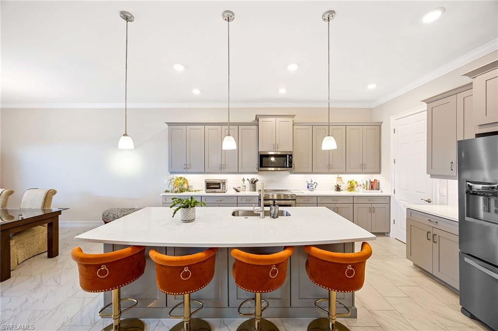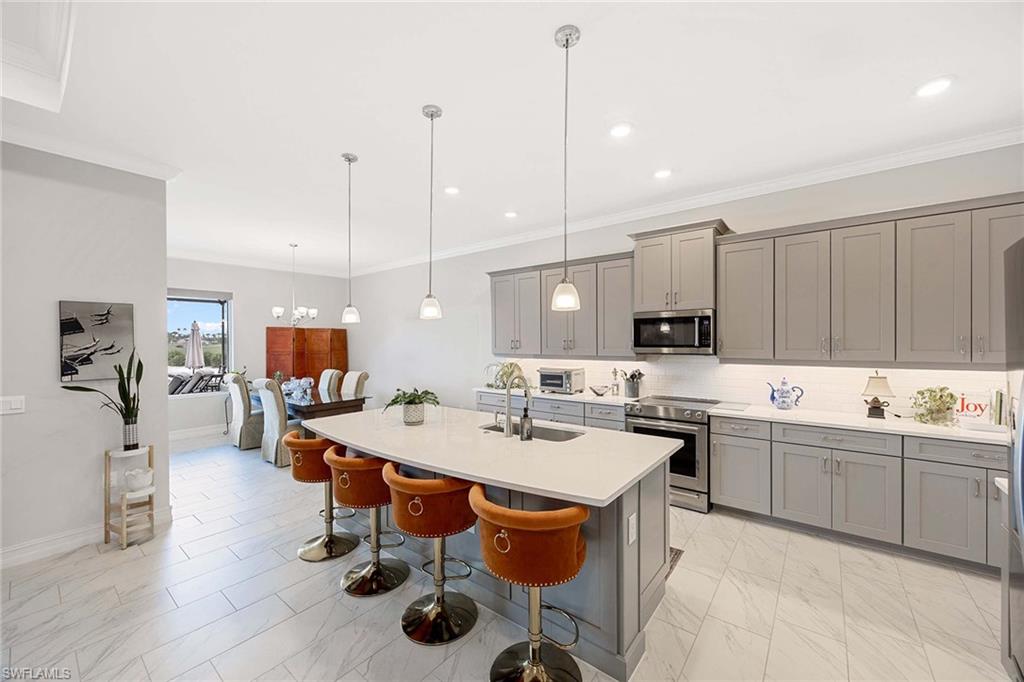 Enjoy refined Florida living in this impeccably maintained residence located at 18652 Royal Hammock Boulevard in Royal Palm Golf Estates. Positioned along the 10th fairway and green of Eagle Lakes Golf Course, this three-bedroom plus den, three-and-a-half-bath home spans 2,585 square feet and offers sweeping golf and water views ideal for sunset enthusiasts. The interior features soaring tray ceilings and statuario-style white tile flooring throughout the main living areas. A wall of 8-foot sliding glass doors in the great room invites natural light and seamless indoor-outdoor living. The gourmet kitchen showcases bright quartz countertops, soft close cabinetry, a spacious center island, ample prep space and a large walk-in pantry—ideal for culinary pursuits. The primary suite is a private retreat with two walk-in closets and a spa-style bath featuring a dual-sink vanity, glass-enclosed shower and linen closet. The dining room, with glass panel windows, offers tranquil views of the expansive lanai and pool. The outdoor living area is designed for entertaining, featuring a custom pool within a screened enclosure and a dedicated outdoor kitchen hookup. A three-car garage and brick-paver driveway provide ample parking and storage. Set on an expansive homesite, this residence blends privacy with proximity to the best of Southwest Florida. Royal Palm Golf Estates is celebrated for its large lots and panoramic golf course vistas. Optional club membership is available, with all residents enjoying access to the community’s restaurant, lounge and pro shop. With optional golf, low HOA fees and no CDD, this home represents one of Naples' finest values. Experience unparalleled luxury, comfort, and location here, an absolute must-see. Each office is independently owned and operated. Equal Housing Opportunity.
