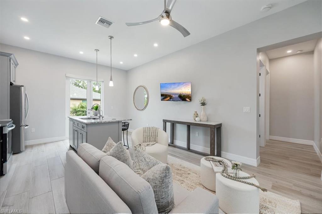 Look no further for your own Family Compound — three separate apartments under one roof! Tucked away in a serene, country-like setting minutes from Gulf beaches, this one-of-a-kind residence combines luxury, versatility, and privacy on a fully fenced 1.25-acre lot with dual electric gates. Designed with a courtyard-style floor plan, the home delivers 3,135 square feet of thoughtfully crafted living space with endless possibilities—ideal for multigenerational living, hosting guests, or generating rental income. The East Wing showcases an open-concept great room, a sunlit chef’s kitchen, a spacious primary suite with dual walk-in closets, a large den, powder room, and a two-car garage. The West Wing is equally impressive, featuring two independent suites—each with its own kitchen, living room, bedroom, bathroom, and walk-in closet—along with a laundry room and an additional two-car garage. At the heart of the property lies the expansive screened courtyard, where a heated lap pool, spa, and outdoor kitchen create the ultimate entertaining space. Outside, the property unfolds into a private retreat with two fenced pet runs, fruit trees, and a fire pit for evenings under the stars. Premium upgrades include a whole-house generator, 1,000-gallon buried propane tank, reverse osmosis system, metal roof, and wood-look tile flooring throughout. With its blend of elegance, flexibility, and location, this San Carlos Estates gem is truly unparalleled.
