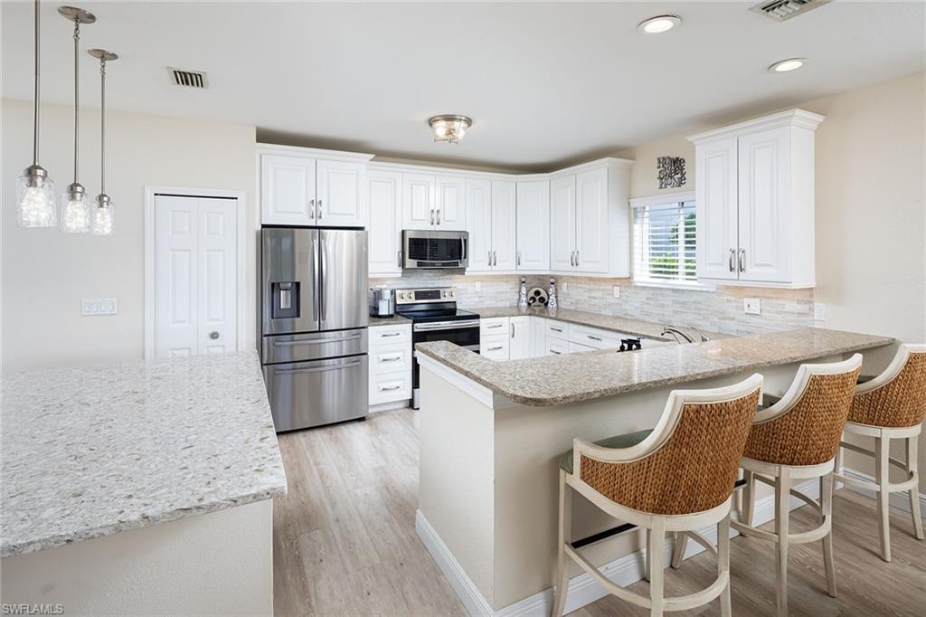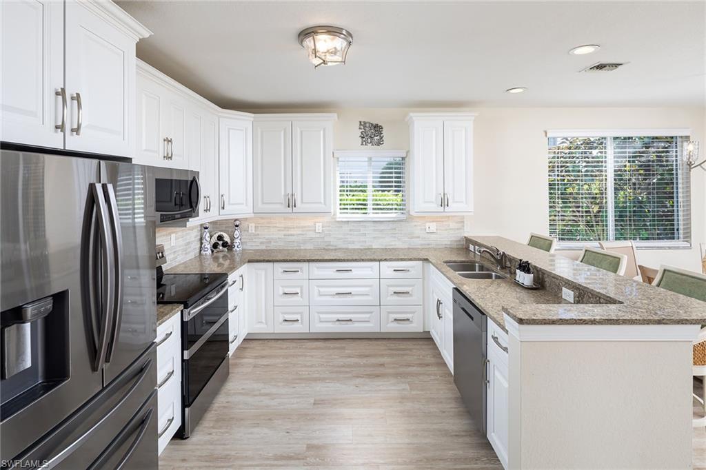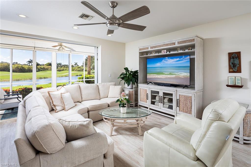 Delightfully sunny, this pristine end-unit coach home offers fabulous forever lake and golf course vistas of the picturesque seventh hole with no other buildings in sight, complete with preferred southern exposure. IMMEDIATE FULL GOLF MEMBERSHIP AVAILABLE. The light and bright airy feel is complemented by an open great room layout, fabulous renovated white kitchen is ideal for entertaining with large counter-level quartz island, beverage refrigerator, 42-inch cabinetry, stainless steel appliance package, new wide plank white oak LVT flooring, new light fixtures, fans and LED lighting throughout. Perched on one of the best lots in the complex with across the street to the community pool, eight guest parking spots and the mailboxes, this lovely condominium comes complete with one of the quietest locations in the development. Features include a wraparound lanai with pocket sliders and hurricane shutters, additional golf cart garage, newer building roof, loads of storage, main closet custom built-ins, large walk-in closet in one guest room, built-in desk in the other guest bedroom and paver driveway completes the package. Immediate full golf membership available in this one-of-a-kind club with an active lifestyle and a variety of memberships available (minimum social membership required). Estero Country Club offers a beautiful, award-winning Gordon Lewis golf course, recently renovated clubhouse with fabulous dining options inside and out, four tennis courts, six pickleball courts, state-of-the-art fitness center, bocce and an abundance of social activities throughout the year.