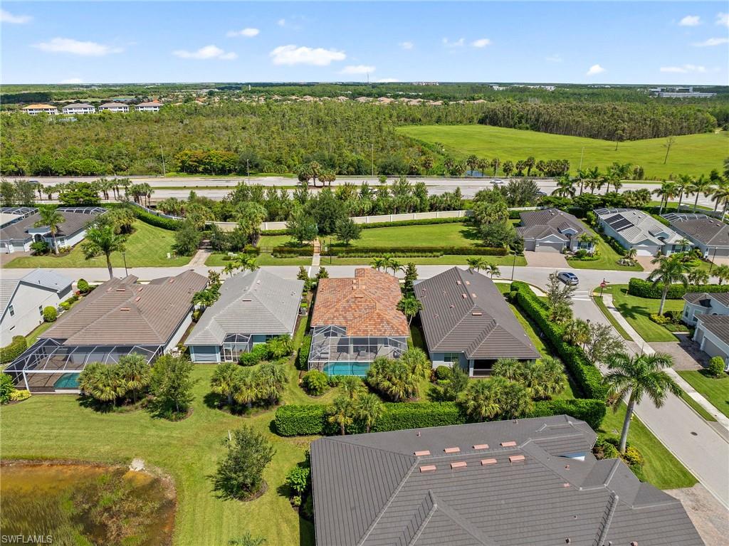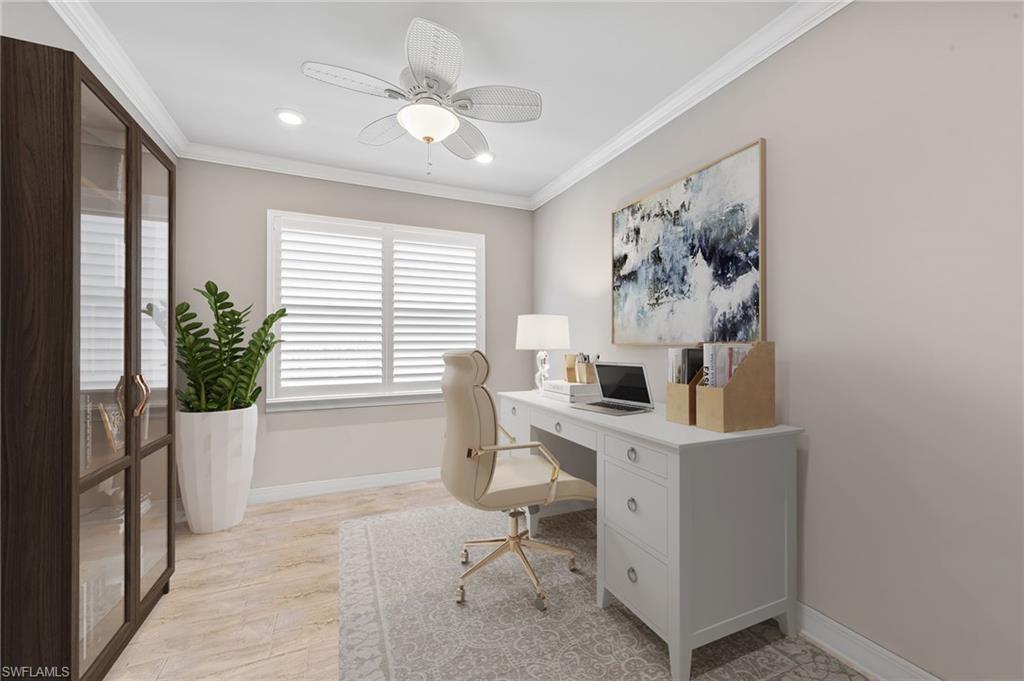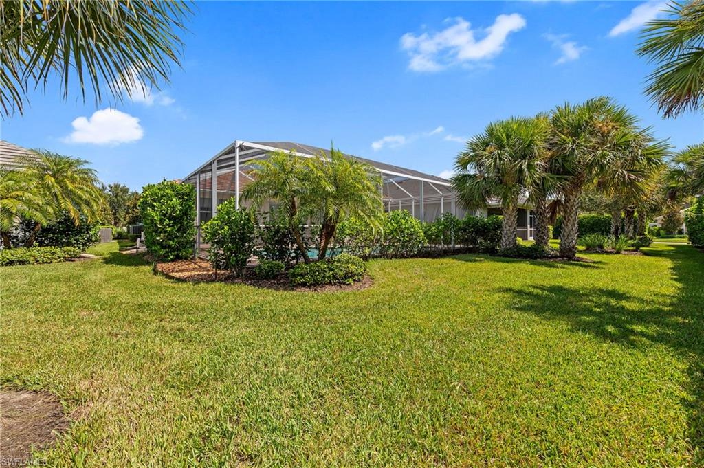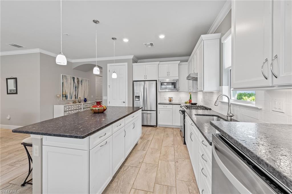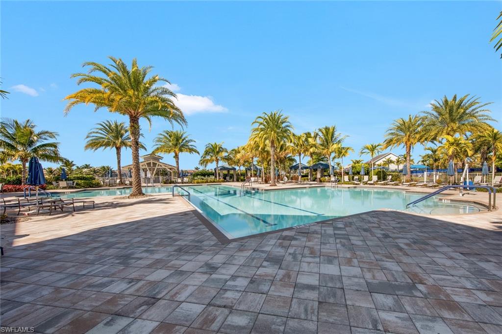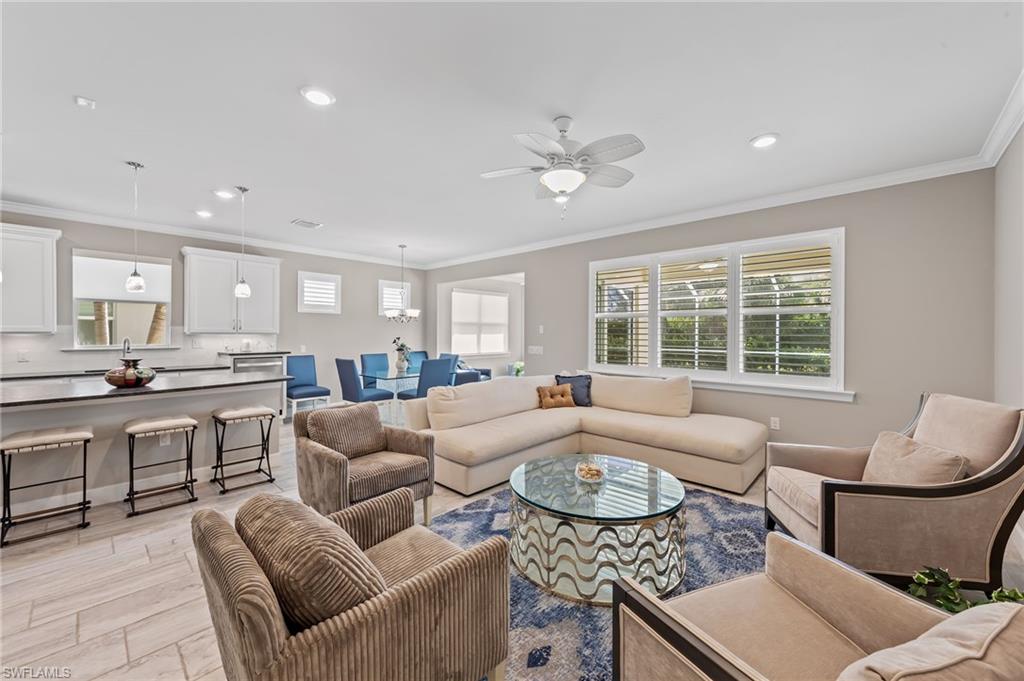 Welcome to Tidewater by Del Webb, an active adult community in Estero offering world-class amenities and vibrant social opportunities. This 2-bedroom + den, 2-bath pool home showcases a bright and open great room floor plan, perfect for entertaining. The kitchen overlooks the living area and features leathered granite counters, stainless steel appliances, and wood shaker cabinets. Tile flooring runs throughout, complemented by plantation shutters, custom window treatments, and crown molding in the main living spaces. The spacious primary suite includes a large walk-in closet with built-in cabinets and an ensuite bath featuring granite counters, dual sinks, a soaking tub, and a separate shower. A generous guest bedroom and large den share a beautifully finished bathroom with granite counters and a glass sliding shower door. Step through the sliding glass doors to your private outdoor retreat—complete with a sparkling pool, concrete paver deck, and expansive covered lanai, perfect for enjoying Florida’s year-round sunshine. A brand-new A/C was installed in June 2025 and there are impact glass windows and doors throughout. Tidewater’s resort-style amenities include a 13,000 sq. ft. clubhouse with fitness center, movement studio, activity rooms, library, and catering kitchen. Outdoors, residents enjoy a resort pool and spa, pickleball, tennis, and bocce courts, a dog park, community gardens, BBQ grill area, and a barefoot bar. With a full calendar of clubs, classes, and social events led by a dedicated lifestyle director, there’s truly something for everyone.