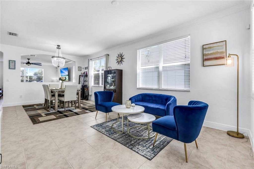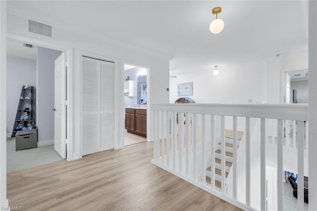 Water view home on the 17th tee of Valencia Golf & Country Club! No membership require. The sought-after Viansa Model offers 3,141 sq. ft. with 5 bedrooms, 3.5 baths, loft, and 2-car garage. First floor features tile throughout, formal living & dining, large family room, breakfast nook, and kitchen with wood cabinets, granite countertops, backsplash & stainless appliances. Upstairs includes 5 bedrooms, 3 baths, and loft. Oversized master suite with tray ceilings, crown molding & laminate flooring. Screened lanai with lake and gold views. Concrete block 2nd floor, accordion shutters & hurricane panels. Roof 2020. Low HOA fees with resort clubhouse, pool, fitness, library, media & game rooms. Growing area close to top schools, shopping, dining, healthcare, Big Corkscrew Island Regional Park, golf, casino, Randal Square & Randal at Orange Tree!