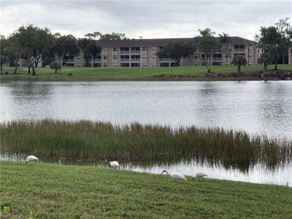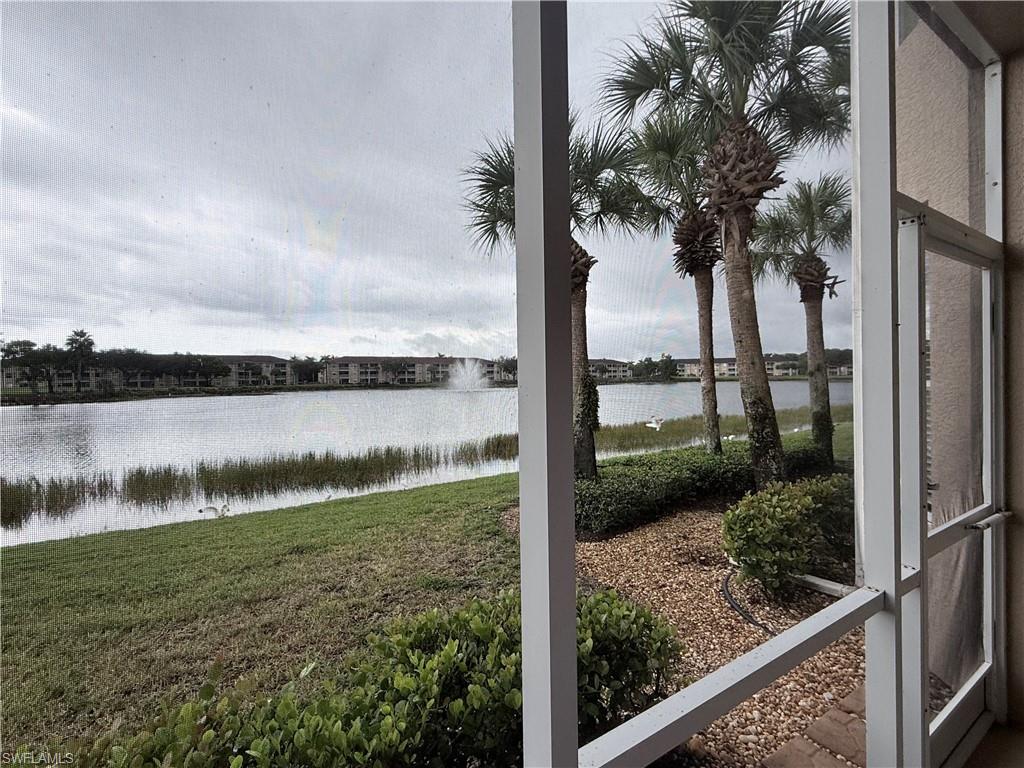 Don't miss out showing this unique open floor plan with the kitchen and living room overlooking the big lake and fountain. Brand new Whirlpool stainless appliances in the kitchen were bought in November 2024. The tasteful kitchen granite countertops were installed in 2024. All the interior fans were replaced. This condo faces east with the morning sun making it a light and bright condo for a first floor living at its best. NO STEPS. It is tastefully decorated in neutral colors and ready for your choice of furniture. Three community pools and walking paths plus a front and a back lanai and a detached garage for a very affordable bundled golf community in Naples Florida. Ideal location with shopping, banking, beaches and restaurants close by. This one will not be on the market long so hurry!