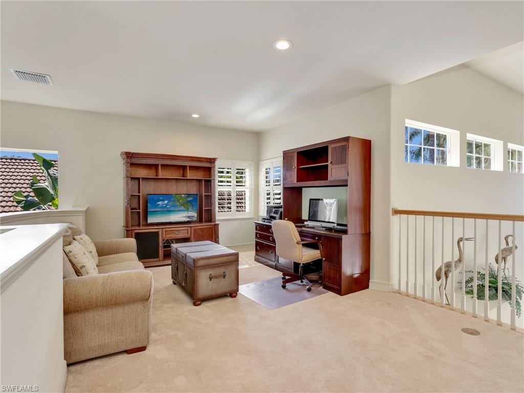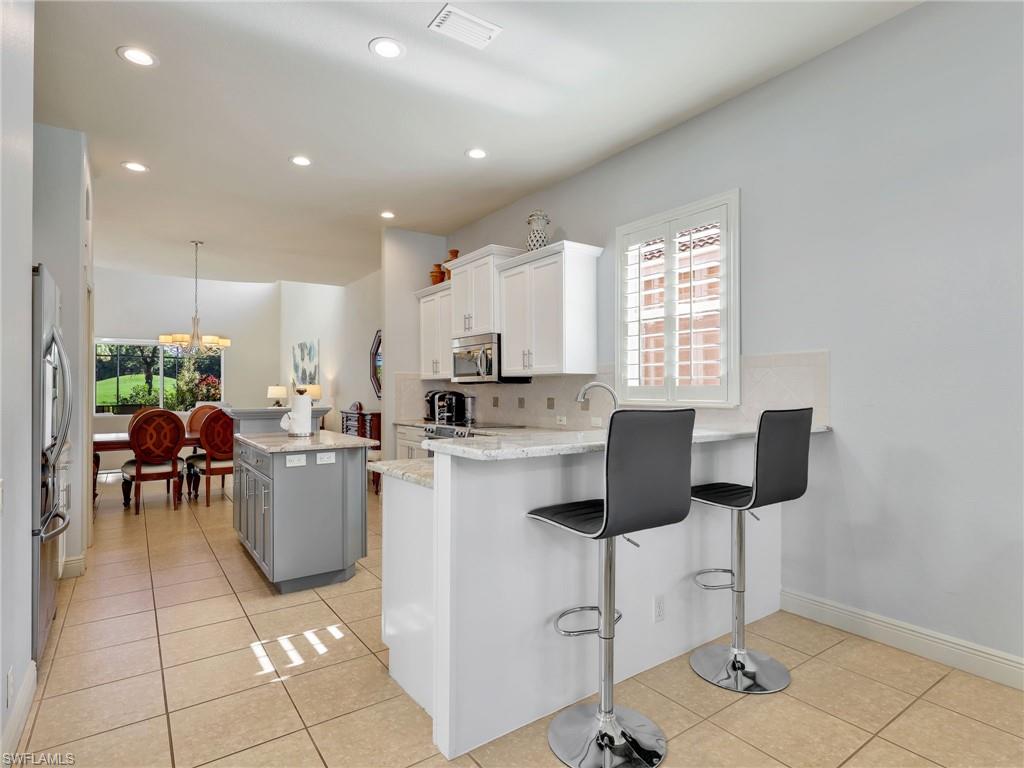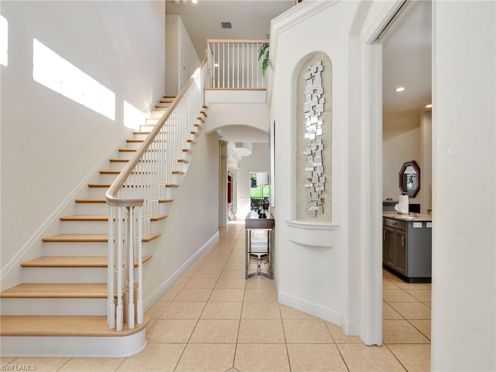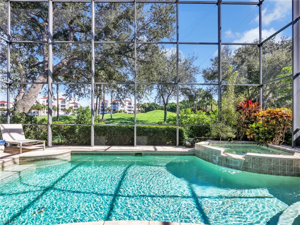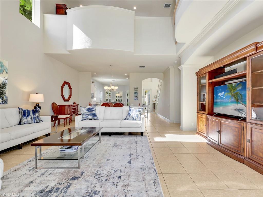 This stunning Pelican Marsh pool home is located in the sought after neighborhood of Ivy Pointe within the gates of prestigious Pelican Marsh. Located on the 9th hole and within walking distance to Pelican Marsh Country Club certainly makes this home a rare opportunity. Upon entering the 8ft doors, get swept away with the 14’ ceilings, the grand wood staircase and the open floor plan on the 1st floor. There is a lovely kitchen with tile on the diagonal and white cabinetry that overlooks the eat in kitchen & triple windows. The dining room is inviting and seats 8 comfortably. Entering the primary living space, you experience the soaring ceilings and can enjoy overlooking the 9th hole and oversized salt water pool / spa. The patio area allows for expanded seating and accommodates outdoor dining for family & friends. The primary bedroom is well positioned on the first floor and offers extended living overlooking the pool and golf course. The primary bathroom is spacious with both a walk in shower and tub. The den, located off the kitchen is light and bright and is perfect for work from home families. Upstairs, you will find an oversized bonus room great for a 2nd living space. There are two very generous bedrooms and a jack & jill bathroom between the bedrooms for the ultimate privacy. There is an upstairs balcony perfect for evening drinks or your morning coffee. The home boasts plantation shutters and neutral paint colors perfect for any color palette. These owners have thought of everything in preparing this home for its next family and have gone to the expense of making sure all the major functions of this home offer the next owner peace of mind. These upgrades include a 2.5 yr pool pump and pool heater, a 4 yr old tile roof, an 2.5 yr old upstairs Carrier AC and the lower floor Trane AC installed in 10-2025. This home has been well cared for and offers an unparalleled opportunity for ownership in the well located community. Located in Non flood zone X. Pelican Marsh is a private gated amenity-rich community offering a top tennis & pickleball program, a state of the art exercise facility, bocce ball courts and the wonderful Court Side Restaurant. Pelican Marsh Golf Club has numerous membership options including social, dining and full golf. This spectacular community is located in prestigious North Naples where shopping, entertainment, restaurants and the white sugar sand beaches of Naples are just outside the gates of this community.