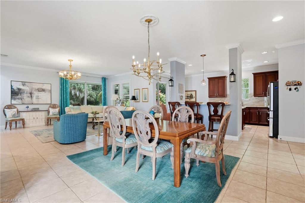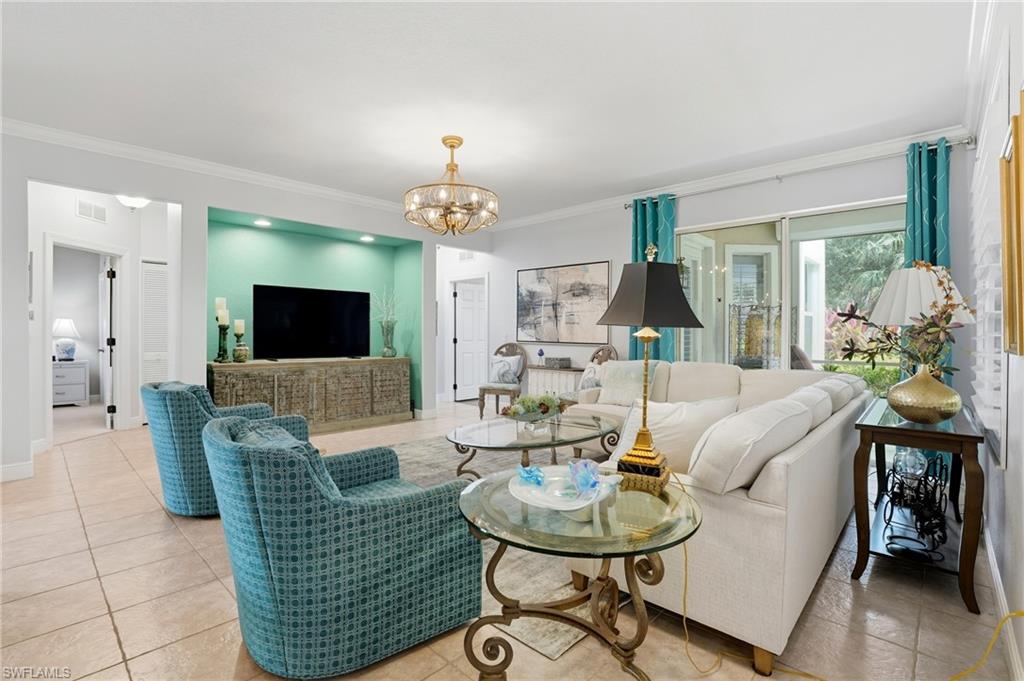 Experience the epitome of Naples living at Naples Lakes Country Club—home to the renowned Arnold Palmer Signature bundled golf course. This impeccably maintained residence spans 2,063 square feet of thoughtfully designed living space, offering two bedrooms plus a den and two full baths.The open-concept floor plan is anchored by an extended quartz-topped kitchen island and enhanced by refined finishes throughout—plantation shutters, crown molding, a frameless shower in the primary suite, and a newly refreshed guest bath featuring a quartz vanity, designer backsplash, updated lighting, and fresh paint. A stunning great room and formal dining area flow seamlessly to the screened lanai, a tranquil retreat showcasing serene southeast views of the 13th hole and lush preserve. Outfitted with elegant tile flooring and power storm protection, this inviting space is ideal for both effortless entertaining and quiet relaxation in true Naples style.The private owner’s suite opens directly to the lanai and features a custom walk-in closet and a spa-inspired bath with dual vanities, soaking tub, and walk-in shower. A versatile den with double-door entry serves beautifully as a home office or third bedroom, while the spacious guest suite offers comfort and privacy near the newly updated bath. Additional highlights include an attached two-car garage with epoxy flooring, a paver driveway and walkway, and beautifully manicured surroundings. As a resident of Naples Lakes, you’ll enjoy an extraordinary lifestyle with bundled golf privileges on the celebrated Arnold Palmer Signature Course, along with world-class amenities—resort-style pool, state-of-the-art fitness center, tennis, bocce, dining venues, all just minutes from 5th Avenue South, pristine beaches, and RSW Airport. *** Pickleball is approved by the community and coming Soon!
