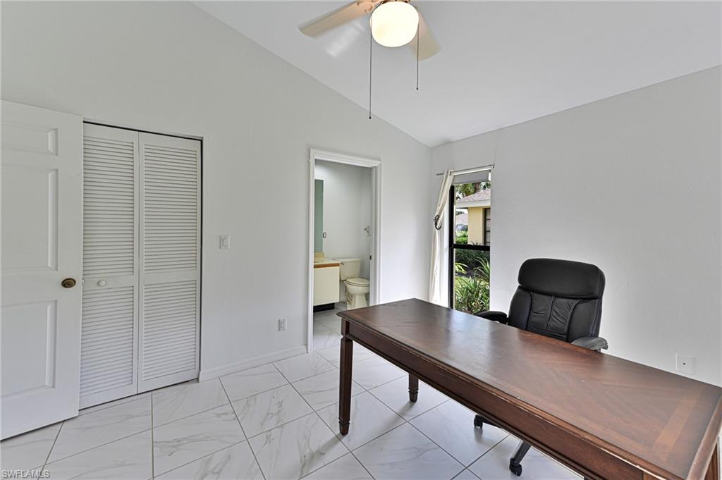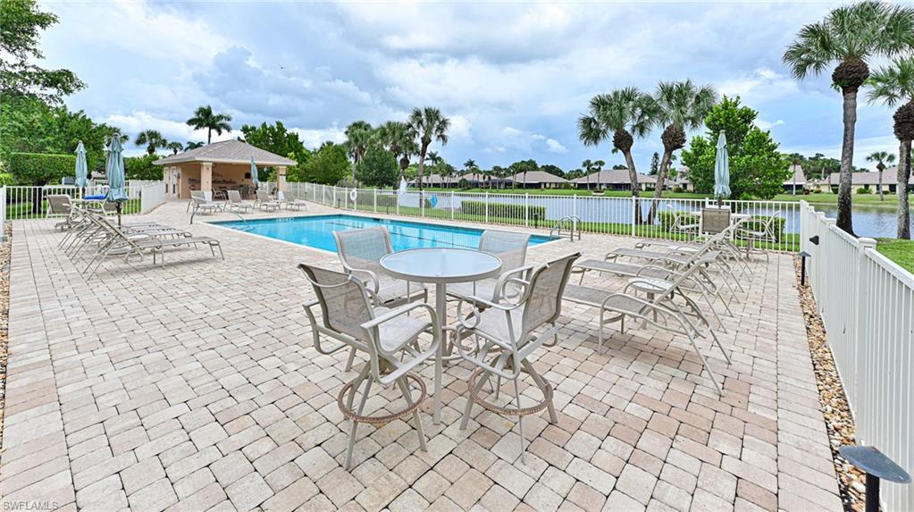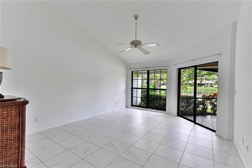 This Imperial Park Place lakefront Villa is located in one of Naples most established, desirable communities, Imperial Golf Estates. This home features 1763 square foot of total living area including open floor plan where the kitchen, dining room, and great room all have wide lake views through the screened lanai plus 2 bedrooms with en suite baths and a half bath. The master bedroom has direct access to the screened lanai and walk in closet. There is also a wet bar, laundry, attached garage, vaulted ceilings, fresh paint and large yard area. The private setting with wide views of the lake and fountain are hard to find at this price point. Imperial Park place offers pool with restrooms and gathering area. Imperial Golf Estates has optional memberships with renovated Clubhouse, two championship golf courses, Driving range and short game area, and Putting green, Recreation and fitness, Resort-style community pool and spa, Tennis courts, Bocce ball court, Pickleball courts, Fitness room, Miles of winding trails for biking and jogging, Clubhouse with fine and casual dining options, Activities like wine tasting, themed parties, and social mixers, Games such as mahjong, bingo, and bridge, Off-site activities like trips to art galleries, museums, and shopping. This perfect North Naples location is close to great beaches including Barefoot Beach, Delonor Wiggins State Park and Vanderbilt Beach plus Mercato, Coconut Point, Waterside Shops, and other dining and entertainment options. No Flood insurance required.