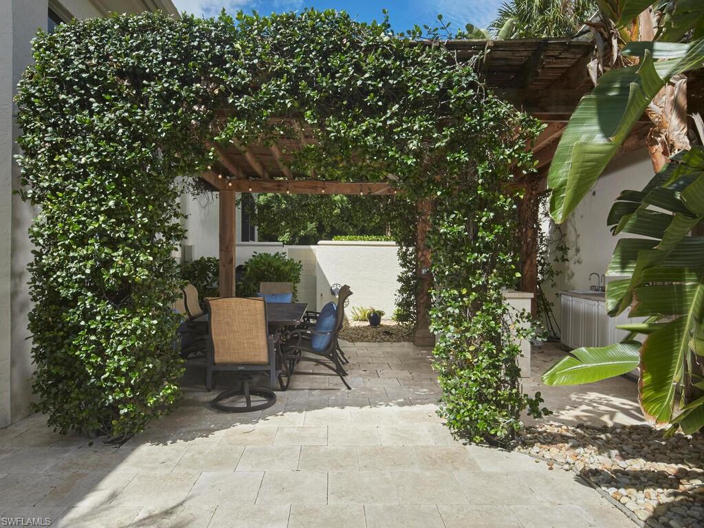 Tucked within the exclusive gates of Grand Isle at Pelican Marsh, this luxury courtyard home blends elegance, privacy, and resort-style living in the heart of Naples. The main residence offers two spacious bedrooms plus a den and two and a half baths, showcasing rich dark wood floors that add warmth and sophistication throughout. Across the tranquil courtyard, a private guest casita provides an additional bedroom and full bath, ideal for visitors or a home office retreat. The courtyard oasis is the centerpiece of this home — featuring a pergola-shaded outdoor living space with a fully equipped outdoor kitchen, lush tropical landscaping, and seamless indoor-outdoor flow perfect for alfresco dining and entertaining. Inside, light-filled living areas open to serene garden and courtyard views, creating a sense of calm and connection to nature. Located in one of Naples’ most sought-after gated communities, residents enjoy 24-hour security, tennis and pickleball, state-of-the-art fitness facilities, and a vibrant community center with an abundance of activities! Just minutes from the beach, fine dining, and upscale shopping at Mercato and Waterside Shops, this Pelican Marsh retreat offers the perfect balance of luxury and tranquility.