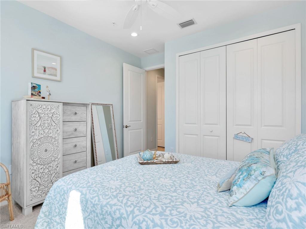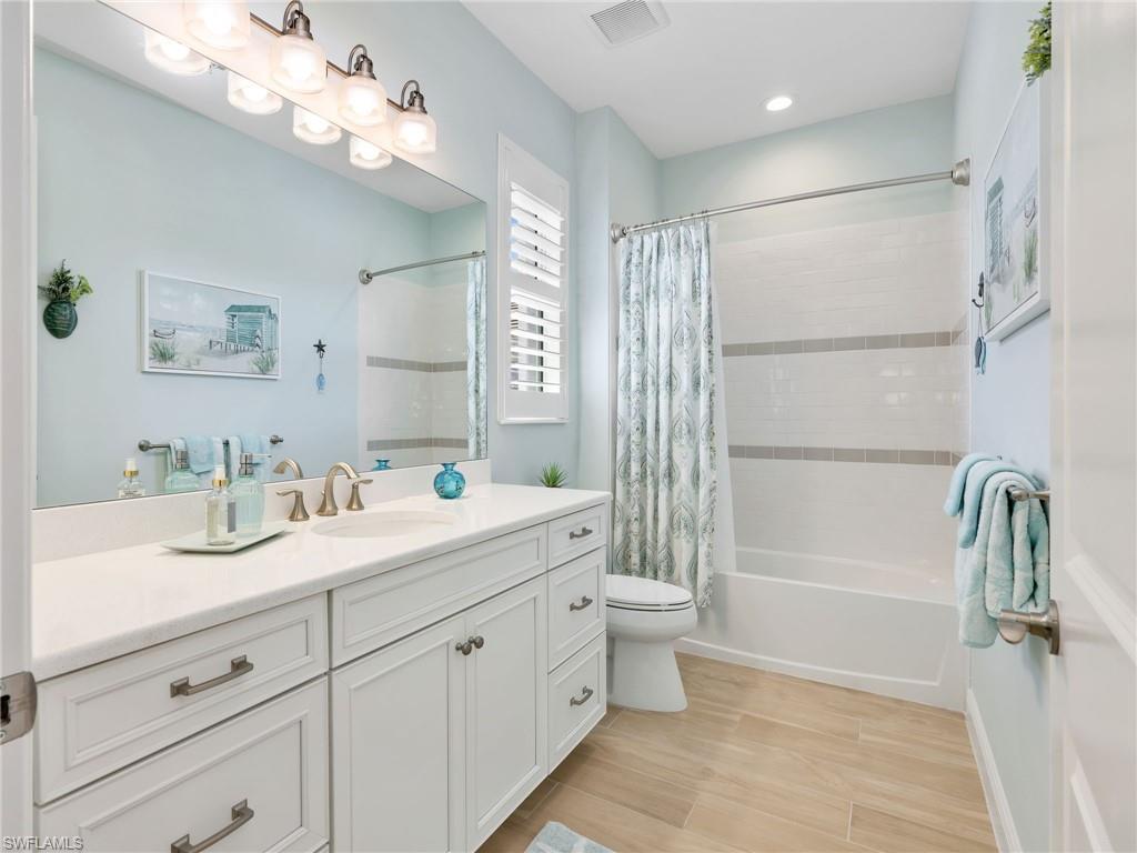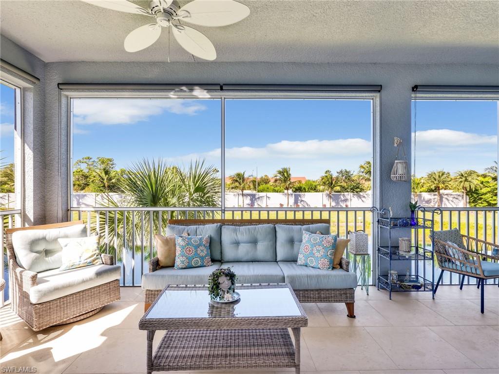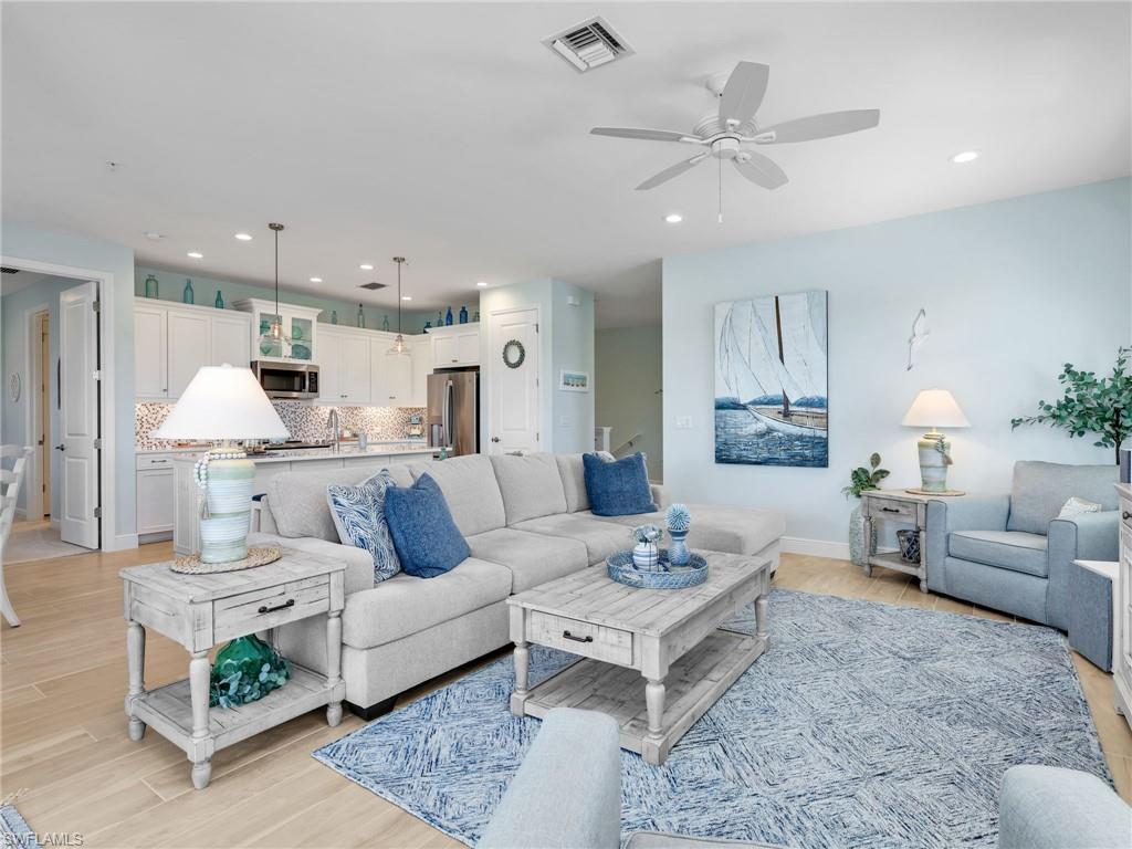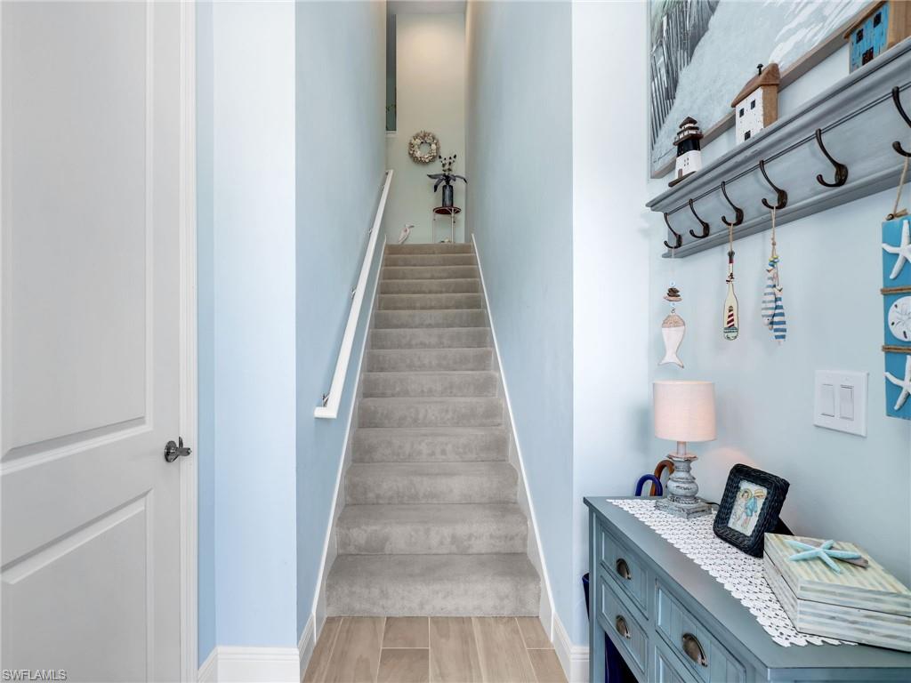 Welcome to your piece of paradise in the sought-after community of Seychelles, just minutes from downtown Naples and the Gulf’s white sandy beaches. This beautifully appointed carriage home is the only 2nd floor residence in the community with a sparkling lake view on two sides of the lanai — the perfect setting to enjoy gorgeous sunsets from your spacious screened lanai. Inside, you’ll find an inviting open-concept design that blends comfort and elegance. The chef-inspired kitchen features a large island, quartz countertops, 42-inch upper cabinets, a decorative backsplash, stainless steel appliances, and stylish pendant lighting — ideal for entertaining or everyday living. The home showcases wood plank tile flooring in the main living areas, with carpet in the bedrooms for added comfort. Elegant window coverings and plantation shutters enhance select spaces throughout the home, creating a warm and refined atmosphere. Glass French doors lead to the den, which offers flexibility as a home office, hobby room or reading nook — all while capturing a tranquil view of the lake and picturesque fountain. The primary suite is a serene retreat featuring beautiful lake views, decorative drapes, a spacious walk-in closet, and a spa-like bathroom with dual sinks, a large walk-in shower, and a separate water closet. Additional highlights include this home having one of longest driveways in the community, providing convenience, and a garage with epoxy flooring. Residents of Seychelles enjoy resort-style amenities, including a large community pool, hot tub/spa, well-equipped fitness center, and a beautiful clubhouse surrounded by tropical landscaping and palm trees. Located just a short drive from 5th Avenue South, 3rd Street South, Tin City, the Naples Botanical Gardens, Naples Zoo, Baker Park, Cambier Park, the Gordon River Greenway, the Naples Philharmonic, countless golf courses, and the National Pickleball Center, this home offers easy access to the best of Naples’ dining, shopping, culture, and recreation — as well as the pristine white-sand beaches of Naples and Marco Island. Furniture is negotiable. *Please watch the video.*