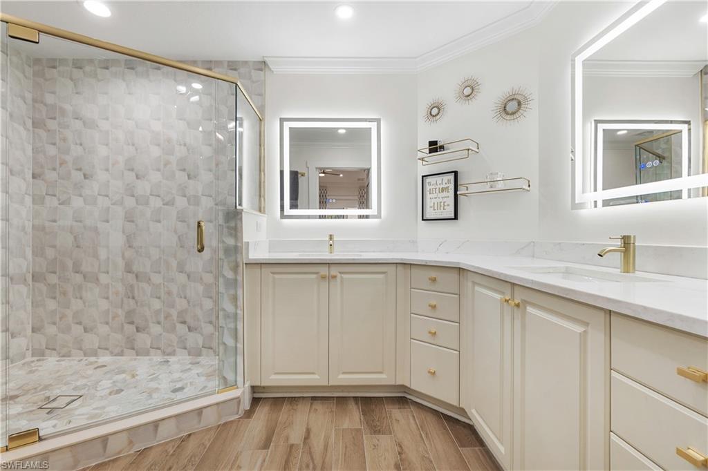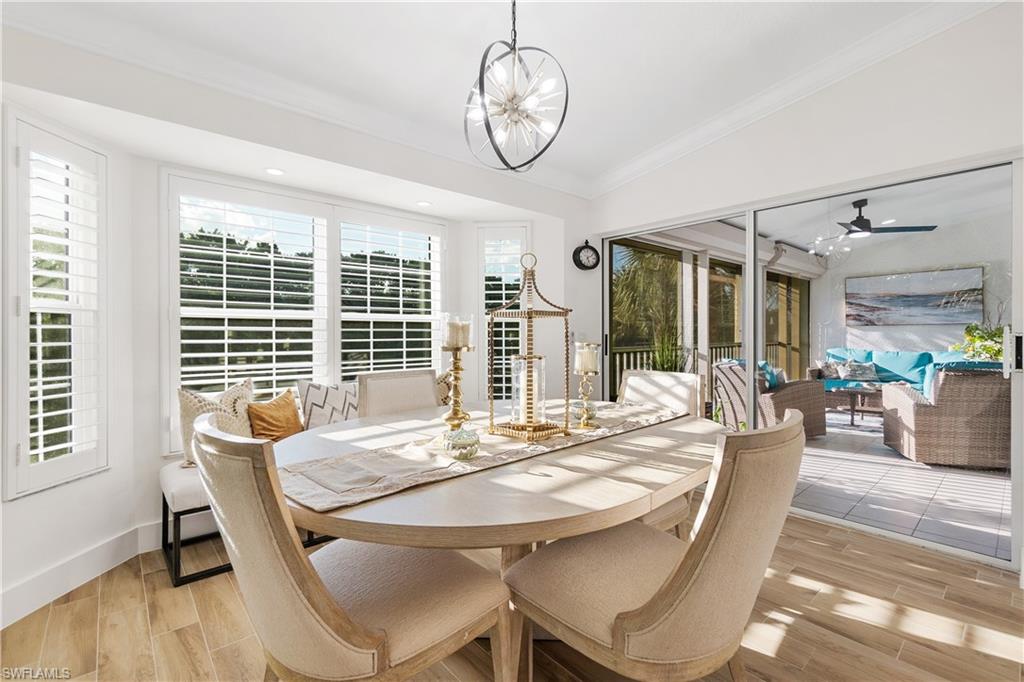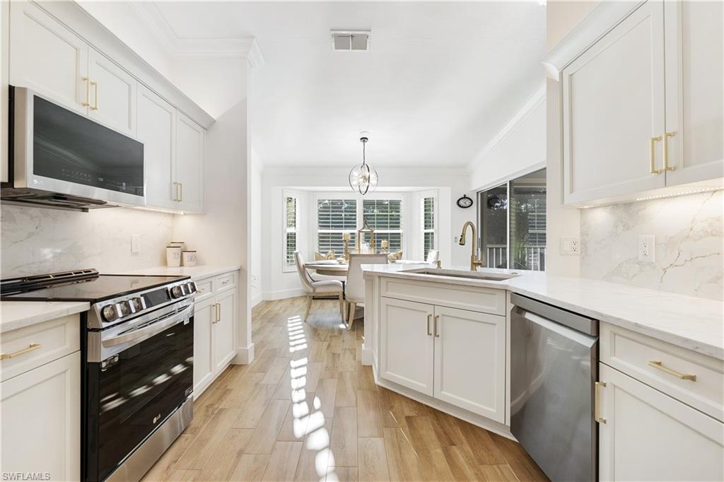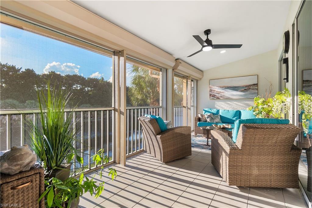 Contemporary Elegance.....Located into one of Estero FL's prestigious golf course communities, Grandezza Country Club, this immaculate totally renovated 3 bedroom, 2 bathroom with den coach home offers the perfect blend of contemporary elegance, comfort and resort-style living for both intimate gatherings and lively entertainment! As you step into this beautifully appointed coach home, the spacious and sun-filled open floor plan flows seamlessly in a secluded setting. The updated kitchen features all new appliances, quartz countertops, soft-close cabinets and designer lighting. The home has Hunter Douglas window shades, custom entertainment bar, title flooring, crown molding, plantation shutters, updated A/C, impact windows and electric hurricane shutters. The primary suites offers a relax setting with water views, generously sized custom walk-in closets and a beautifully appointed primary bathroom with dual sinks. The two additional bedrooms are spacious with walk-in closets and a thoughtfully designed "Jack & Jill" bathroom, making it the ultimate guest or family floor plan design. A versatile den provides the ideal space for a home office or additional quest space and the screened lanai offers great sun set views. This end unit has additional parking area with the attached epoxy floor 2 car garage. Situated within walking distance to the community clubhouse and pool makes this a highly desirable home. Grandezza Country Club features an Olympic size pool, cabana, fitness/wellness center, casual/fine dining, 18 hole Championship Golf course, tennis and many social events. Close to I-75, SWFL International Airport, shopping, restaurants and FGCU makes this a prime location in Estero FL