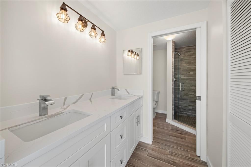 Positioned on the desirable south end of Fort Myers Beach, this fully renovated 2-bedroom, 2-bath end-unit condo is the perfect blend of modern luxury and investment opportunity. With housing in high demand as the island continues to rebuild, this unit offers exceptional flexibility for 2-week, monthly, or annual rentals—making it an ideal income-producing property or personal beach retreat. Step inside to discover a bright, open layout with a split-bedroom design for optimal privacy. The brand-new kitchen showcases quartz countertops, soft-close cabinetry, and all-new stainless steel appliances. The primary suite impresses with dual sinks, an updated walk-in shower, and a spacious walk-in closet. Every inch of this residence has been upgraded—from new plumbing and electrical, moisture-resistant sound-barrier flooring, and modern fixtures and fans, to fresh baseboards, outlets, and switches throughout. Relax on your private lanai overlooking the pool, complete with new screens, railings, and fresh exterior paint. The building itself has been fully restored after Ian, with a new roof, brick pavers, working elevator, and all assessments paid—truly turnkey peace of mind. Nestled within Captain’s Bay, this prime south-end location offers easy access to Santini Plaza’s Farmers Market, Lovers Key State Park, and Flipper’s on the Bay, with the Beach Trolley and Margaritaville Resort just minutes away. Enjoy the Gulf breezes from your spacious balcony accessible from both the living room and primary bedroom. This pet-friendly community allows 2-week rentals, offering unmatched income potential at an incredible moment to secure your slice of paradise on Fort Myers Beach.