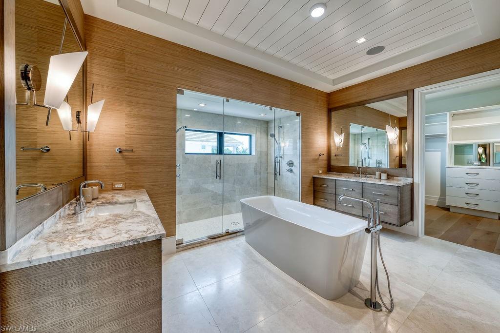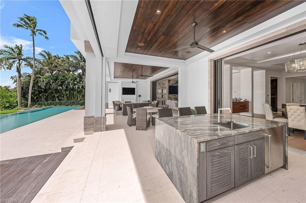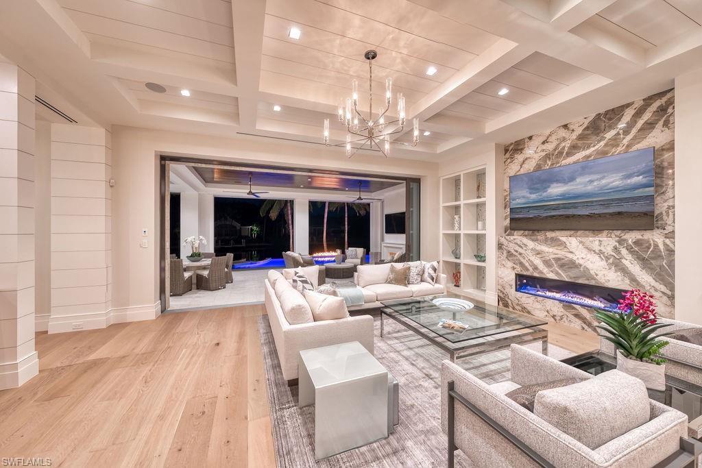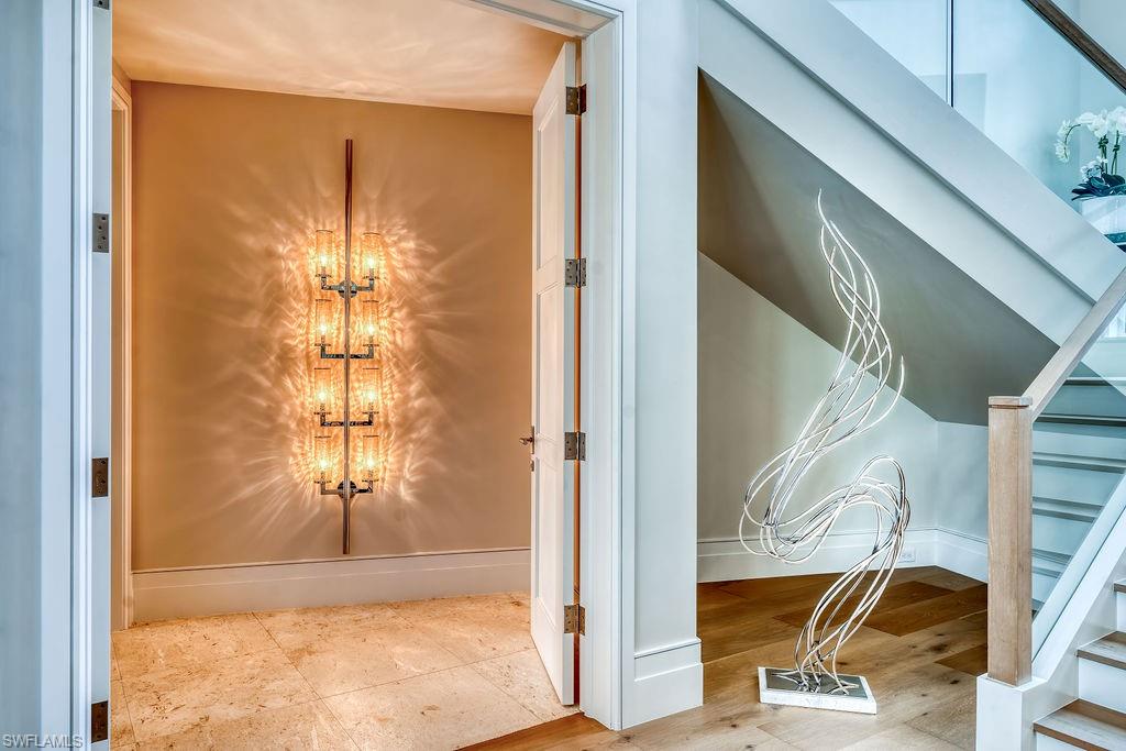 Key enhancements are underway to improve this already remarkable property!! Just beyond its stately front gates lies one of the most exciting New Construction opportunities on the market today. With 140 feet of water frontage this magnificent home built by A. Vernon Allen Builder can accommodate a large boat and provides no bridge access to the Gulf. Delivering a coastal-inspired aesthetic this home features a show-stopping 80-FOOT POOL AND SPA COMPLEX with a 3-sided infinity spill-over edge, linear fire features, sun shelf, Brazilian hardwood decking and an embedded firepit. Sliding glass doors fully pocket away for a seamless transition from the expansive outdoor area to a spacious interior which includes: 2 sumptuous primary suites (one upstairs and one downstairs), 4 guest suites, whole-home generator, thoughtfully placed wood accents, an elevator, built-in wine nook, Lutron lighting system with Control 4 automation, a steam shower and an extended lanai with an outdoor pool bath. This impressive property exudes quality and is enveloped by lush, tropical landscaping. With a cul-de-sac location providing extra privacy you'll feel as though you’ve entered your own secluded resort; a world unto itself.