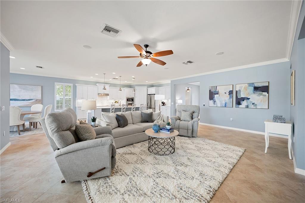 This fully updated three-bedroom, 2.5-bath home enjoys a prime setting and is on one of the desirable streets in the community. Featuring a bright, open floor plan and a refreshing coastal color palette with seamless tile flooring throughout, making it move-in ready. The ultimate relaxation awaits in the spacious lanai featuring a saltwater pool and spa. The recently remodeled primary bath offers a spa-like retreat, including an easy-access walk-in shower. The kitchen shines with new countertops, sink, backsplash and painted cabinets, all centered around a large island, complemented by a large walk-in pantry. Additional quality features include a generous main closet with custom shelving, new washer/dryer (2021), a 2023 refrigerator with icemaker, plantation shutters and full hurricane protection (including a remote-control lanai shutter). Additional features include newer remote-controlled garage door screen, newly installed transfer switch, making the home generator-ready!