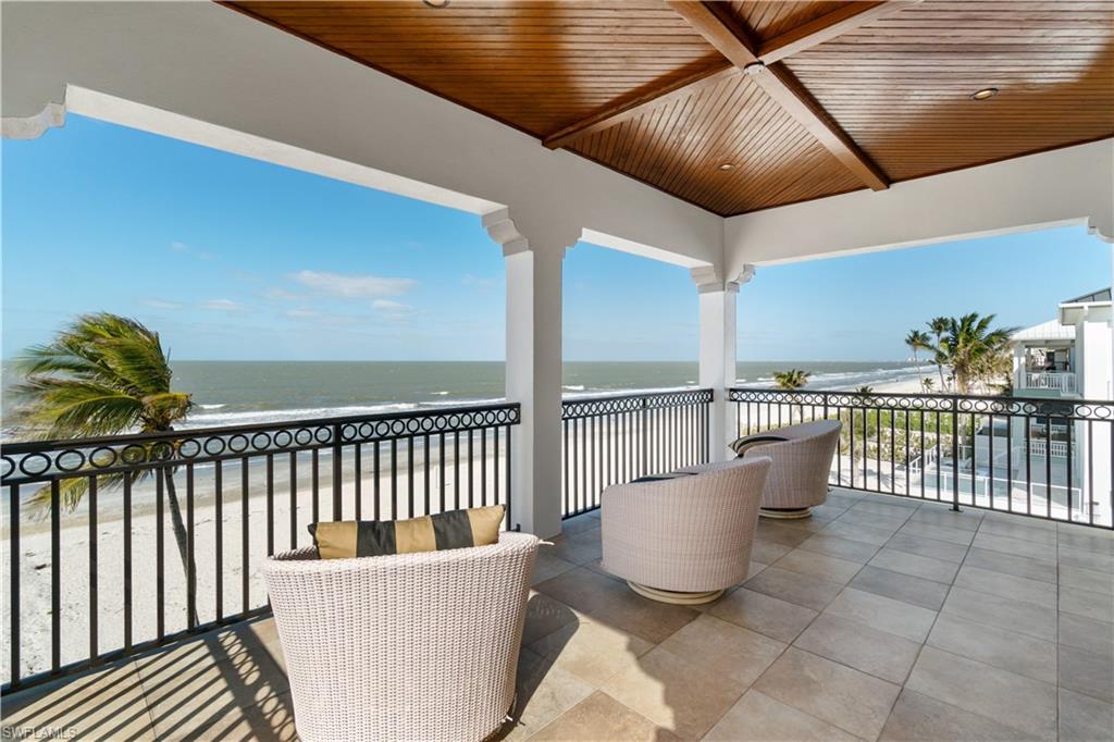 Stunning & newer-built beachfront home with breathtaking views of the Gulf, ideally situated on the highly coveted Bonita Beach. With unobstructed views of the turquoise waters and pristine white sands, this home is a true coastal gem. Built like a fortress, this home features all concrete-block construction and brand-new hurricane impact windows and sliders. Perfect for entertaining, the spacious open floor plan includes 4 bedrooms, 5.5 bathrooms, an expansive upstairs bonus room, and a versatile ground-floor flex space. Step outside to a private backyard oasis, complete with a RARE elevated pool and spa, a summer kitchen, and panoramic Gulf views. Inside, you'll find luxurious finishes throughout, including custom wood-paneled coffered ceilings and a seamless blend of hardwood and travertine tile flooring. The chef’s kitchen boasts granite countertops, an oversized island, light colored custom cabinetry, an eat-in area, and a breakfast bar perfect for casual dining. Adjacent to the kitchen is a custom bar area with a built-in wine cooler, wet bar, and additional bar seating—ideal for entertaining guests. The expansive primary suite offers a serene retreat with sweeping Gulf views, a private balcony to enjoy spectacular sunsets, and a spa-like bathroom with dual vanities, a frameless glass shower, and a separate soaking tub. The upper-floor bonus room is a versatile space, complete with an ensuite bathroom, wet bar with beverage cooler, and an open-air balcony—perfect for a media room, office, or additional living area. Additional features of this home include a private elevator and a smart lighting system. Close to several fantastic restaurants and only a 10-minute drive to Mercato and the Promenade, with Waterside Shops, Coconut Point, Naples 5th Ave, and the International Airport nearby. Live the ultimate coastal lifestyle with sweeping views of the Gulf—this is luxury living at its finest!