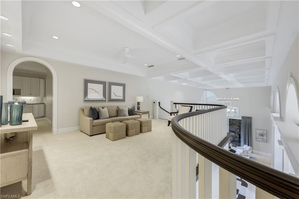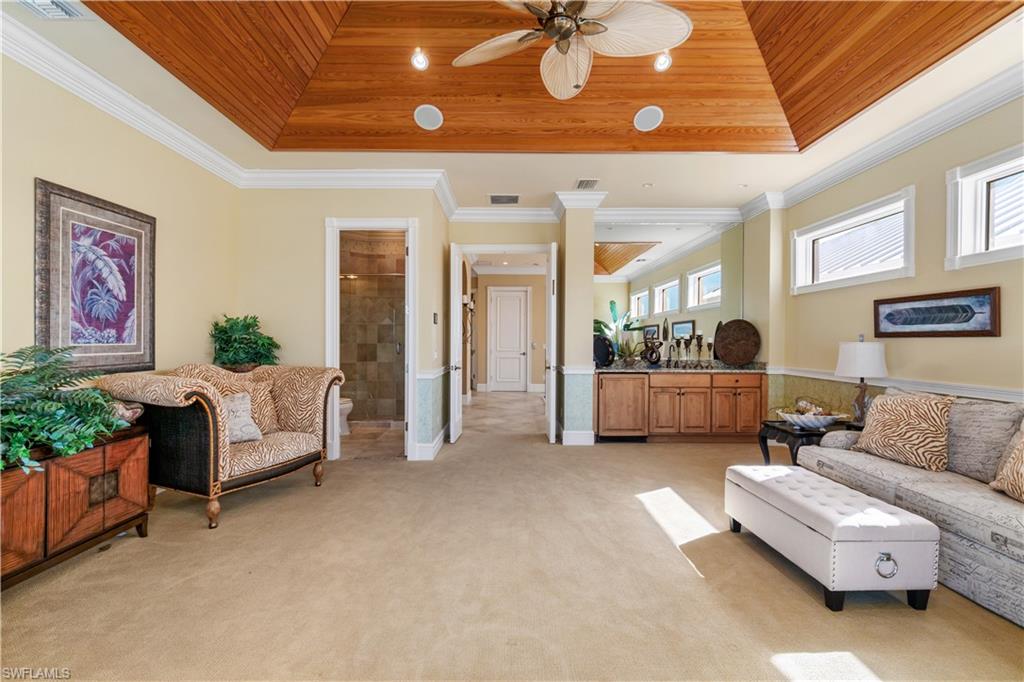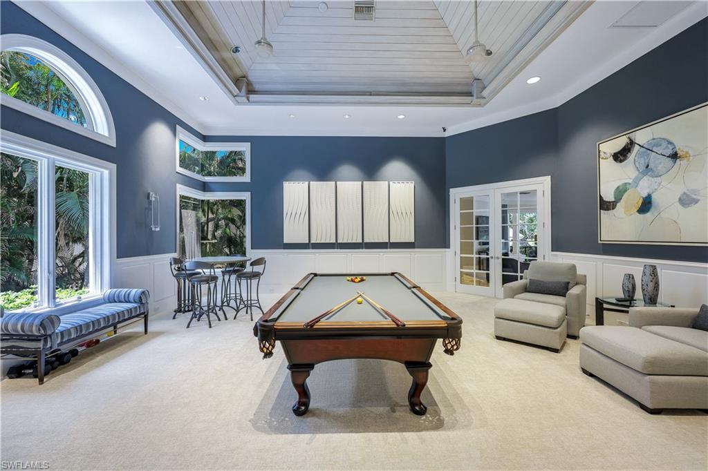 This Barefoot Beach 4 story home offers wide Gulf views from all levels over the beautifully landscaped beach garden and new resort style pool, spa, deck and fire pit. The floor plan boasts approximately 6,183 ac sq ft & 10,274 total sq. ft. Features include 4/5 bedrooms, office, flex room/cloud room with sit at bar, 4 full baths, 2 half baths, 6-car garage, private elevator, extensive millwork, stunning architecture, hurricane windows/doors & concrete construction. The main living level with open floorplan includes a gourmet kitchen with high end appliances including 48” gas range built in steamer & custom cabinetry, dining, and a great room with gas fireplace, built ins and tv above, all that open to a spacious lanai with outdoor kitchen. There is also a formal dining room, large walk behind bar, office, powder bath and a guest bedroom w/private bath. The third living level includes the master bedroom & 2 guest bedrooms w/private baths and a laundry room with 2 sets of washers and dryers. Wake up to the sounds of the Gulf from your oversized master suite with sitting area, large walk-in closet including quality built ins and a shoe closet The master bath offers jetted tub, bidet, walk in shower & his/her vanities and the master morning kitchen includes built in coffee maker, microwave, sink, wine cooler and refrigerator. The fourth floor is perfect for entertaining w/a bonus cloud room, sit at bar with full size refrigerator, microwave, sink and built in beer tap for entertaining guest and parties, home theatre room/ media room & sundeck overlooking the Gulf of America with ever changing sunsets. The exterior of the home was just repainted with new lighting installed, new upgraded garage doors ($60,000) installed, the all concrete garage features stucco walls and epoxy floor for easy maintenance and cleaning, and even the foyer walls are all concrete board with a smooth finish. This immaculate one owner home had very limited use, is in move in ready condition for a quick close as owners have moved to Arizona to be near family. Barefoot Beach homes amenities include gated entrance with 24 hour guard patrols, beach garden pool, private beach, tennis & pickleball courts, fitness & clubhouse. Option to purchase boat dock across the street - separate contract. Also option to join the Club at Barefoot Beach (located within the community) which offers casual and fine dining restaurants, pool & beachside food, drinks and chair service, indoor & outdoor bars, tennis courts with pro & a full events calendar. (waitlist with limited usage during wait period). Barefoot Beach is centrally located to dining, entertainment, golfing, arenas in Naples and Bonita Springs and is close RSW Airport, the Promenade, Coconut Point, Mercato & Waterside Shops and Old Naples. Note: Barefoot Beach is currently being renourished/widened and is slated to be completed in April 2025.
