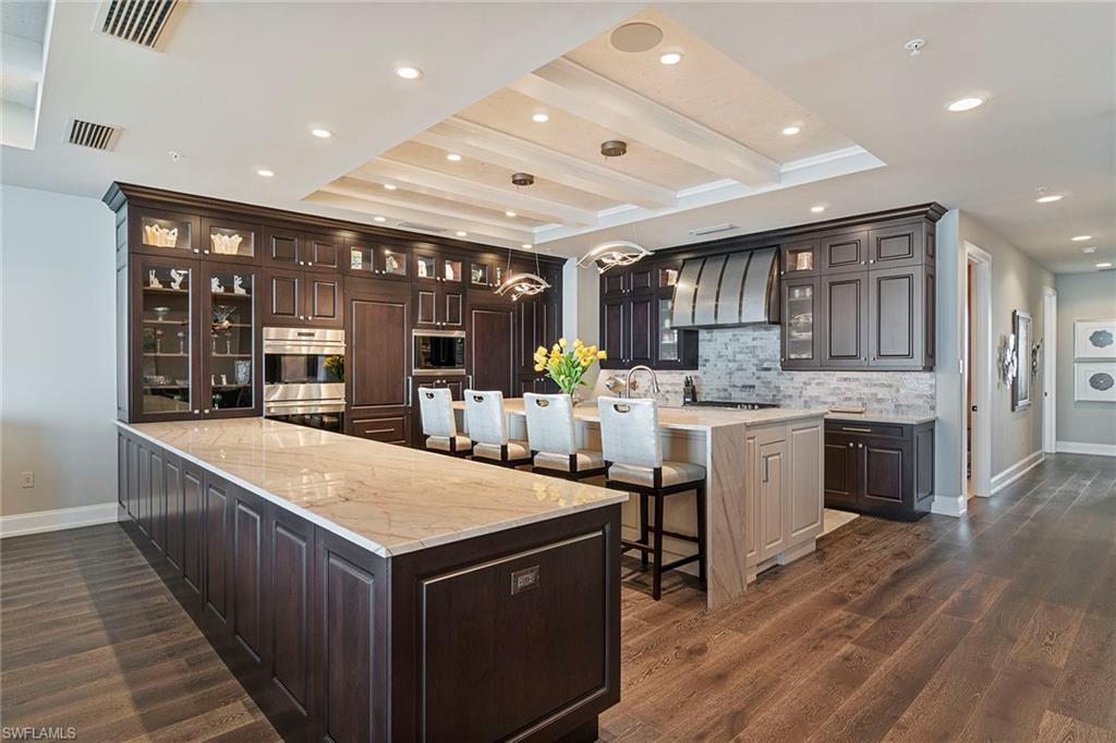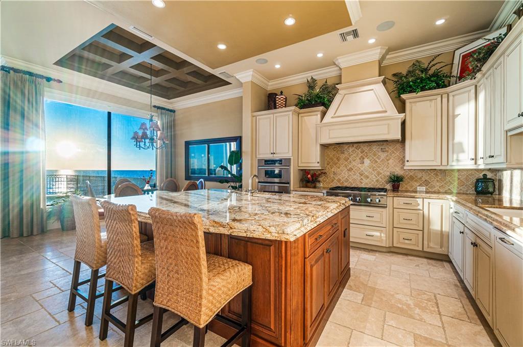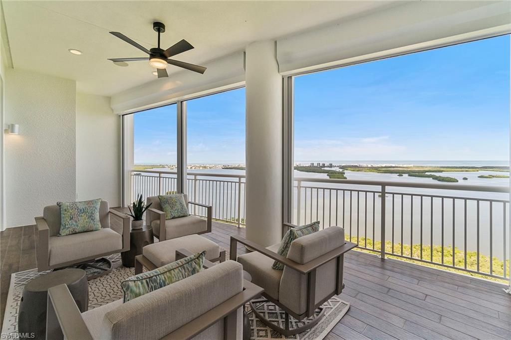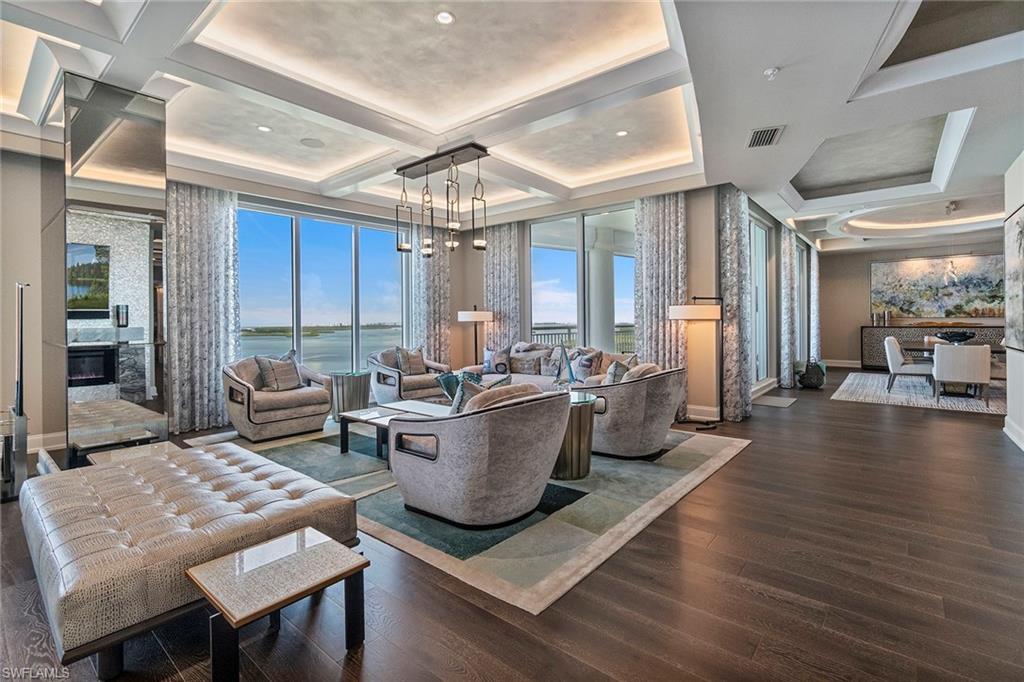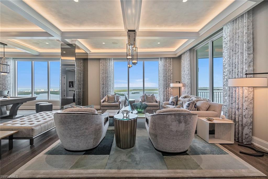 This iconic residence crowns the 23rd floor of Seaglass at Bonita Bay, where two units have been masterfully combined into a singular, 6,000-plus-square-foot designer showcase with expansive outdoor living. Every inch reflects opulence and visionary artistry by the renowned Collins & DuPont team, earning its feature in Florida Design Magazine for elevated, livable design. Framed by uninterrupted Gulf and Bay views through soaring floor-to-ceiling windows, the condominium offers a sensation of floating above it all like a bird in flight. Western-facing balconies offer retractable screens and hurricane shutters, creating year-round comfort and protection while delivering front-row seats to the Gulf’s ever-changing canvas and majestic sunsets. The great room flows effortlessly into multiple living and entertainment spaces: a piano nook, lounge area, pool table zone and dining—all anchored by a gourmet kitchen that would make any chef swoon. Rich wood tones contrast against crisp quartz countertops, a sprawling center island, and cabinetry that feels more like bespoke furniture. Even the view from the sink is striking. In the dining area, a custom wet bar elevates entertaining, while LED-lit radius ceilings add sculptural drama throughout. Even the powder room and laundry room shimmer with designer touches. The primary suite offers a serene, Gulf-facing retreat with a spa-style bath, oversized glass-enclosed shower, double vanities, and a boutique-style walk-in closet with multiple quartz islands. Two en-suite guest bedrooms on the east wing offer luxury and privacy for family and visitors. Two separate office spaces provide flexibility for remote work, hobbies, or can be easily converted into additional guest suites. A dedicated den offers an immersive cinematic experience. A private, air conditioned two-car garage and two additional parking spaces complete this rare offering. Your masterpiece in the sky awaits.