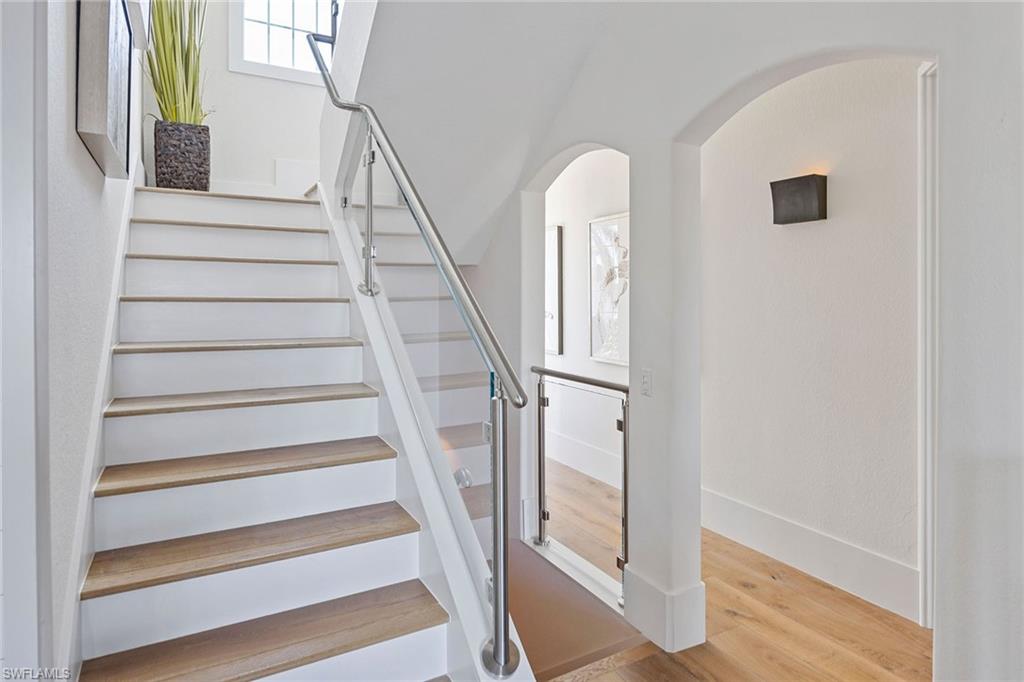 This 4 story coastal contemporary bayfront home offers the ultimate in Florida luxury waterfront living including: best location in the double gated community of Bayfront Gardens and within Beautiful Barefoot Beach, the home sits on 131 feet of waterfront and provides premier boating from your private 80’ Boat Dock with a 20,000 LB lift and quick access to the Gulf of Mexico with no bridges. It also has private beach access to the white sandy beaches of Barefoot Beach right across the street from the Bayfront Gardens entrance. Home was completed in 2018 and shows as new with the highest level of finishes, fixtures and workmanship throughout its over 8200 Sq Ft of living/entertaining space and nearly 4500 Sq Ft under air that includes an open floor plan with water views from every level and yet offers one of the most private settings you will find in all of Barefoot Beach. The first floor covered lanai has been finished to the same outstanding quality and selection of finishes of the rest of the home including a large summer kitchen with gas grill, refrigerator, full pool bath, plus an eating area all overlooking the private 95 ft pool deck with 7 ft waterfall, spa & flowing fire pots that offers a spectacular day and night setting. Features include volume & vaulted ceilings, wall & ceiling details with endless millwork including beams, square edge tongue & groove on every level, Wide plank European oak wood floors, upscale cabinetry throughout the home including a gourmet kitchen that was designed by Allikriste Cabinetry, the highest levels of countertops available, appliances including 48" Wolf Range, all Sub Zero refrigeration, Miele coffee maker, 2-ovens, warmer, steamer, microwave, full size wine cooler, morning bars, one touch lighting, private elevator to all 4 floors and garage space for 3 cars. The main level is full of natural light including the great room which offers custom cabinetry, large screen tv and audio video components, den/office is conveniently located off the great room, a large deck with water views is just off the dining room and the kitchen is open to all the areas. There are 4 Bedrooms, 5 1/2 baths, that include a master suite, 2 guest bedrooms with en suite luxury baths, plus a 4th floor suite with bedroom, full bath, living room, morning bar and deck with forever water views or you can use it as a cloud room for second entertaining area. The outside of the home offers one of the most appealing designs and street appeal in the community and includes white stucco, shutters, standing seam metal roof, oversized corbels, impact glass garage doors tropical landscaping and lighting package for the ultimate evening entertaining. Barefoot Beach is one of Collier County’s finest gated beach communities and provides 24 hour guard patrols, one of the highest ranked beaches in the country and simply an amazing place to live.