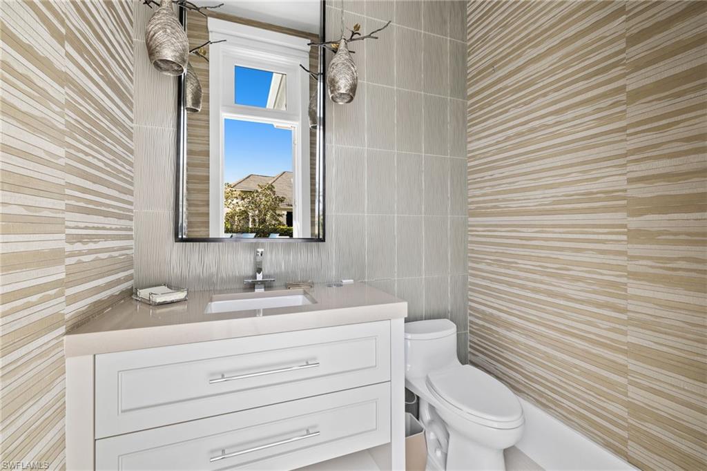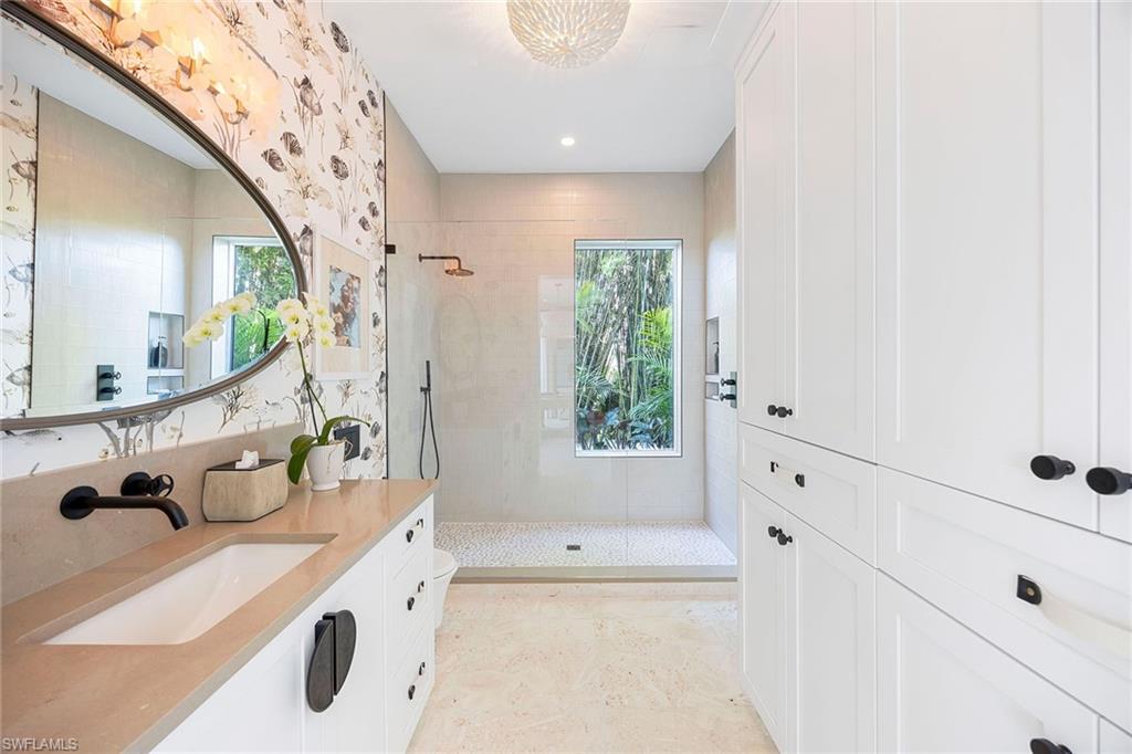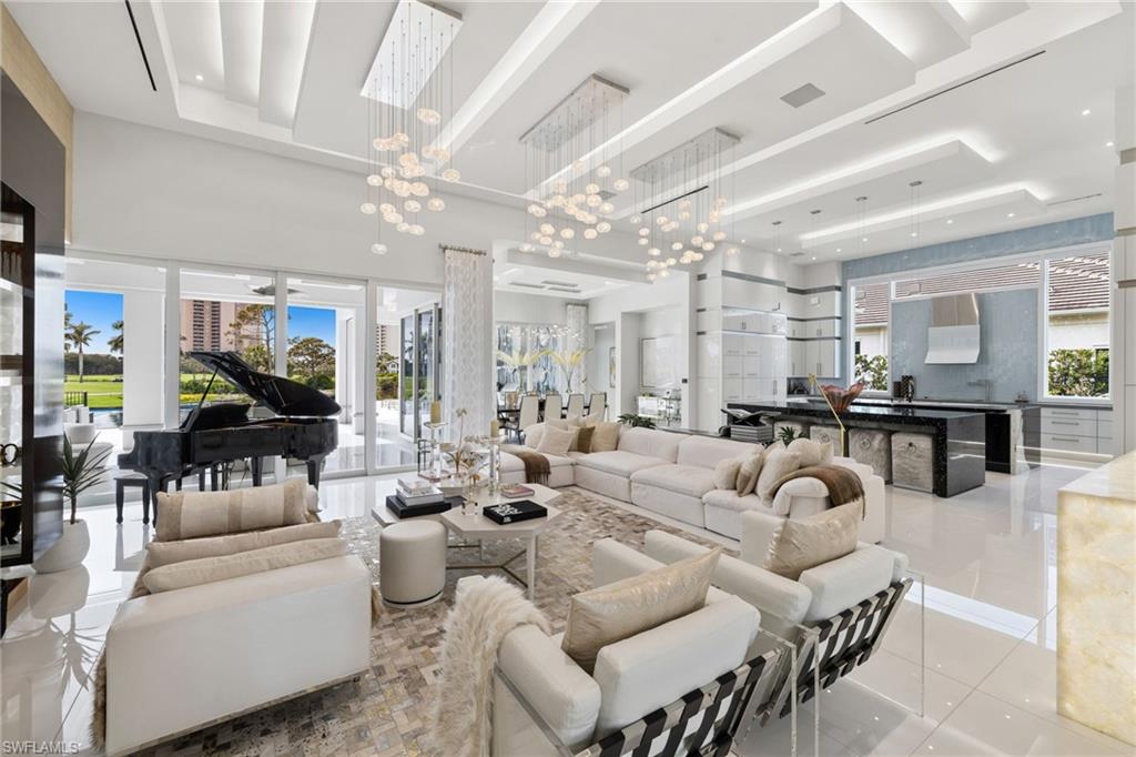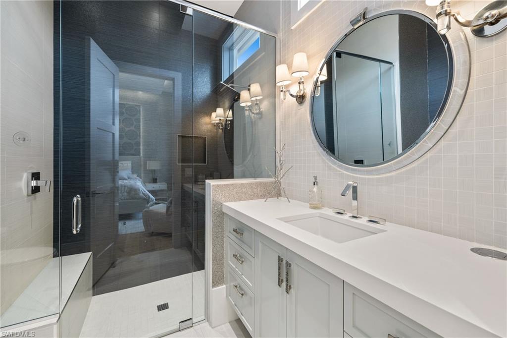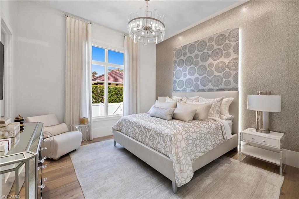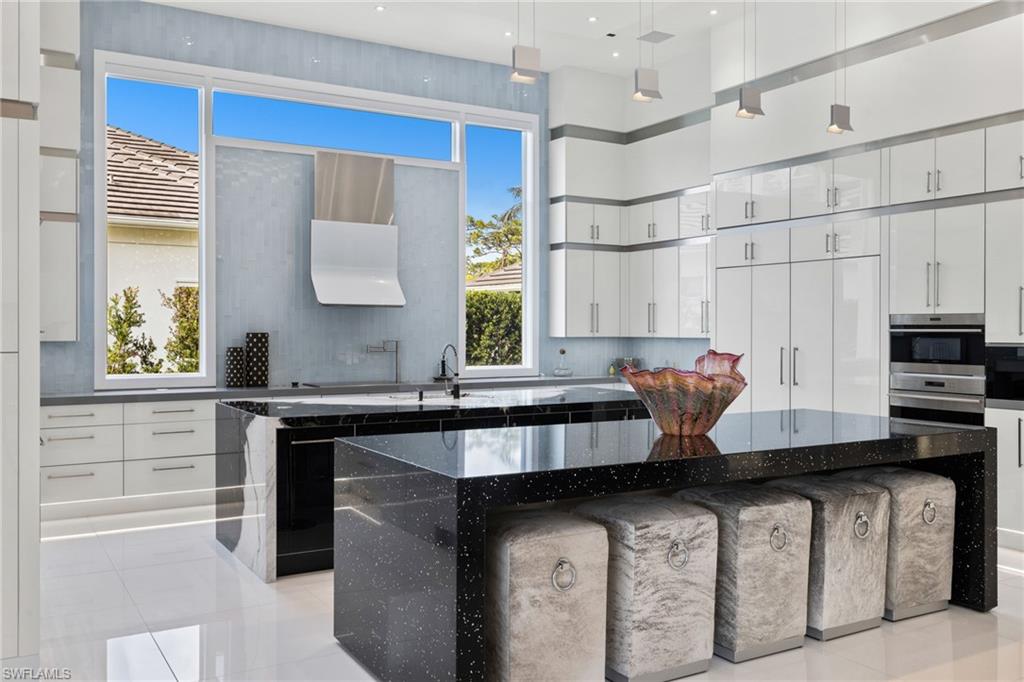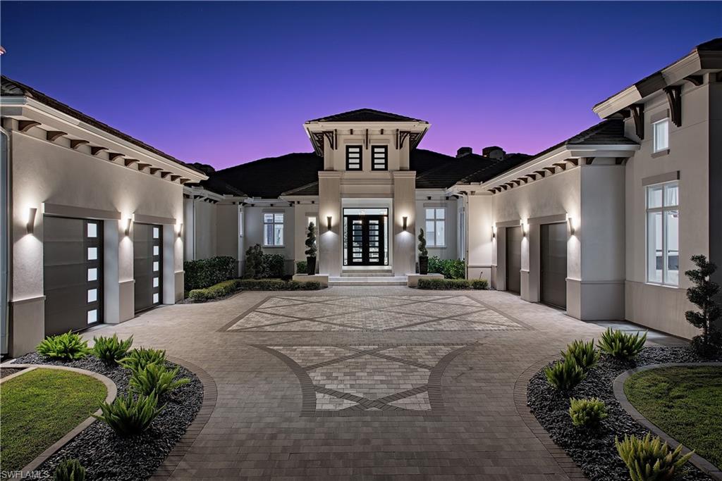 Luxury and sophistication are combined with world-class craftsmanship to deliver this award-winning STOCK custom home in the exclusive Bay Woods at Bonita Bay. Thoughtfully designed by New Architectura in collaboration with Wilfredo Emanuel Designs and Clive Daniel, this Cosmopolitan Chic home was the winner of the prestigious Sand Dollar Award and boasts a nearly $1,000,000 interior design package. Situated on a premium lot with unobstructed lake and golf course views, this home boasts 4 bedrooms, 6 bathrooms, bonus room, and an oversized 4-car garage with room for 5 plus cars. As you enter through the grand contemporary steel doors, you are immediately struck by the dramatic geometric ceiling details, white glass tile flooring, suspended lighting, illuminated quartz wine bar and glass-enclosed wine room. The Cosmopolitan theme is carried into the kitchen, featuring glass-faced cabinetry, quartz and semi-precious stone islands with waterfall, Wolf and SubZero built-in paneled appliances, Miele coffee machine, a walk-in pantry and more. The massive primary suite is nothing short of breathtaking. From its white oak flooring to the oversized seating area, dual walk-in closets, mirrored wall panels, textured wallpaper and built-in headboard with custom lighting. As you enter the primary bathroom, you will find two separate water closets, a free-standing tub, oversized shower with multiple heads, gorgeous tile and textured accent walls. Boasting more than 3,000SF of space, the outdoor area is a true focal point of the home and features countless upgrades such as electric shutters and screens, bug mist system, gas fireplace and separate fire pit area, massive outdoor kitchen with waterfall quartz counters, geometric ceiling details, white marble pavers, and pool bathroom. Enjoy the sunset views over the infinity edge gas-heated pool and spa. Continuing throughout the home, you will find that every guest bedroom is ensuite and features white oak flooring, walk-in custom closets and each has its own unique design cues such as custom draperies, wallpapers, ceiling and wall details. Showcased by a floor-to-ceiling glass entry, the opulent billiards/bonus room is sure to impress with its custom leather-padded wall and illuminated stone accents. The full-home Control4 smart system provides automated electric blinds throughout, smart lighting switches, indoor and outdoor built-in speakers, security system and more. Bonita Bay offers an array of outstanding amenities and optional memberships, from a private beach club to a full-service marina and multiple dining options. Experience premier golfing with five recently renovated Arthur Hills and Tom Fazio championship courses and three expansive practice facilities. Enjoy miles of scenic walking and biking trails, kayaking, canoeing, boat launch, state-of-the-art fitness center, an 18-court tennis and pickleball complex, numerous community parks and more.