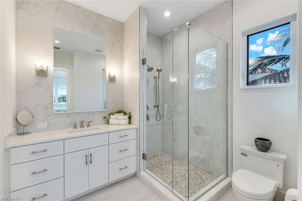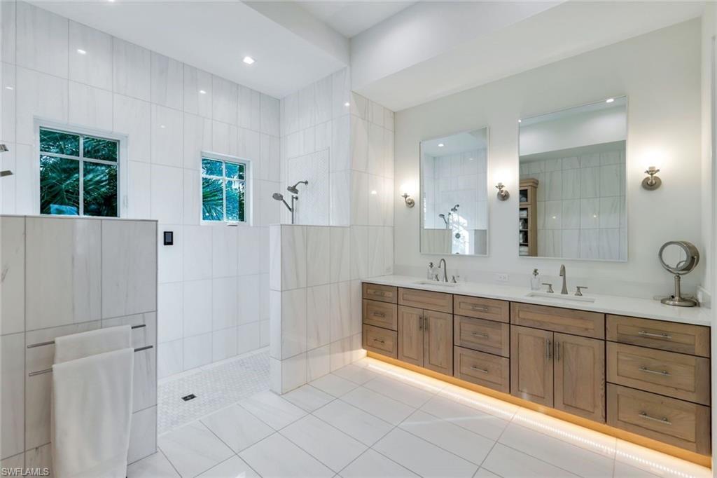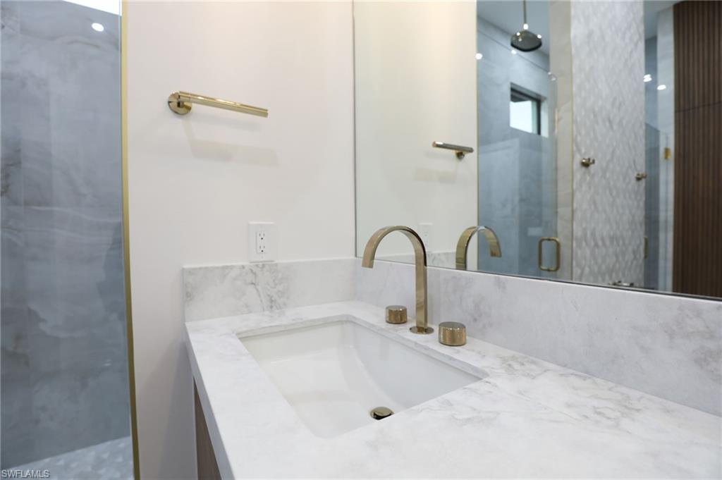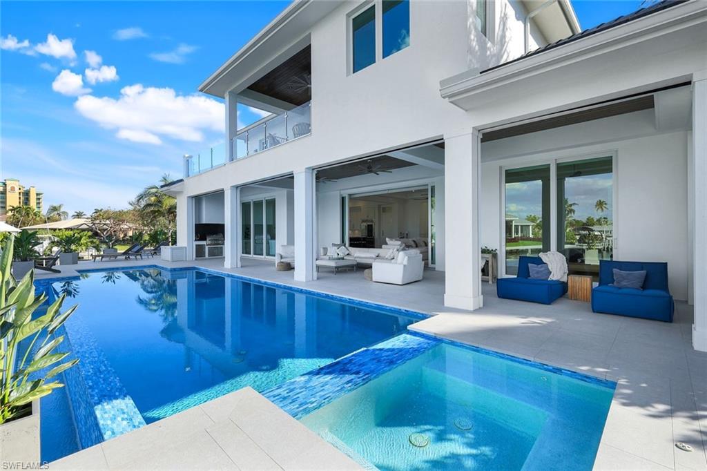 Delight in this exquisite waterfront estate in historic Old Marco Village, built in 2023 by Braun Builders. Set on .32 acres toward the end of a private cul-de-sac, this 5-bedroom, 4.5-bath designer home offers 160 feet of waterfront, an expansive dock, and direct Gulf access. Striking glass entry doors reveal a grand two-story foyer with wide water views, while wide-plank wood flooring and a modern bridge enhance the open-concept living spaces. Thoughtfully designed, this home showcases the finest fixtures, finishes and custom tile work, enhancing its luxury and sophistication. The chef's kitchen boasts a dramatic center island, Wolf gas range, pot filler, 2 Sub Zero refrigerators, double dishwashers, hidden butler's pantry (keeping the kitchen pristine), custom cabinetry and a garage-to-pantry grocery hatch. Retreat to your opulent primary suite showcasing serene water views, elegant, coffered ceilings, and a spa-inspired all marble bath with custom lighting and mirrors; featuring a soaking tub, expansive dual shower, dual vanities, and bespoke his-and-hers closets. A private study with library shelving and sliding ladder overlooks the dock. Upstairs, a loft-style Great Room with a coffee bar and wine fridge offers a retreat for entertainment. Guests and family will appreciate the second primary ensuite and a charming bunk room that share a sprawling waterfront lanai with breathtaking water views, while the guest room and fitness room, showcase private lanais. All furnishings included except Primary bedroom. The fenced rear yard is an entertainer's paradise, with a 93-foot pool deck, infinity-edge pool with shallow beach entry, and spa, plus a 60-ft covered lanai with plenty of space to relax and use the outdoor kitchen with built-in gas grill. The 124-ft dock system includes a boat slip with 16,000lb lift, for up to an 80-ft boat, jet ski lifts on a 7,000lb platform, power, water, and a firepit seating area overlooking Collier Bay for serene waterfront evenings. Impact windows and doors, remote blinds for light control, and automatic screens and hurricane shutters provide effortless comfort and storm readiness at the touch of a button. Enjoy the 3-car garage with 8,000lb lift, 22KW-200amp whole house generator and French drain system that ensure function and luxury in one of Marco Island's most coveted settings. This home epitomizes refined coastal elegance at its finest.