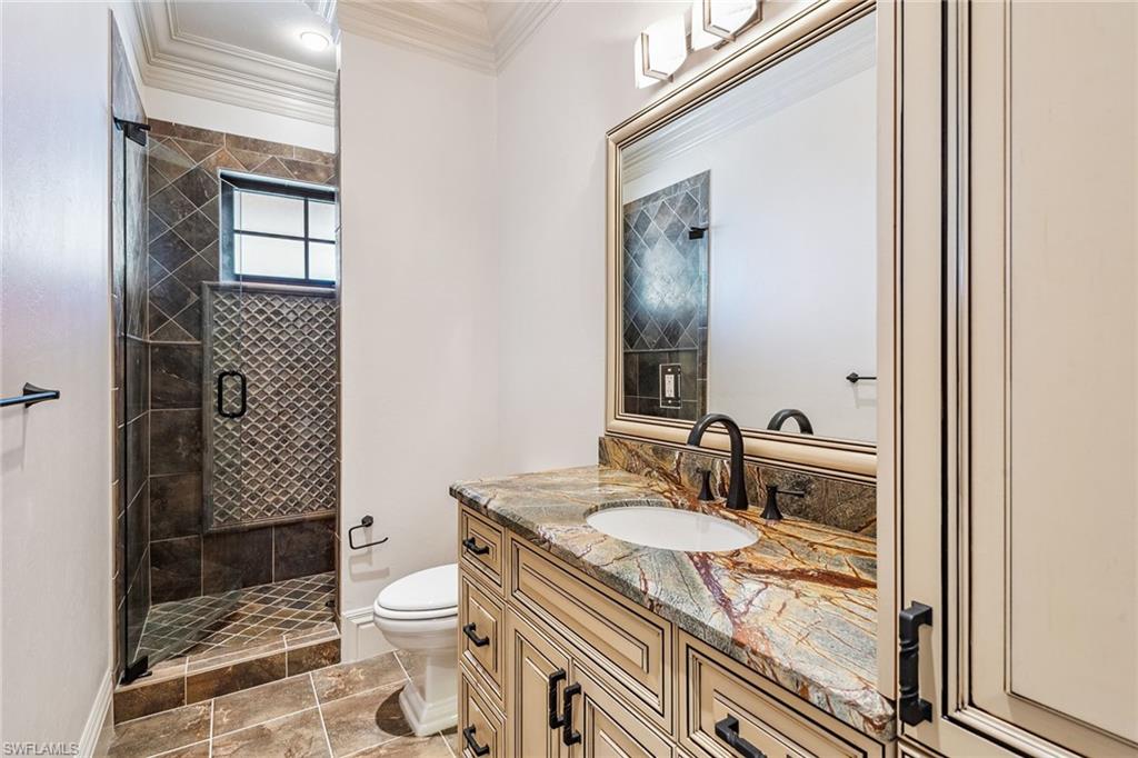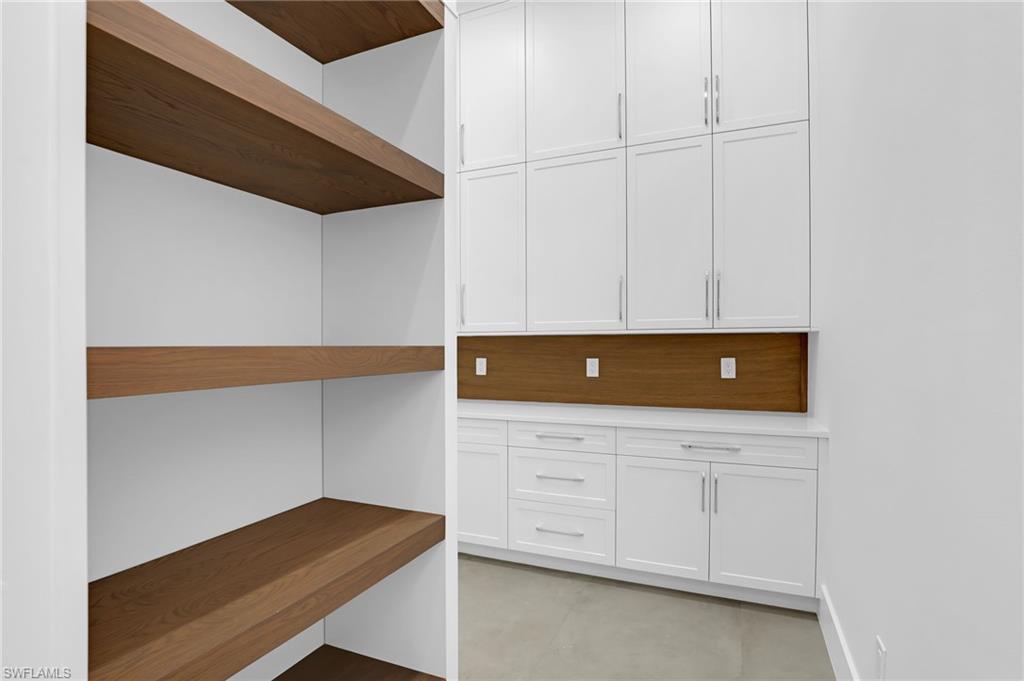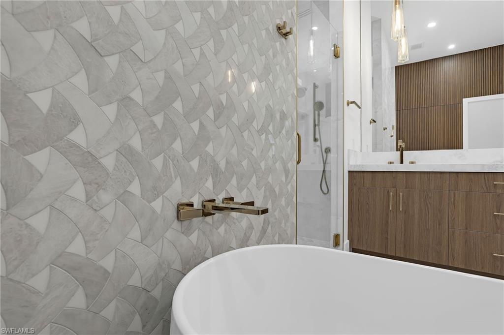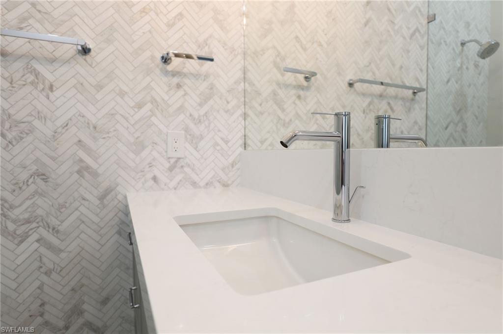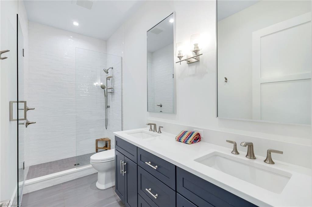 Delight in this exquisite waterfront estate in historic Old Marco Village, built in 2023 by Braun Builders. Set on .32 acres toward the end of a private cul-de-sac, this 5-bedroom, 4.5-bath designer home offers 160 feet of waterfront, an expansive dock, and direct Gulf access. Striking glass entry doors reveal a grand two-story foyer with wide water views, while wide-plank wood flooring and a modern bridge enhance the open-concept living spaces. Thoughtfully designed, this home showcases the finest fixtures, finishes and custom tile work, enhancing its luxury and sophistication. The chef's kitchen boasts a dramatic center island, Wolf gas range, pot filler, 2 Sub Zero refrigerators, double dishwashers, hidden butler's pantry (keeping the kitchen pristine), custom cabinetry and a garage-to-pantry grocery hatch. Retreat to your opulent primary suite showcasing serene water views, elegant, coffered ceilings, and a spa-inspired all marble bath with custom lighting and mirrors; featuring a soaking tub, expansive dual shower, dual vanities, and bespoke his-and-hers closets. A private study with library shelving and sliding ladder overlooks the dock. Upstairs, a loft-style Great Room with a coffee bar and wine fridge offers a retreat for entertainment. Guests and family will appreciate the second primary ensuite and a charming bunk room that share a sprawling waterfront lanai with breathtaking water views, while the guest room and fitness room, showcase private lanais. All furnishings included except Primary bedroom. The fenced rear yard is an entertainer's paradise, with a 93-foot pool deck, infinity-edge pool with shallow beach entry, and spa, plus a 60-ft covered lanai with plenty of space to relax and use the outdoor kitchen with built-in gas grill. The 124-ft dock system includes a boat slip with 16,000lb lift, for up to an 80-ft boat, jet ski lifts on a 7,000lb platform, power, water, and a firepit seating area overlooking Collier Bay for serene waterfront evenings. Impact windows and doors, remote blinds for light control, and automatic screens and hurricane shutters provide effortless comfort and storm readiness at the touch of a button. Enjoy the 3-car garage with 8,000lb lift, 22KW-200amp whole house generator and French drain system that ensure function and luxury in one of Marco Island's most coveted settings. This home epitomizes refined coastal elegance at its finest.
