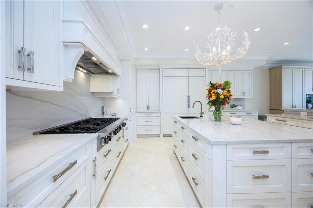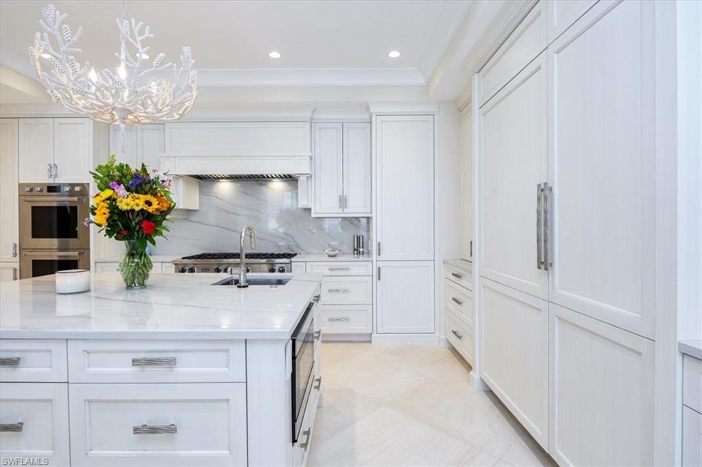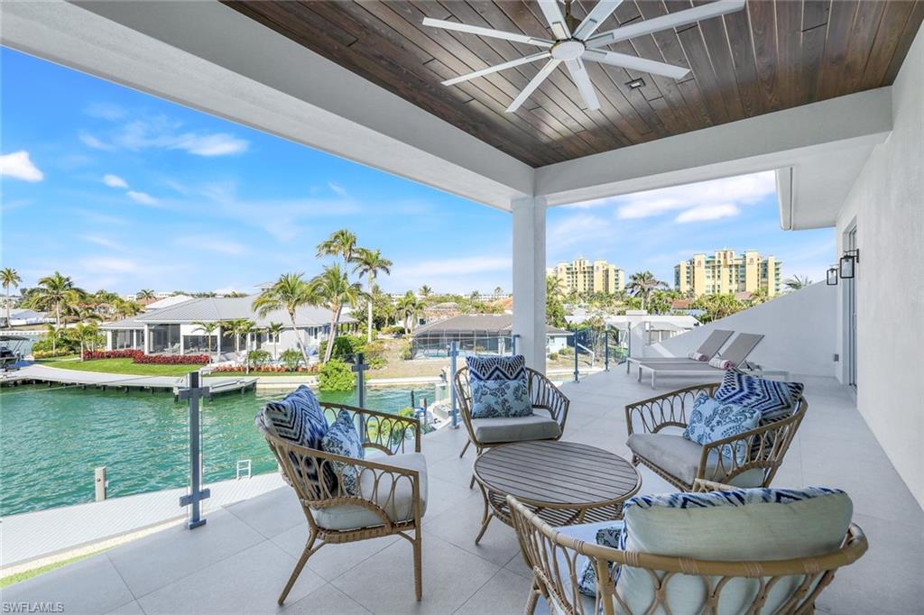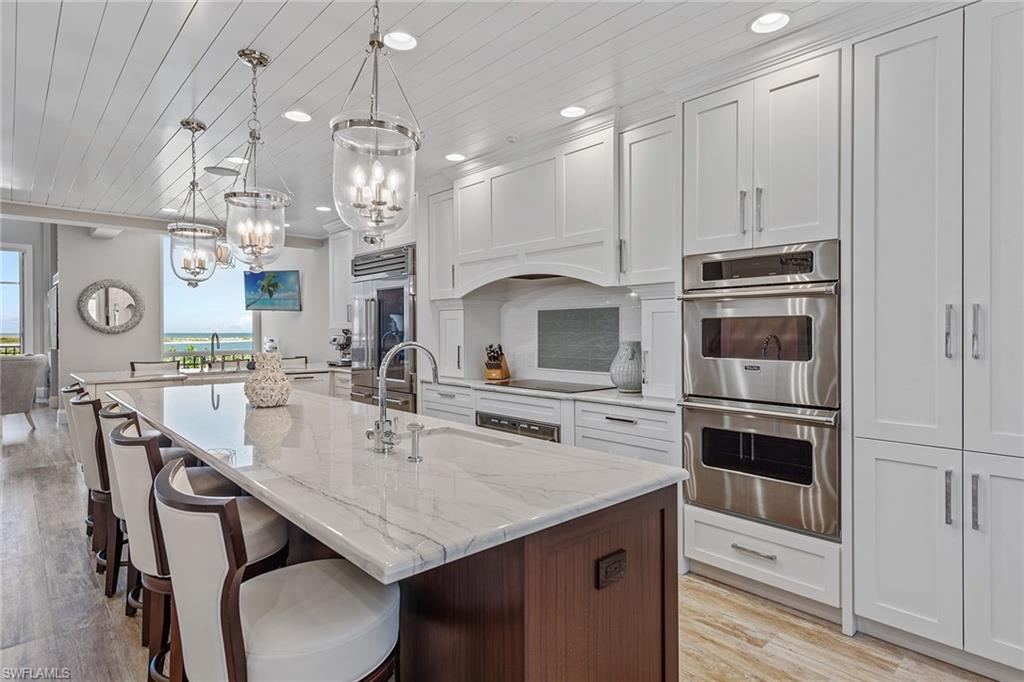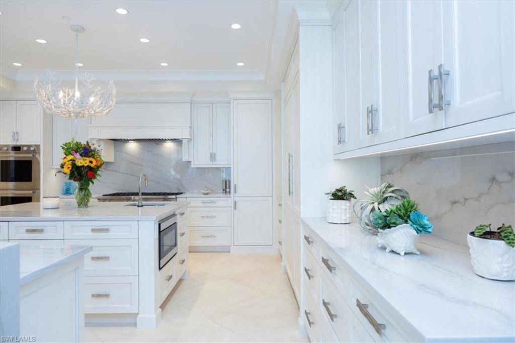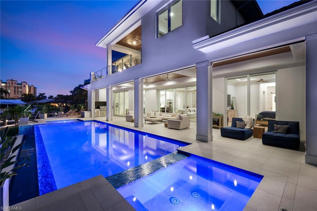 Magnificent, custom built home located on a premier tip lot with desirable southwestern exposure features high-end finishes throughout. This stunning home offers 4 bedrooms plus den, 5 baths, and a climate controlled 3 car garage. Upon entering, you are immediately greeted by the dramatic 2 story foyer, custom Amish finished oak wall detail, staircase with contemporary glass and oak railing, and gorgeous wide water views. The great room features soaring ceilings, custom built-ins, and gas fireplace surrounded by stunning Taj Mahal quartzite. The great room flows seamlessly into the kitchen with stunning Taj Mahal quartzite counters, large island with waterfall edge finish, gorgeous custom cabinetry, gas Wolf Cooktop, and Sub Zero freezer and refrigerator. Chef’s will delight in thoughtful details such as the wall mounted pot filler and quartzite backsplash ledge for convenient storage. The adjacent catering kitchen offers additional storage, beverage coolers, built-in wall oven and microwave, and a second dishwasher. Don’t miss the convenient grocery cubby, transfer your groceries and other packages from the garage to the kitchen with ease. The dining room is surrounded by sliding glass doors allowing for unobstructed water views. The first floor master suite is a private oasis with 2 custom walk-in closets and spa-like ensuite bath featuring dual vanities, lighted mirrors, soaking tub, and walk-in shower. The second floor offers a family room with wet bar, 3 guest bedrooms each with ensuite baths, and terrace offering the most beautiful views of the beach skyline. Enjoy luxurious features throughout the home including white oak flooring, Hunter Douglas shades, Restoration Hardware light fixtures, elevator, and more. The main living space opens seamlessly to the spacious lanai through the pocket sliding doors. The outdoor space is just as elegant as the interior of the home. Enjoy a summer kitchen, covered and opened seating areas, retractable screens, outdoor shower, and infinity edge pool with sun shelf, bubblers, and integrated spa. This prime homesite features 163’ of waterfrontage with new seawall installed in 2022 and wide, converging waterway views. Delight in the beautiful Florida sunsets from the privacy of your own home and the twinkling lights of the iconic Marco beach skyline at night. Enjoy extra peace of mind with impact windows and doors, convenient electric shutters on the lanai, outdoor cameras, security system, and whole house generator. No detail has been overlooked in the construction of this spectacular waterfront home.