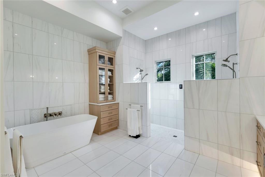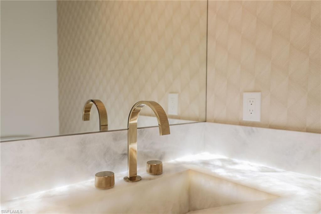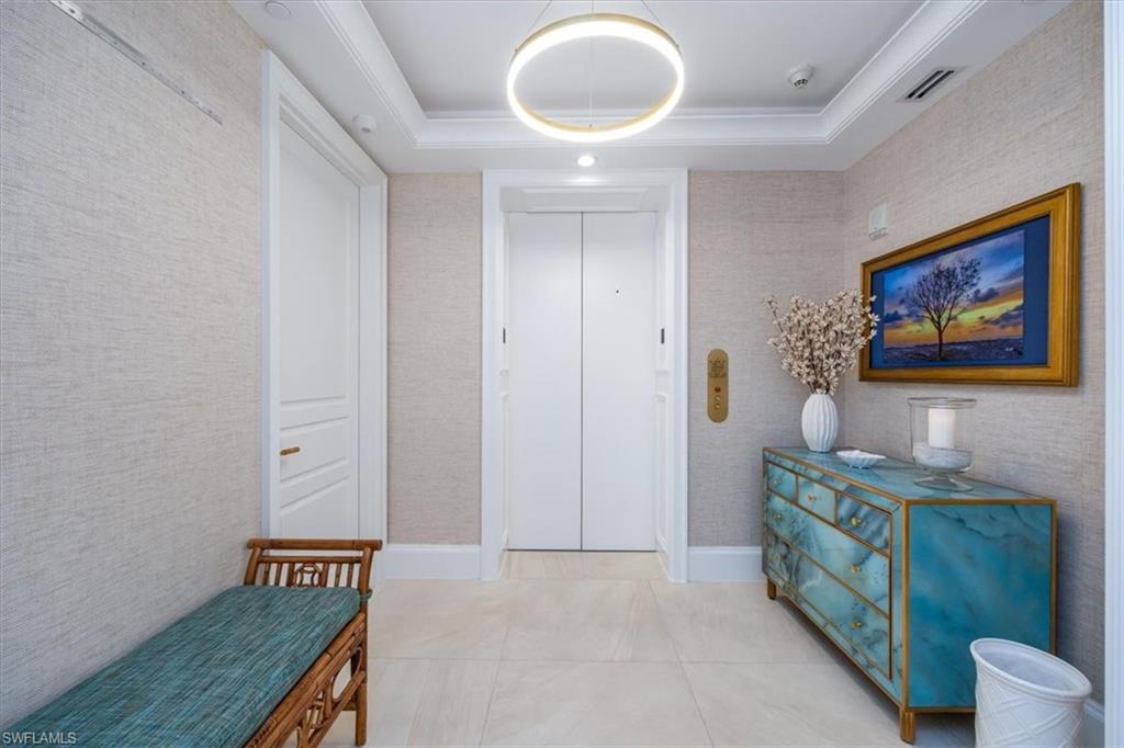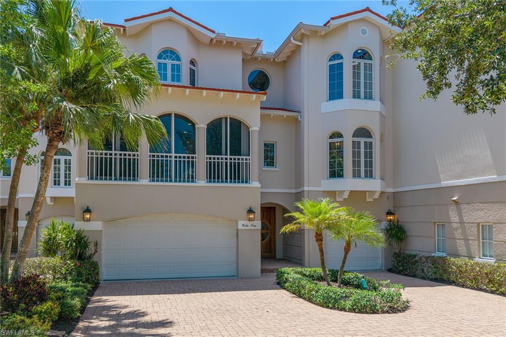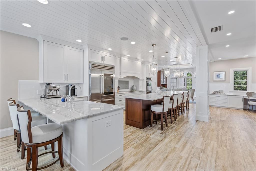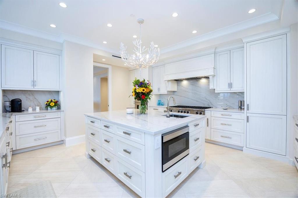 Magnificent, custom built home located on a premier tip lot with desirable southwestern exposure features high-end finishes throughout. This stunning home offers 4 bedrooms plus den, 5 baths, and a climate controlled 3 car garage. Upon entering, you are immediately greeted by the dramatic 2 story foyer, custom Amish finished oak wall detail, staircase with contemporary glass and oak railing, and gorgeous wide water views. The great room features soaring ceilings, custom built-ins, and gas fireplace surrounded by stunning Taj Mahal quartzite. The great room flows seamlessly into the kitchen with stunning Taj Mahal quartzite counters, large island with waterfall edge finish, gorgeous custom cabinetry, gas Wolf Cooktop, and Sub Zero freezer and refrigerator. Chef’s will delight in thoughtful details such as the wall mounted pot filler and quartzite backsplash ledge for convenient storage. The adjacent catering kitchen offers additional storage, beverage coolers, built-in wall oven and microwave, and a second dishwasher. Don’t miss the convenient grocery cubby, transfer your groceries and other packages from the garage to the kitchen with ease. The dining room is surrounded by sliding glass doors allowing for unobstructed water views. The first floor master suite is a private oasis with 2 custom walk-in closets and spa-like ensuite bath featuring dual vanities, lighted mirrors, soaking tub, and walk-in shower. The second floor offers a family room with wet bar, 3 guest bedrooms each with ensuite baths, and terrace offering the most beautiful views of the beach skyline. Enjoy luxurious features throughout the home including white oak flooring, Hunter Douglas shades, Restoration Hardware light fixtures, elevator, and more. The main living space opens seamlessly to the spacious lanai through the pocket sliding doors. The outdoor space is just as elegant as the interior of the home. Enjoy a summer kitchen, covered and opened seating areas, retractable screens, outdoor shower, and infinity edge pool with sun shelf, bubblers, and integrated spa. This prime homesite features 163’ of waterfrontage with new seawall installed in 2022 and wide, converging waterway views. Delight in the beautiful Florida sunsets from the privacy of your own home and the twinkling lights of the iconic Marco beach skyline at night. Enjoy extra peace of mind with impact windows and doors, convenient electric shutters on the lanai, outdoor cameras, security system, and whole house generator. No detail has been overlooked in the construction of this spectacular waterfront home.